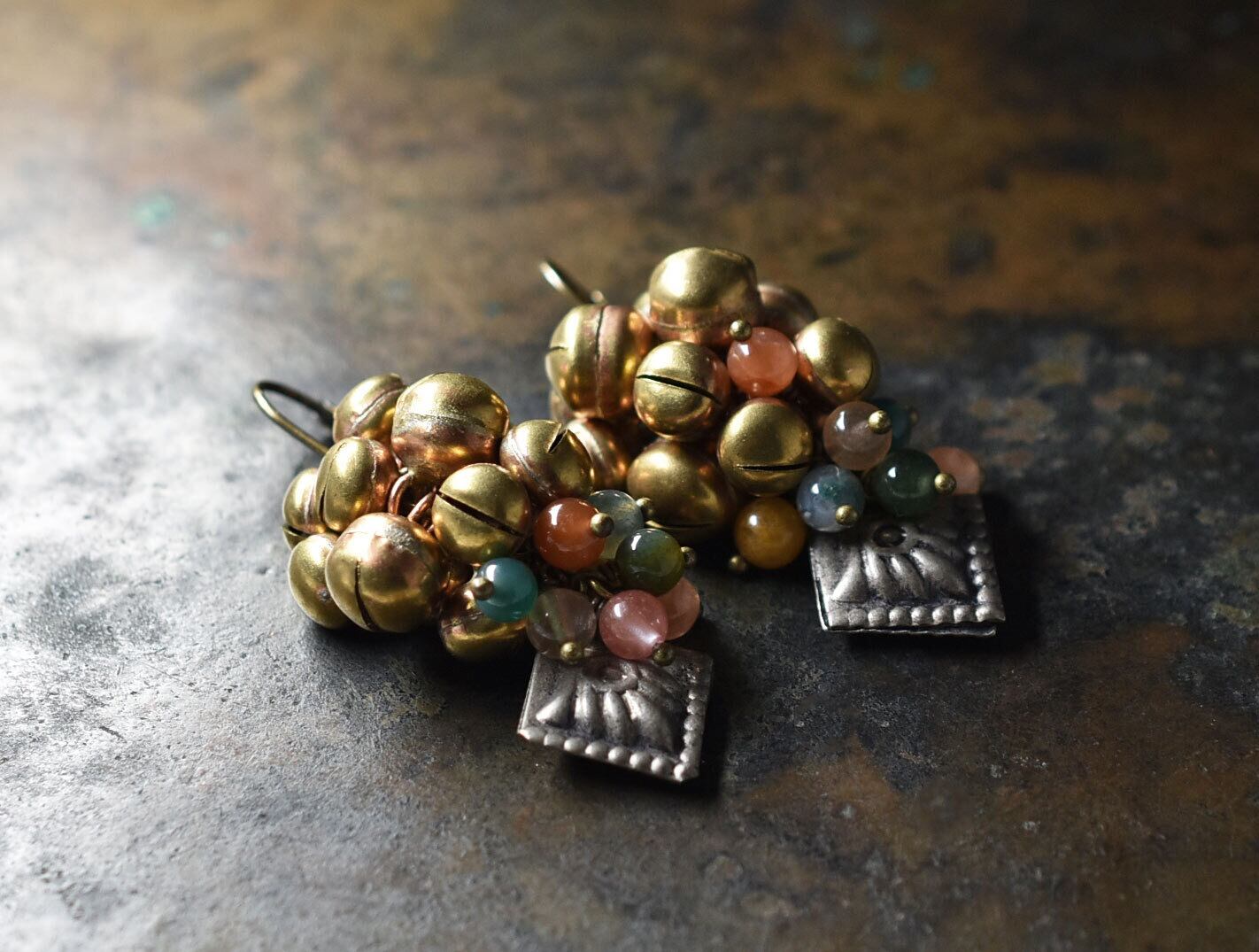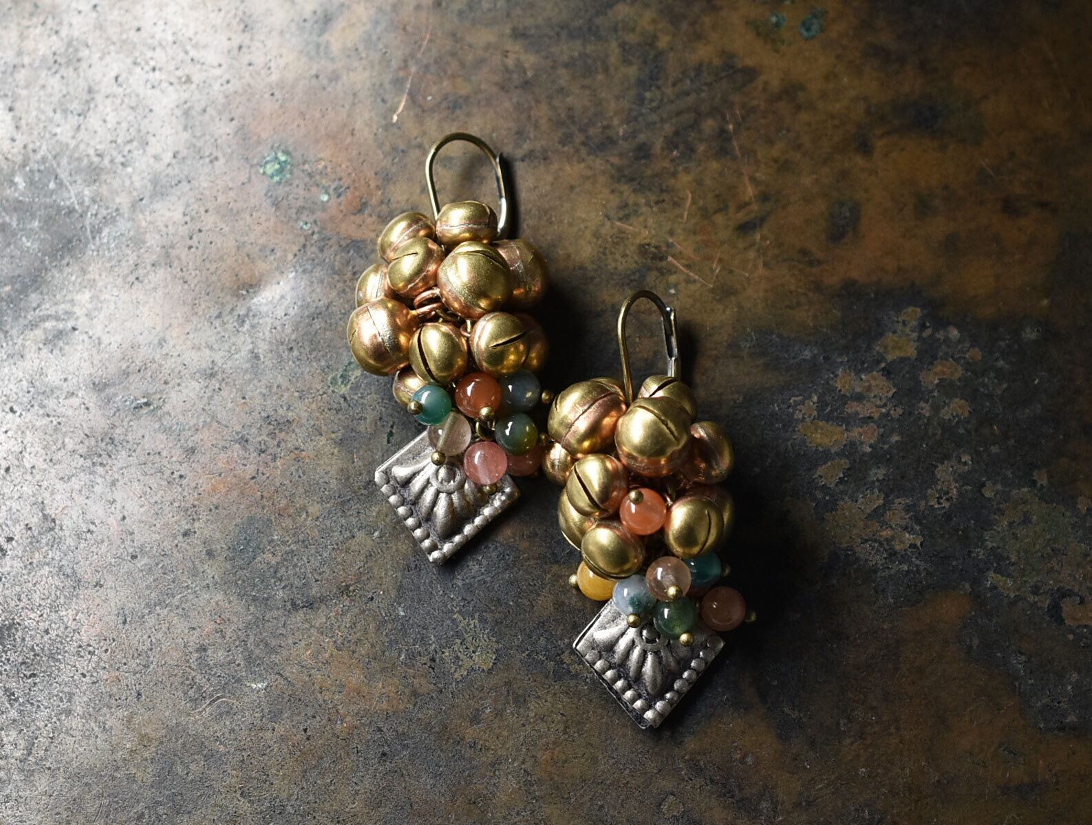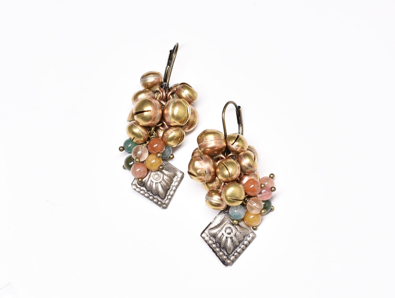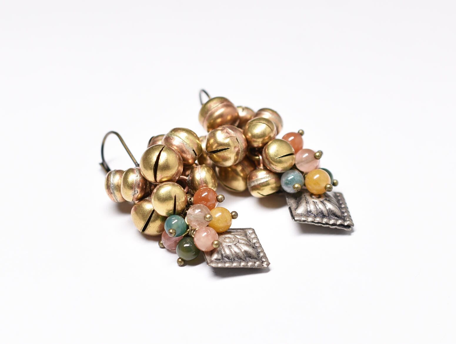 アフガンメタルとポンポンの様に実った鈴、多彩なストーンビーズを繋いだややボリュームのあるピアスです。
