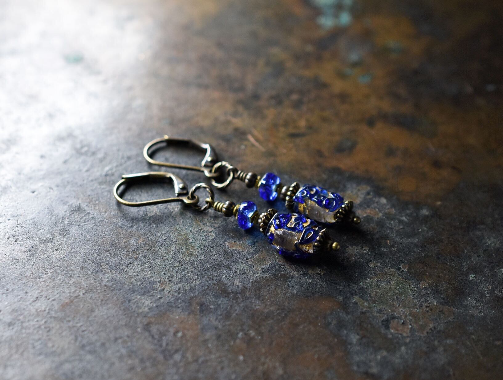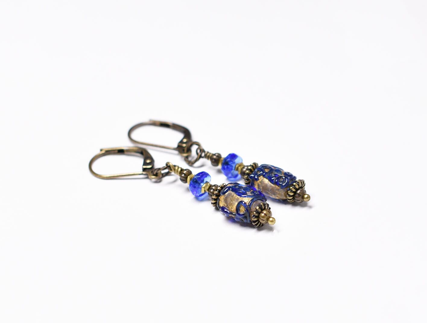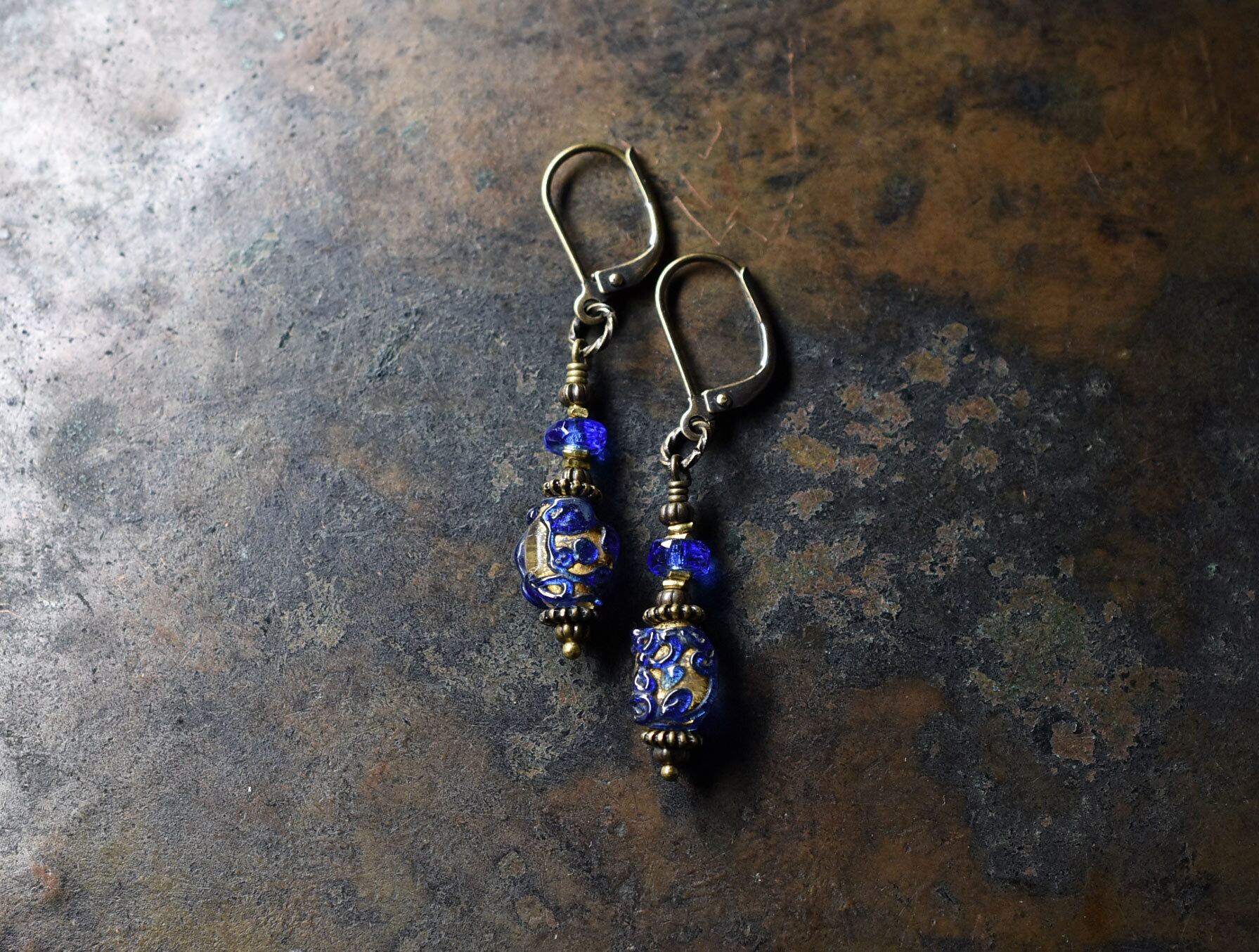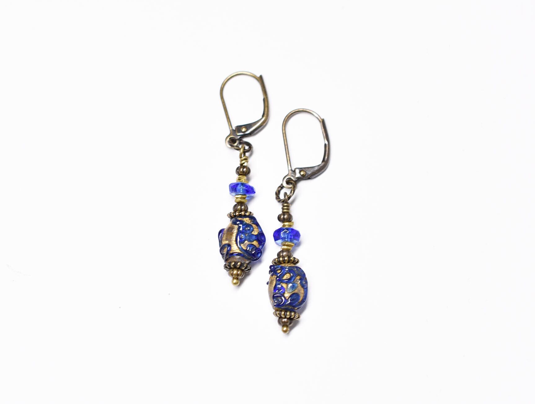 アンティーク瑠璃色トレイルデコレーションの金箔装飾ビーズのピアス