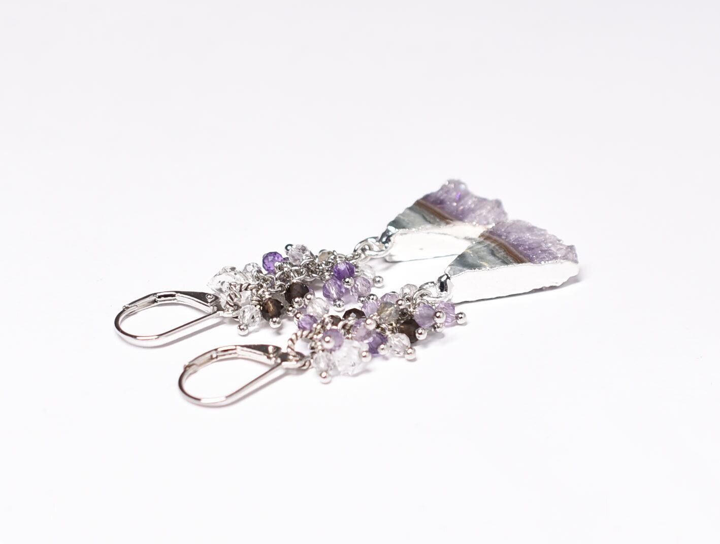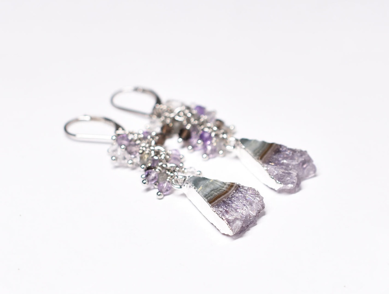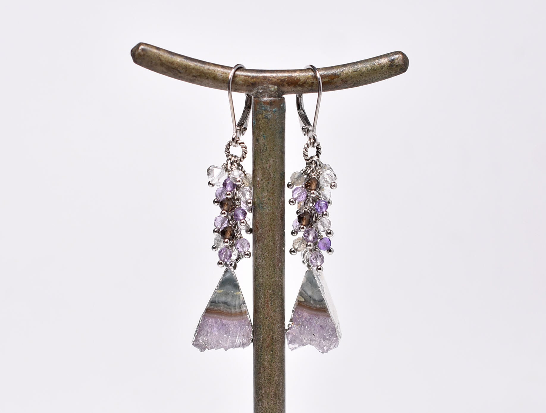 ドゥルジーアメジストとたわわなストーンビーズ、ハーキマーダイヤモンドを繋いだピアスです。
