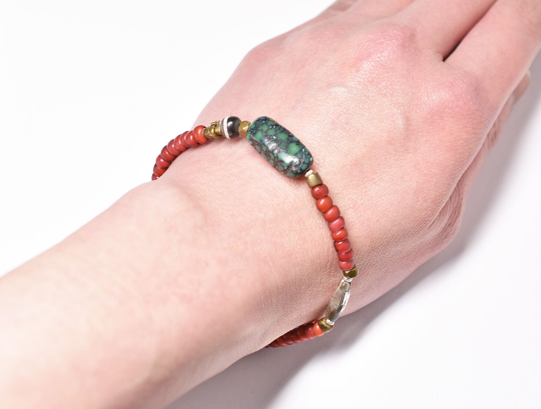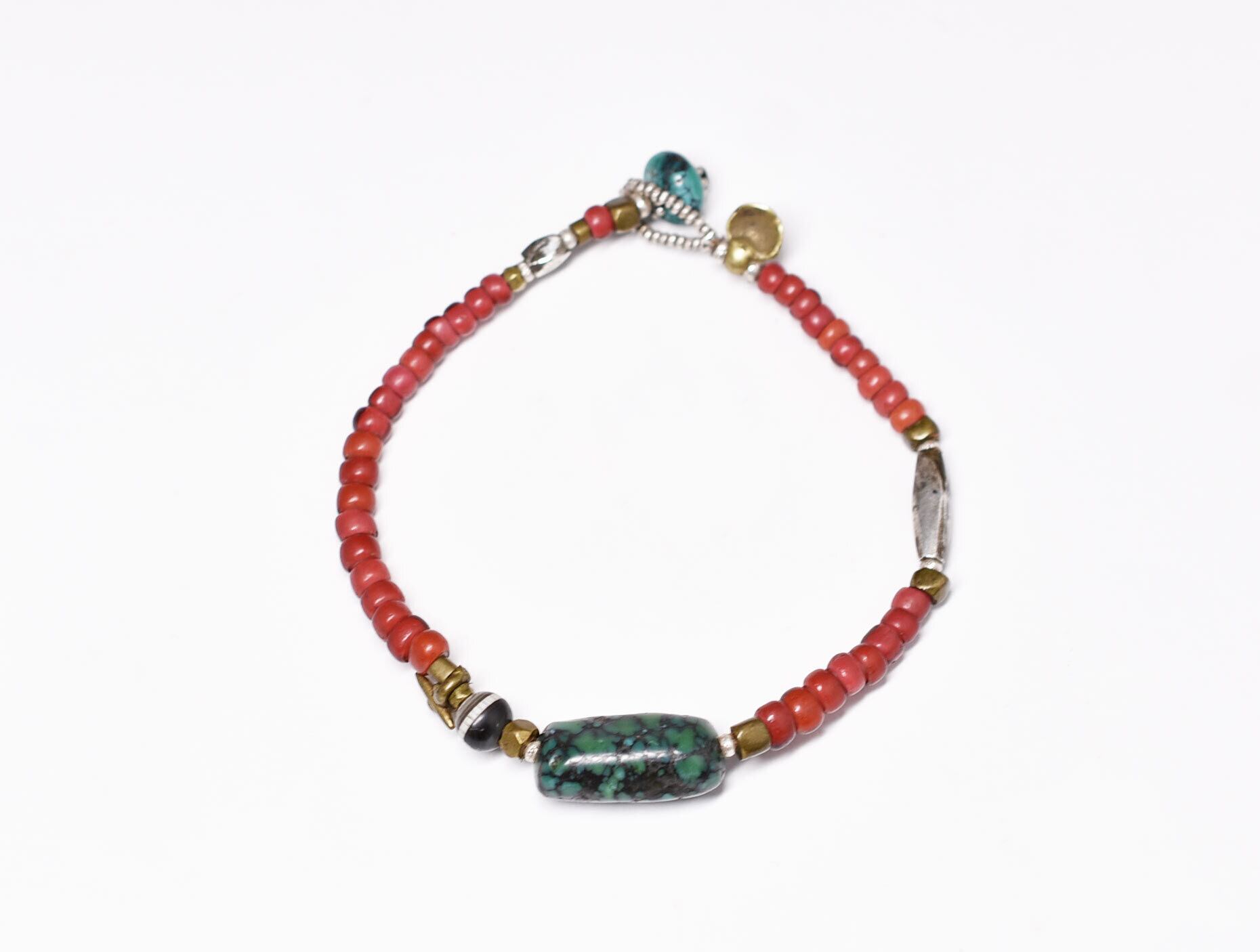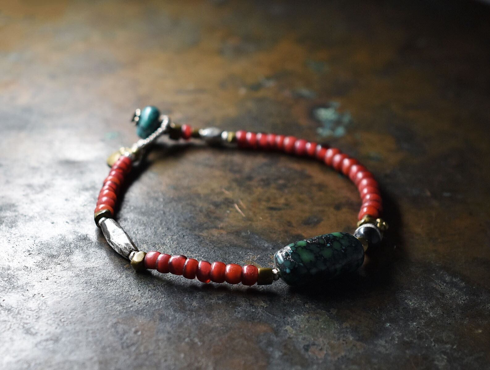 oldチベタンターコイズと古代瑪瑙、oldチンシルバー、金赤ホワイトハーツ、oldオリッサブラスのブレス