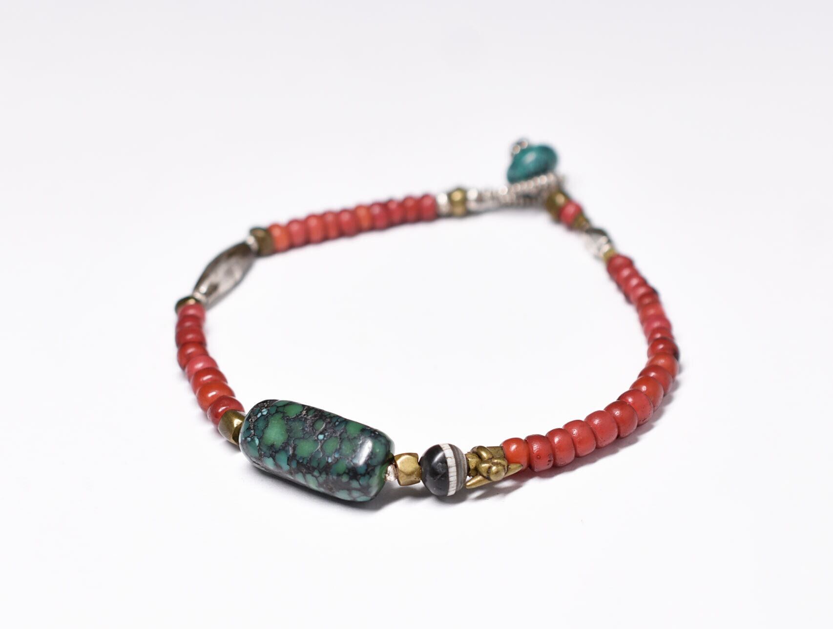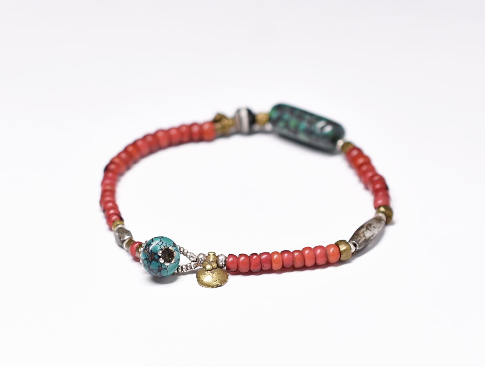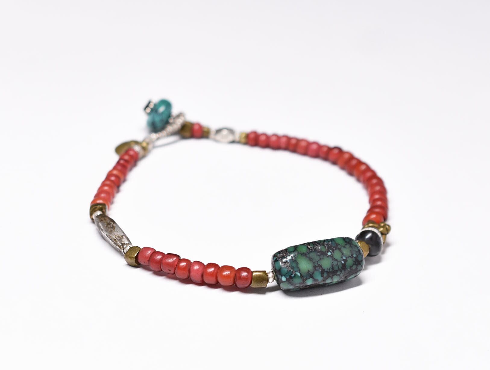 oldチベタンターコイズと古代瑪瑙、oldチンシルバー、金赤ホワイトハーツ、oldオリッサブラスのブレス