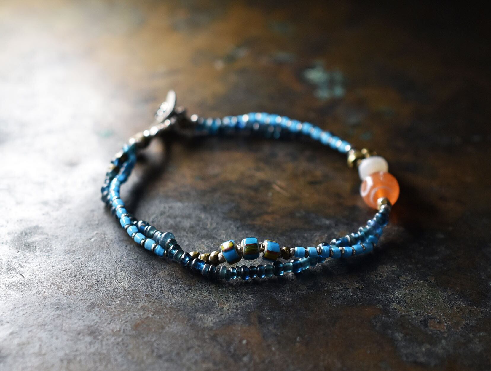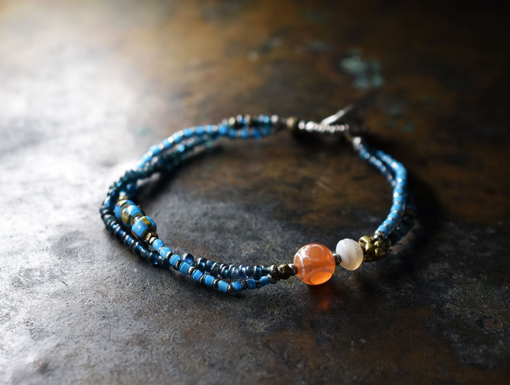 エッチドカーネリアンと古代瑪瑙、ブルーホワイトハーツ、インディゴブルーのアンティークビーズ、カレンシルバー、oldオリッサブラスを繋いだブレスです。