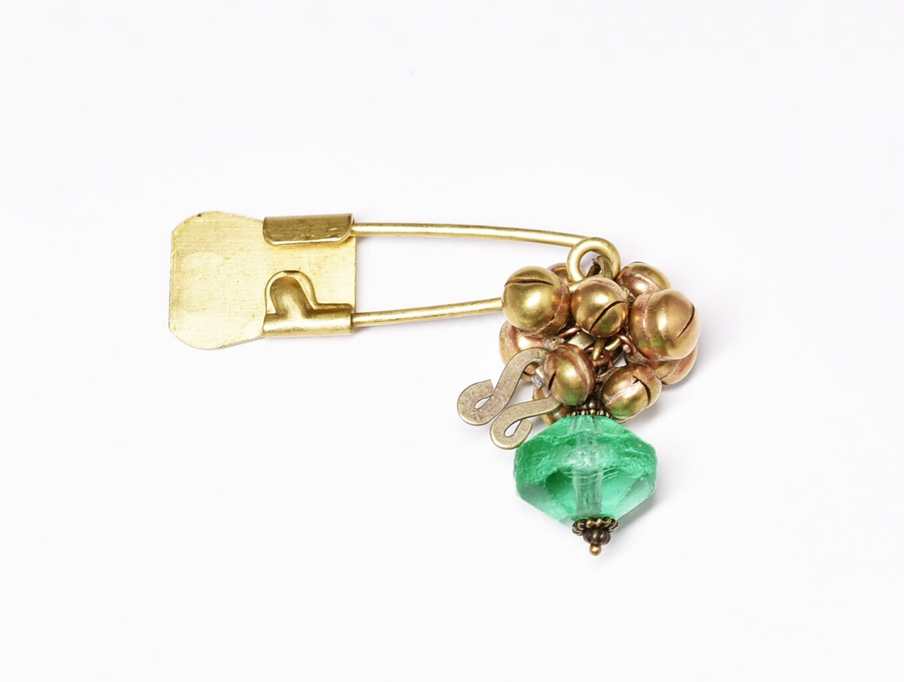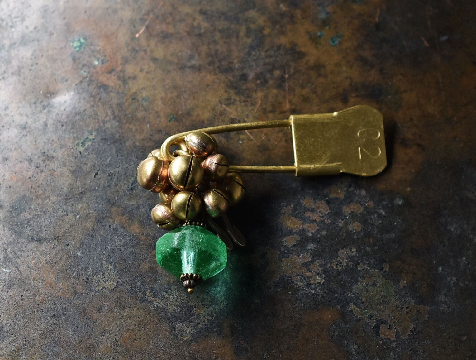 アンティークウランガラス、たわわな鈴、ズアフガニスタンのメタルパーツを繋いだランドリーピンブローチです