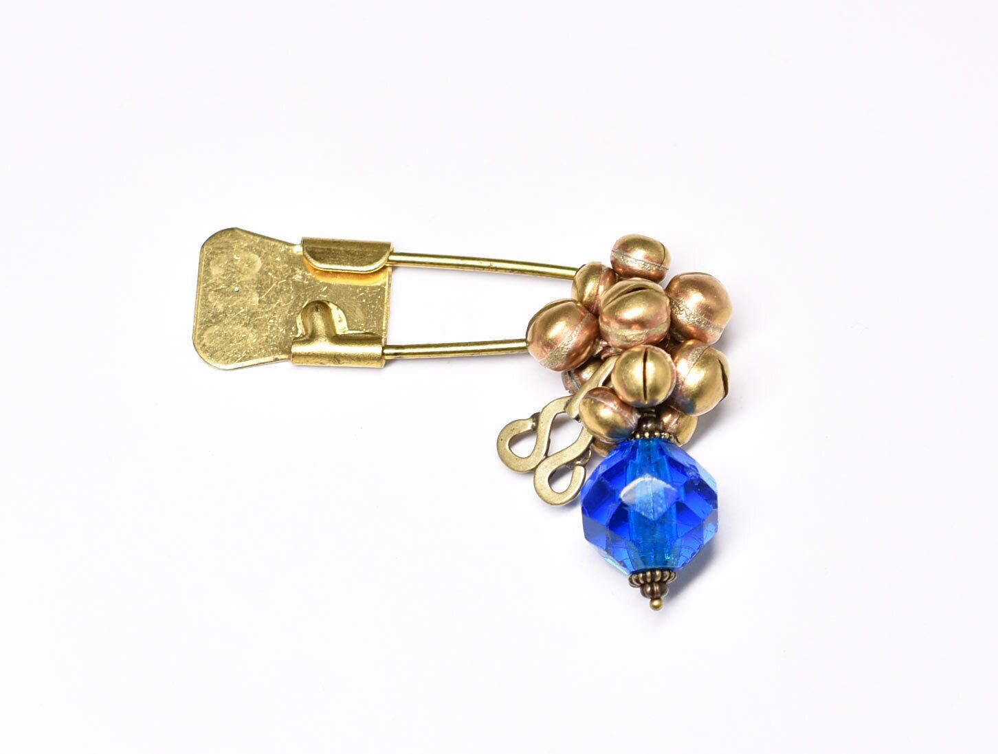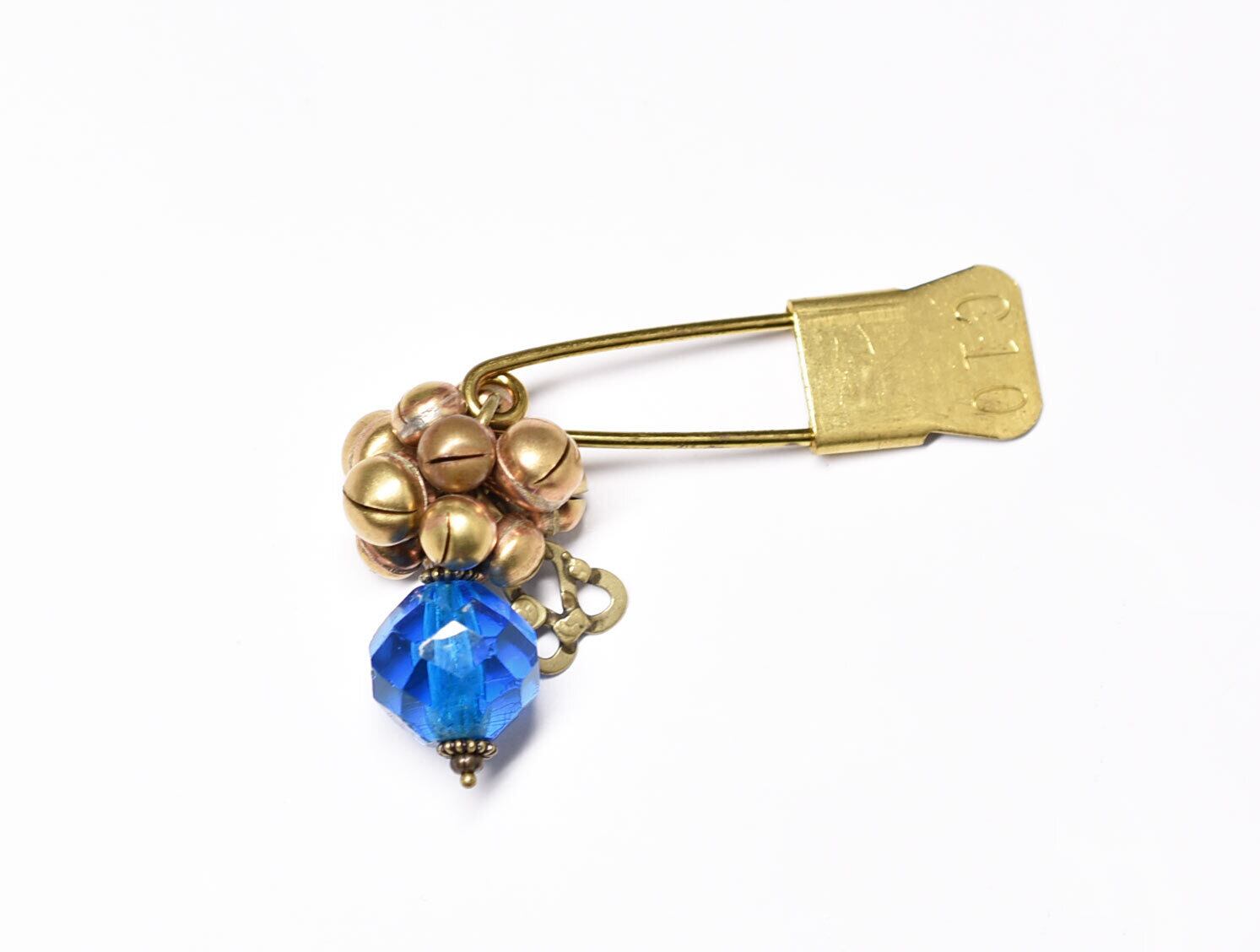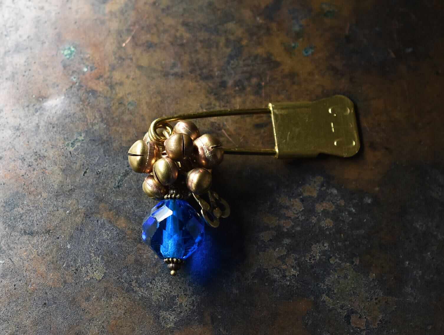 アンティークボヘミアブルーグラス、たわわな鈴、ズアフガニスタンのメタルパーツを繋いだランドリーピンブローチです