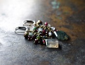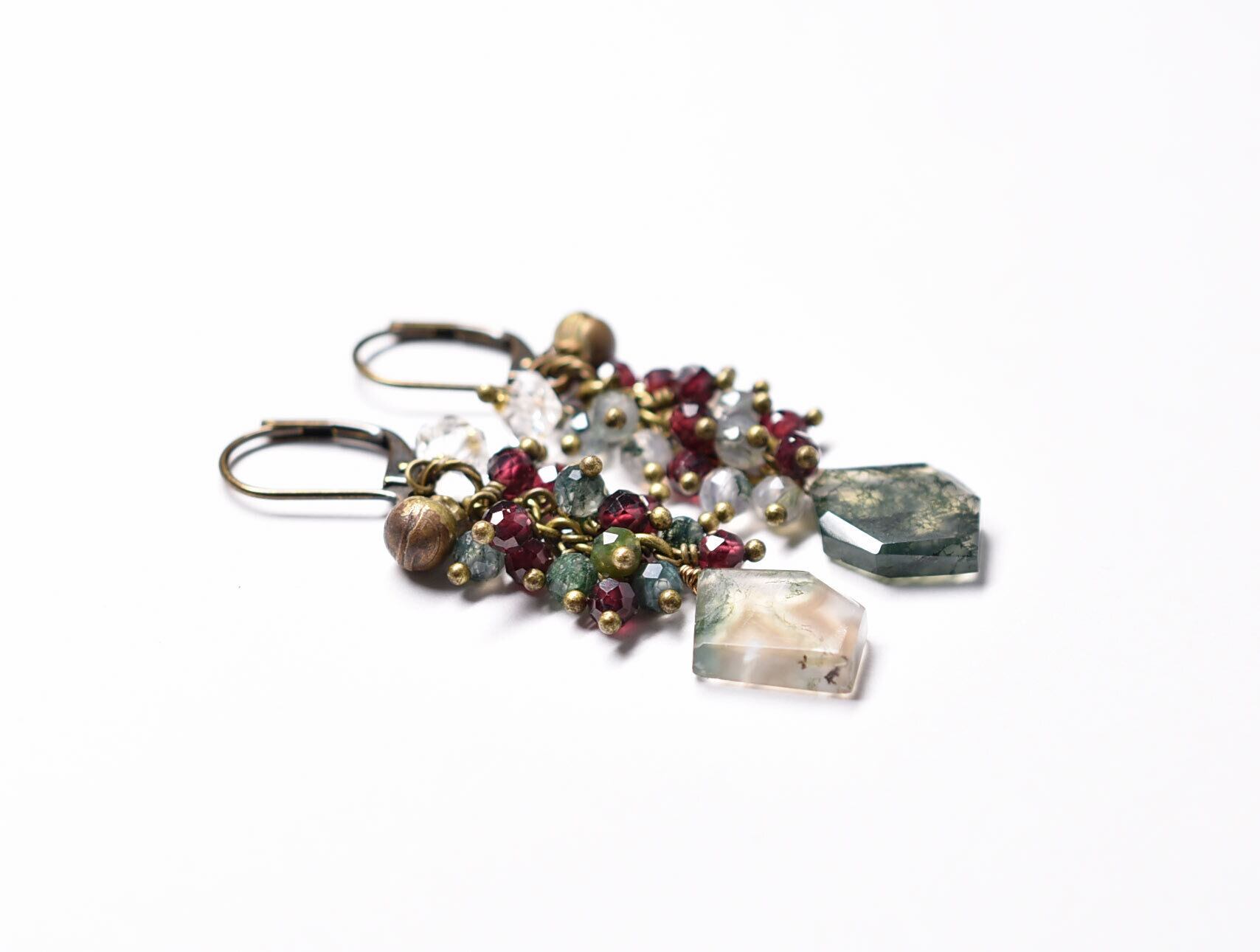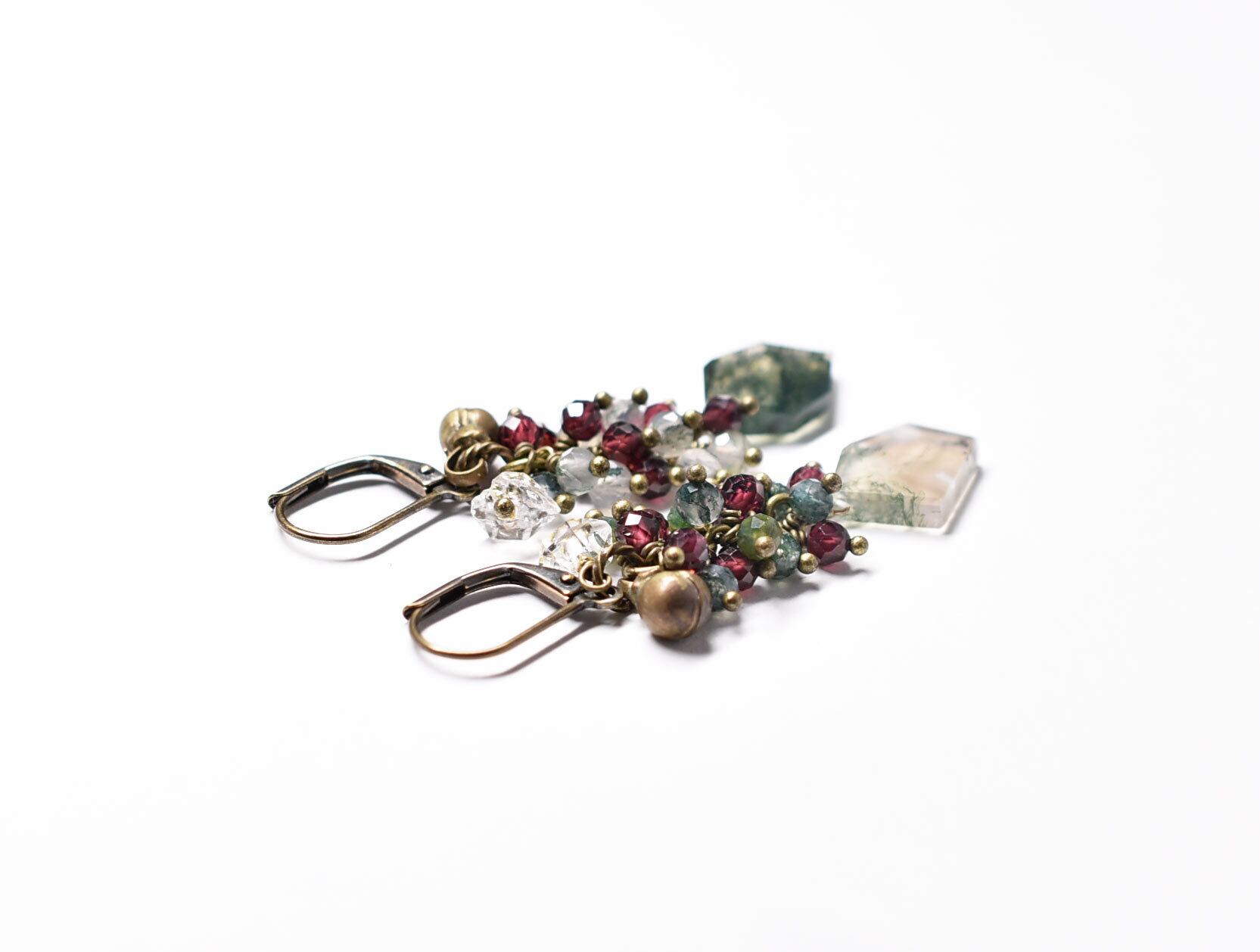 モスアゲートとたわわなガーネット、ハーキマーダイヤモンド、民族鈴を繋いだピアスです。