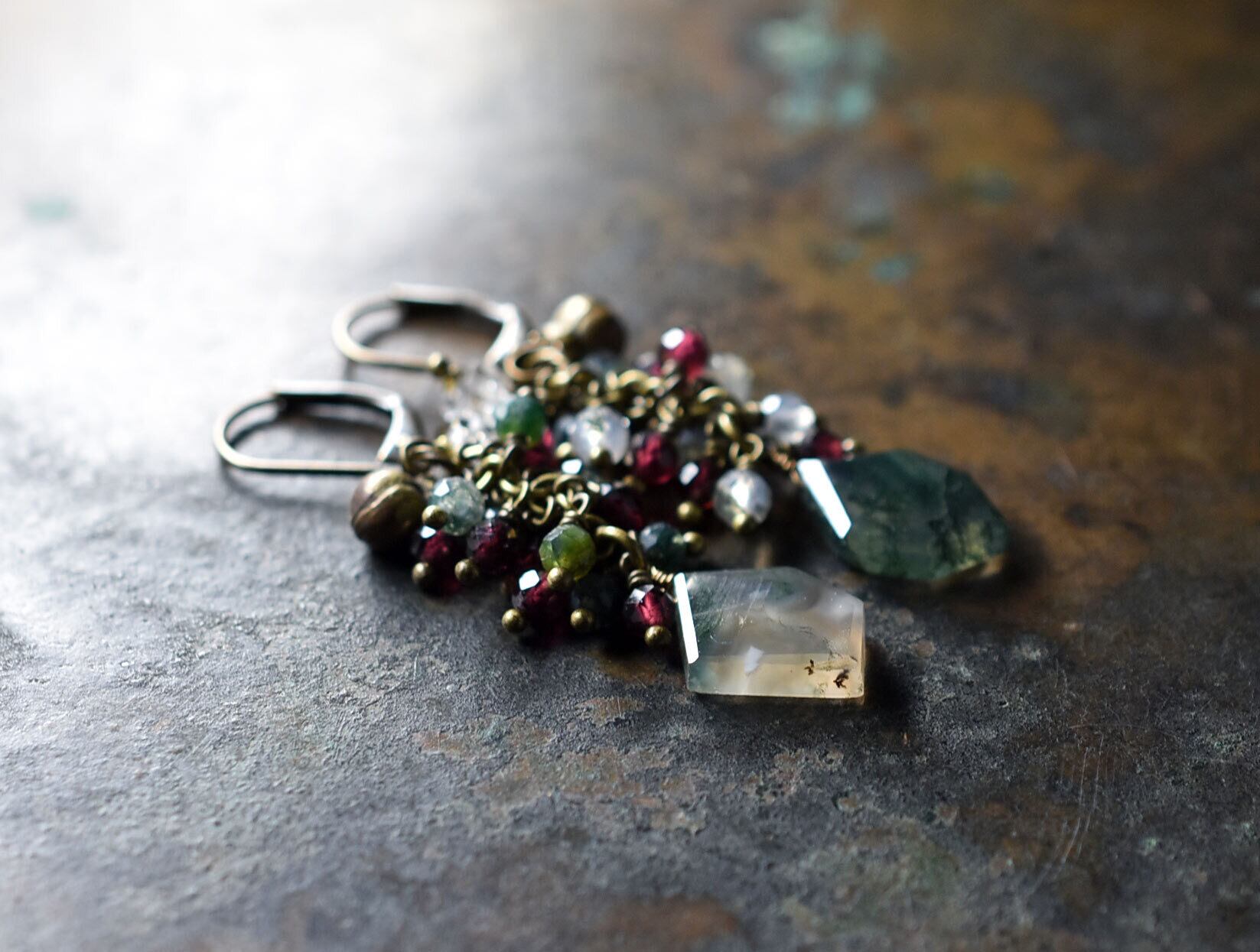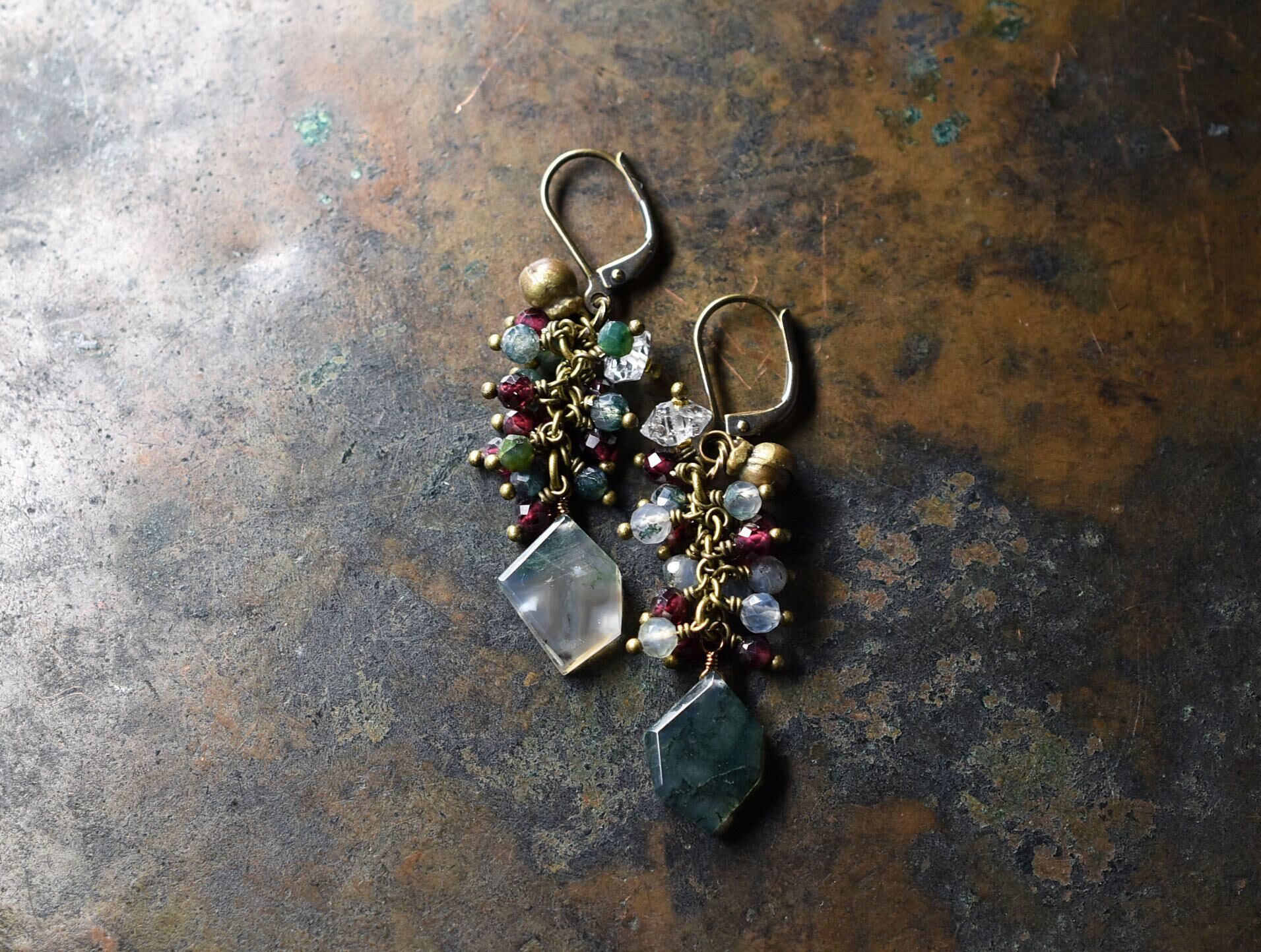 素材:モスアゲート、ガーネット、ハーキマーダイヤモンド、真鍮、ミックスメタル