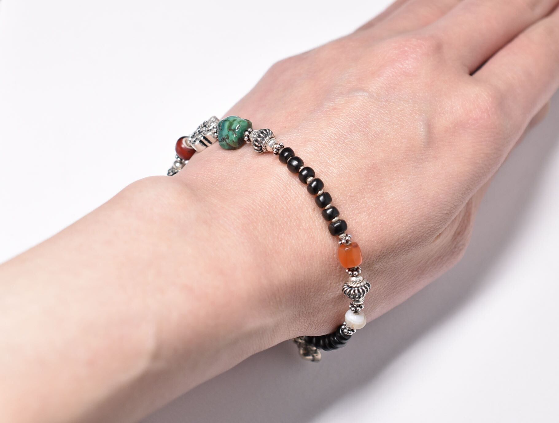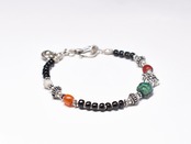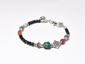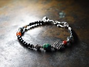 エンドレスノットとoldチベタンターコイズ、金赤ホワイトハーツ、古代瑪瑙、ミゾーラムカーネリアン、漆黒ビーズを繋いだブレスです。
