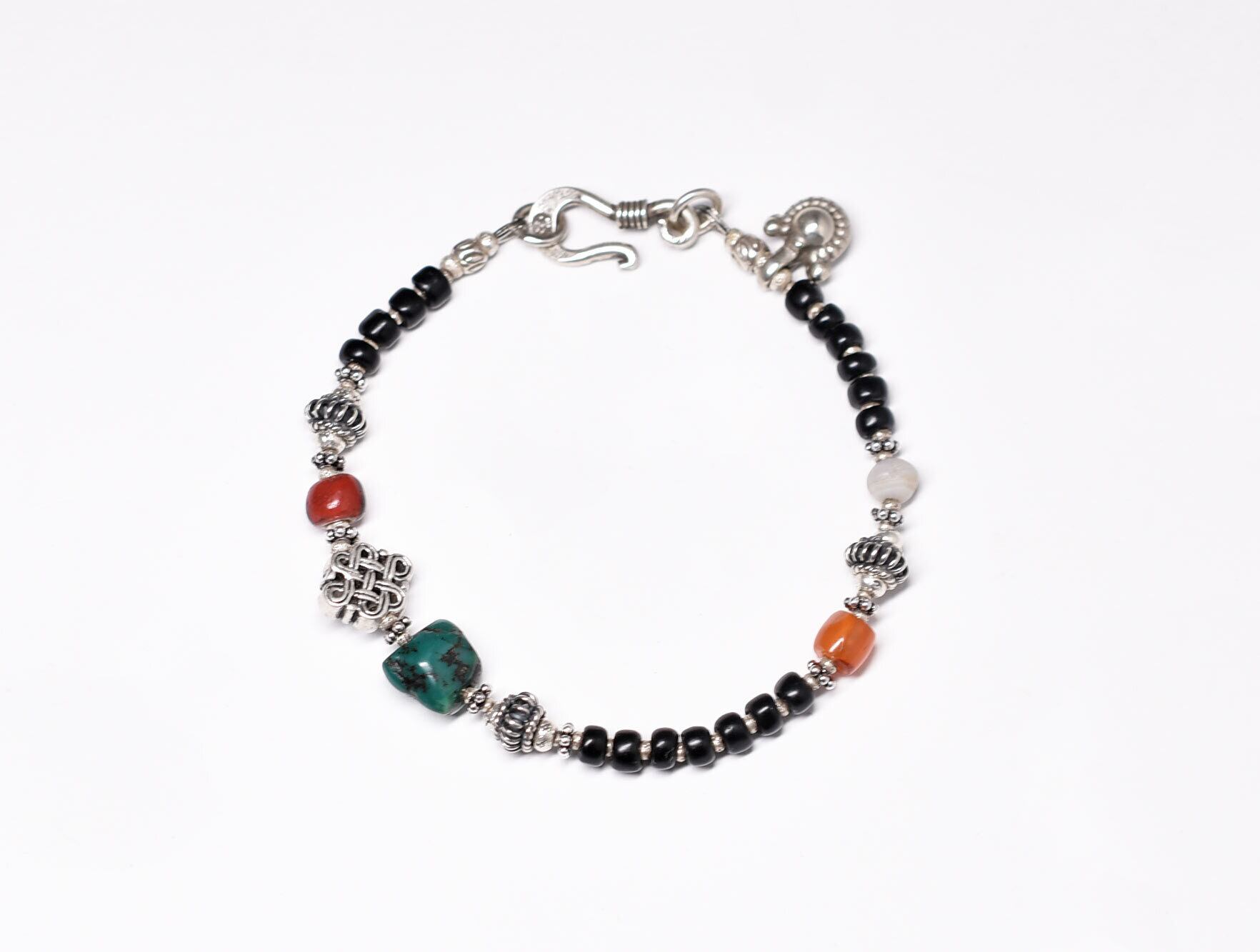 エンドレスノットとoldチベタンターコイズ、金赤ホワイトハーツ、古代瑪瑙、ミゾーラムカーネリアン、漆黒ビーズのブレス