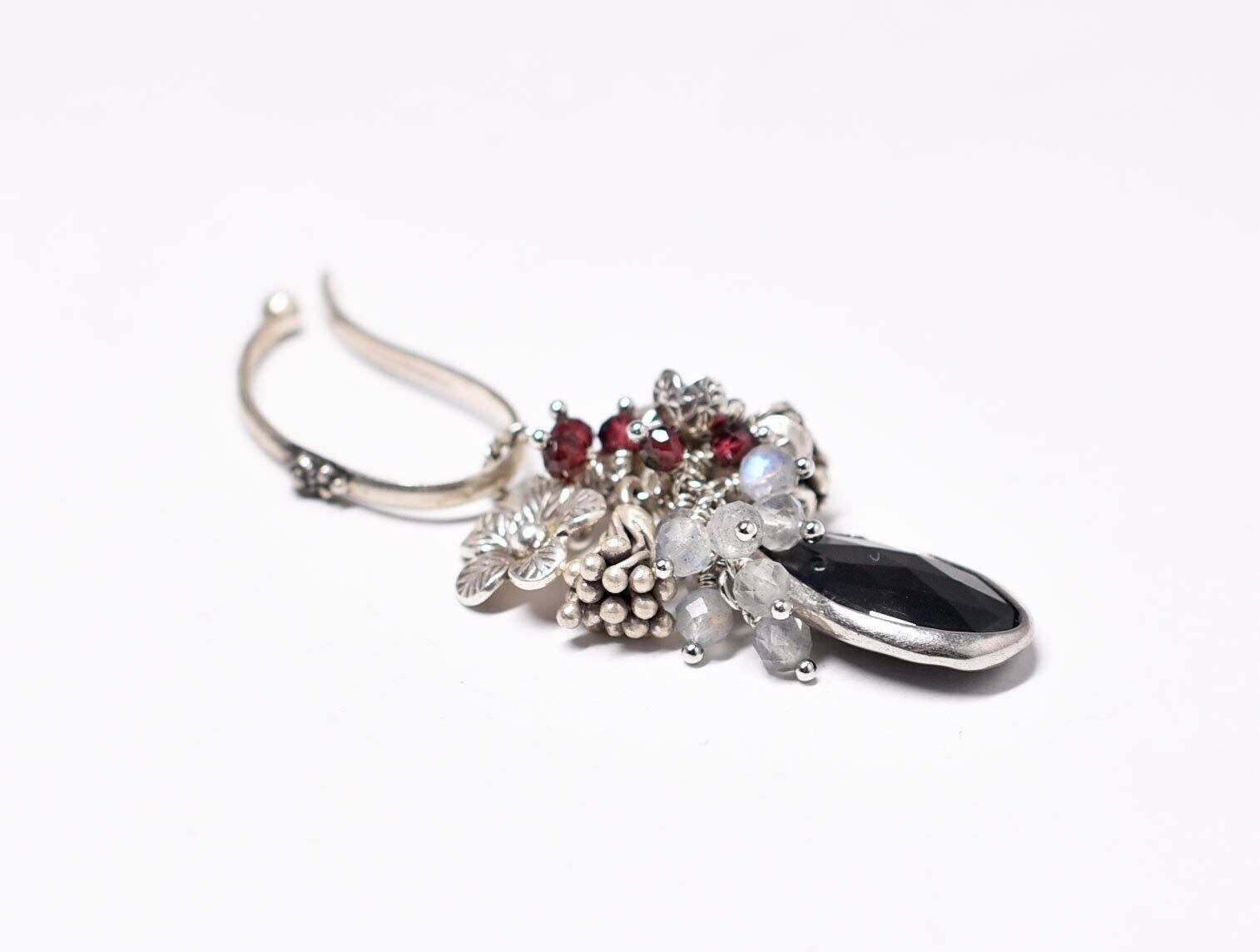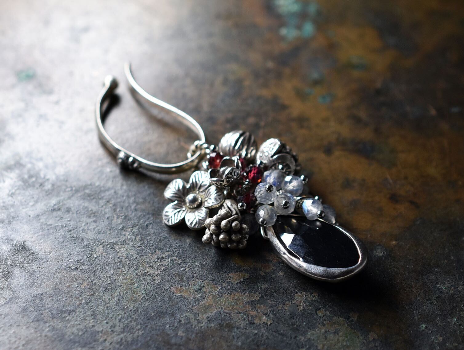 シルバー枠オニキスとたわわなラブラドライト、ガーネット、ボタニカルカレンシルバーのイヤーカフ