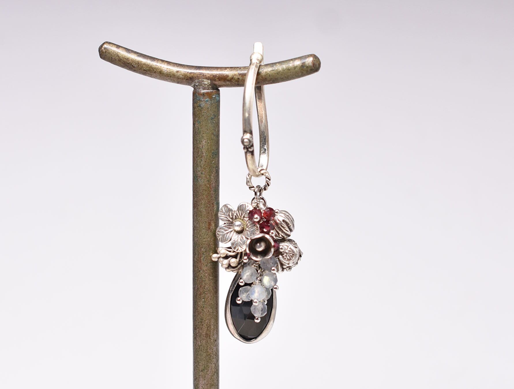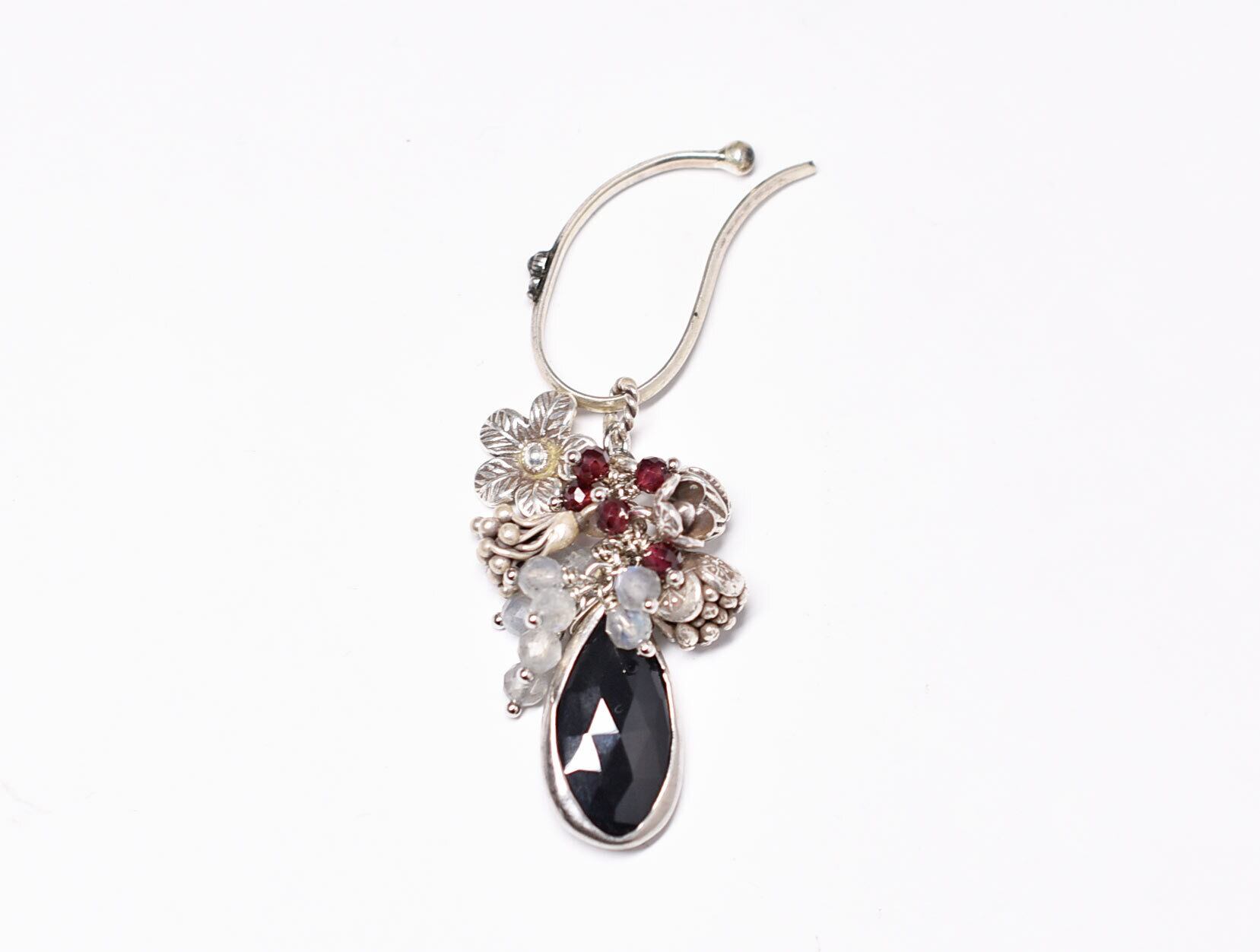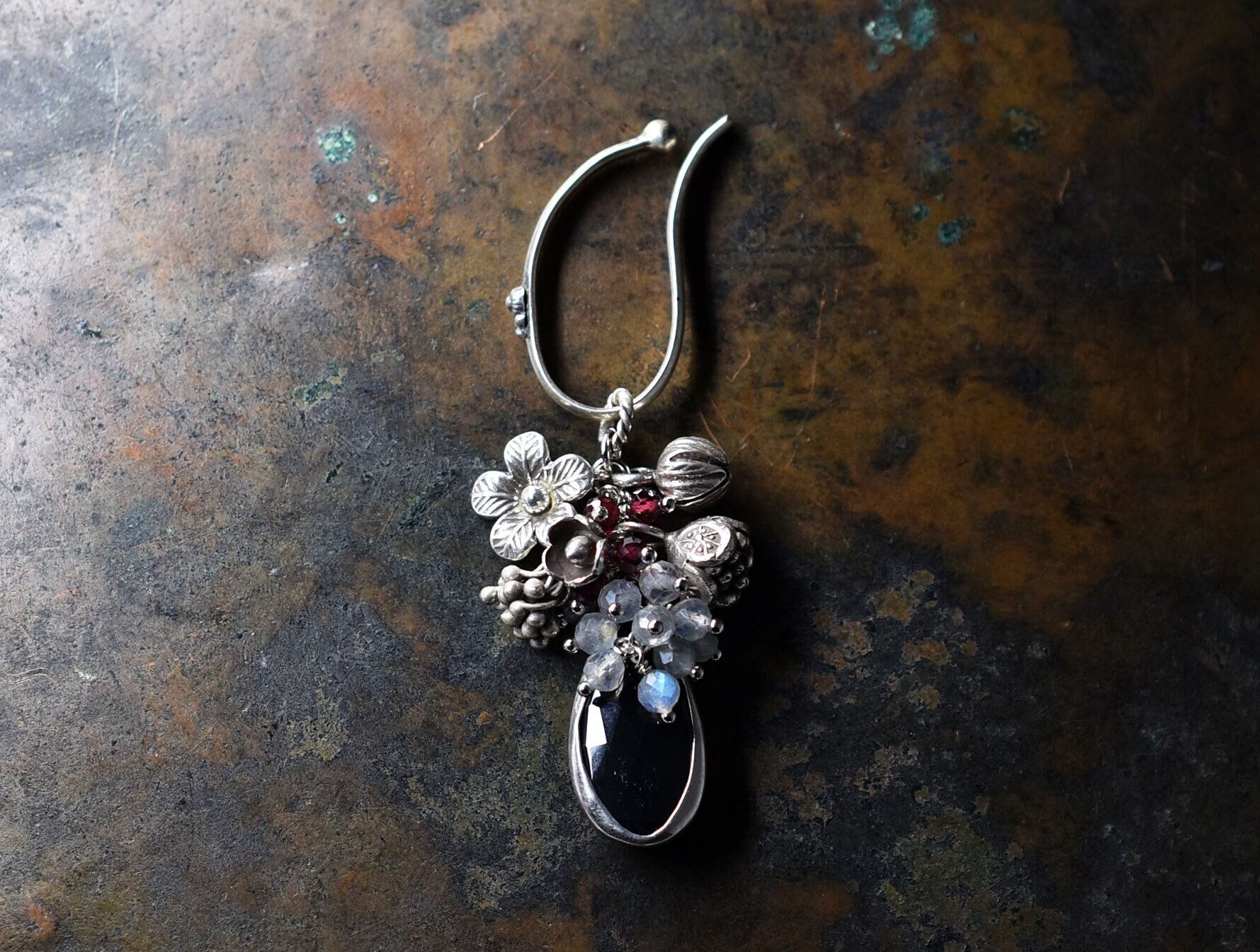 シルバー枠オニキスとたわわなラブラドライト、ガーネット、ボタニカルカレンシルバーを繋いだんボリュームのあるイヤーカフです。