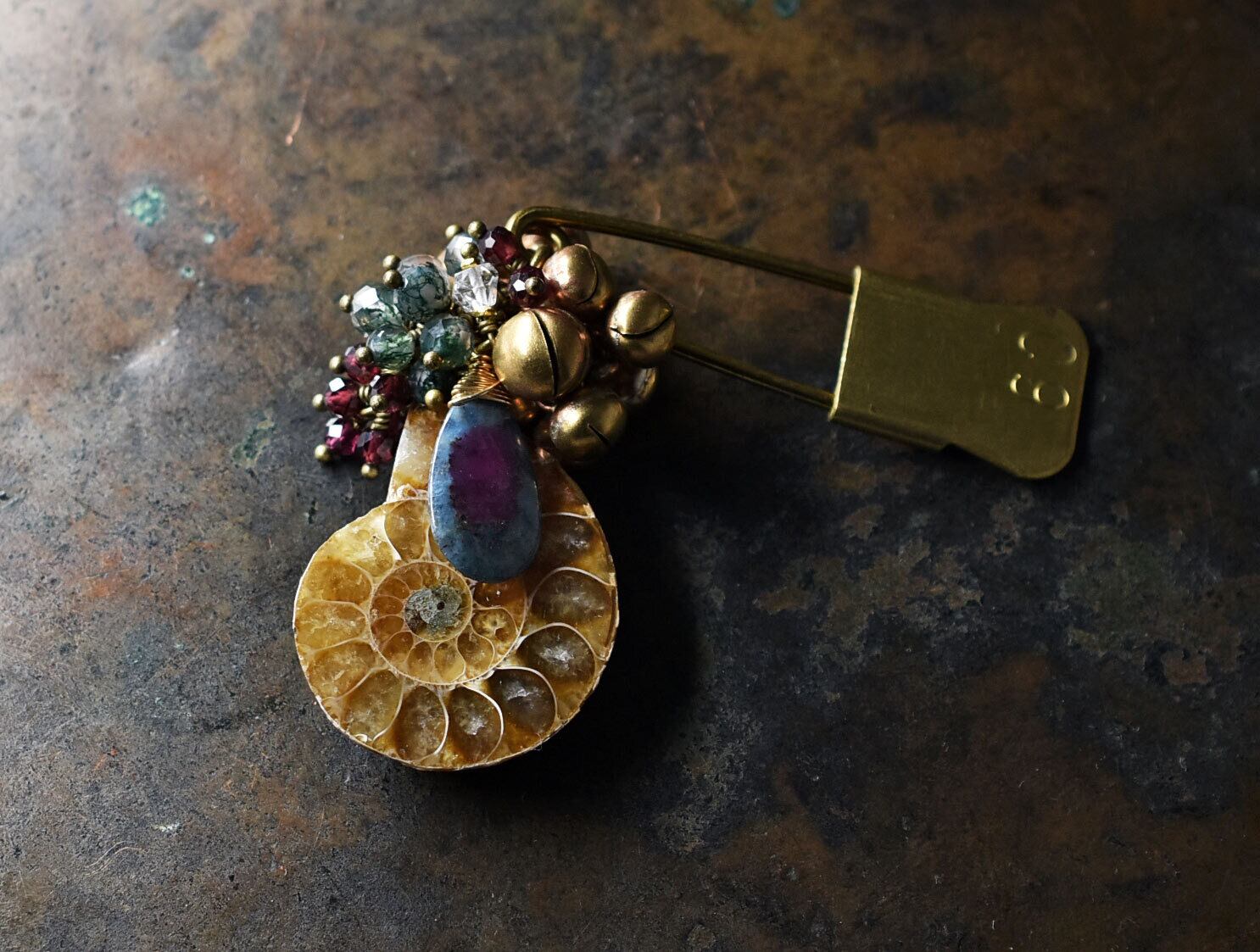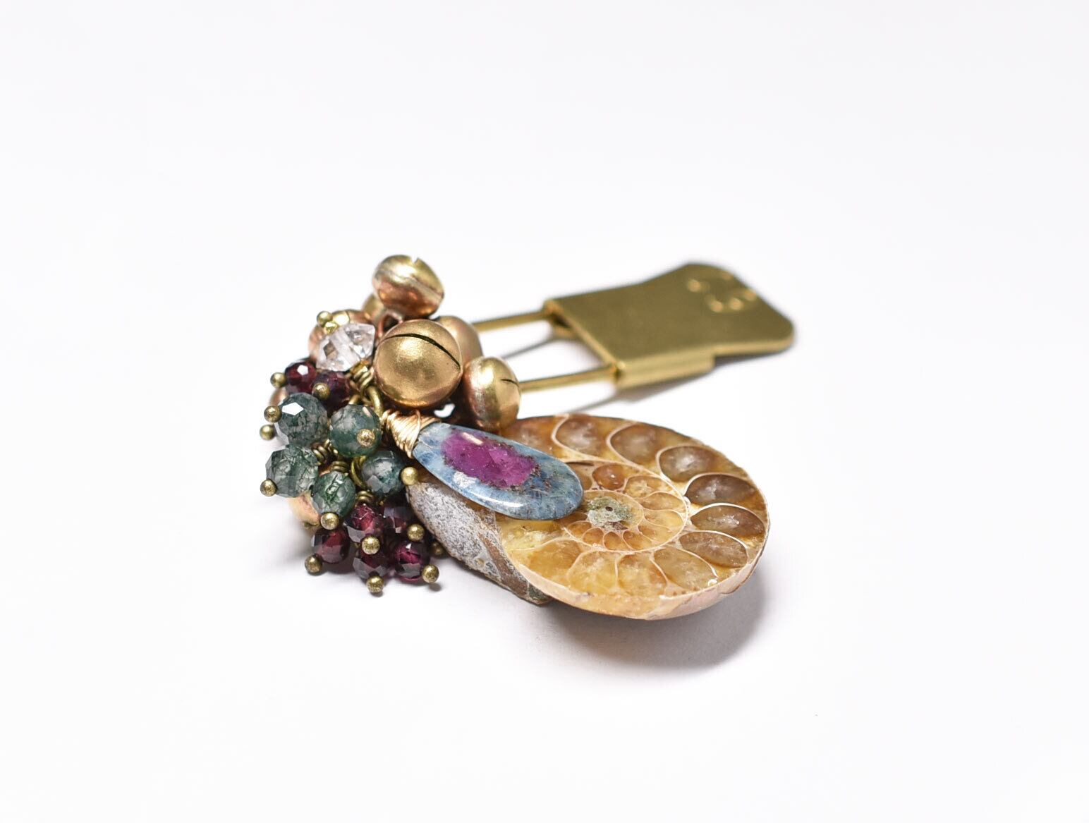 アンモナイトとたわわな鈴とガーネット、モスアゲート、ルビーインゾイサイト、ハーキマーダイヤモンドをランドリーピンに繋いだボリュームのあるブローチです。