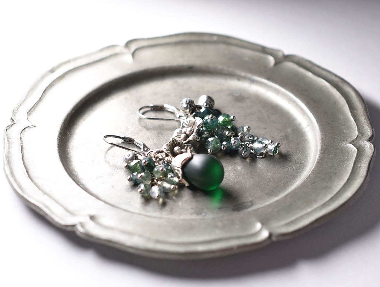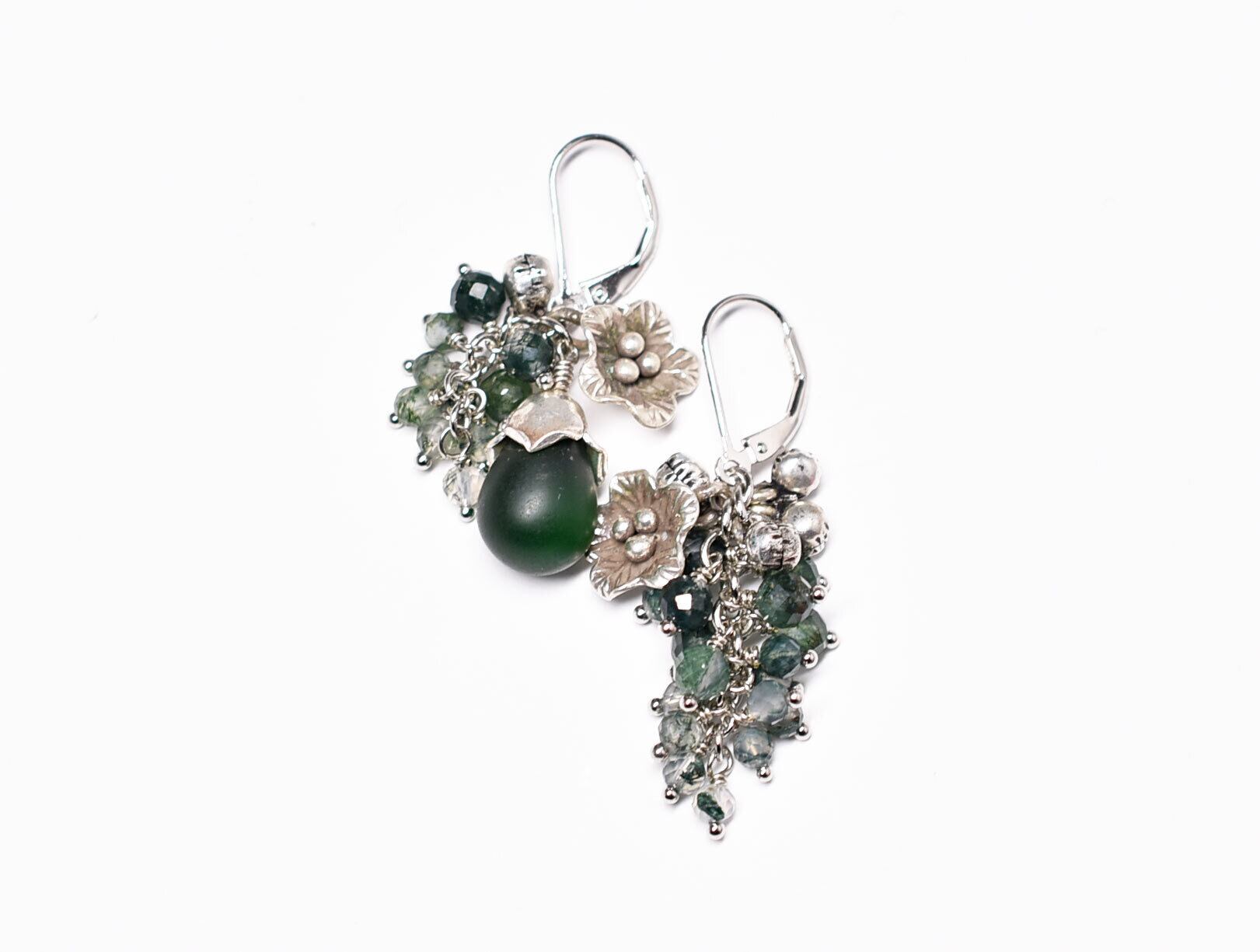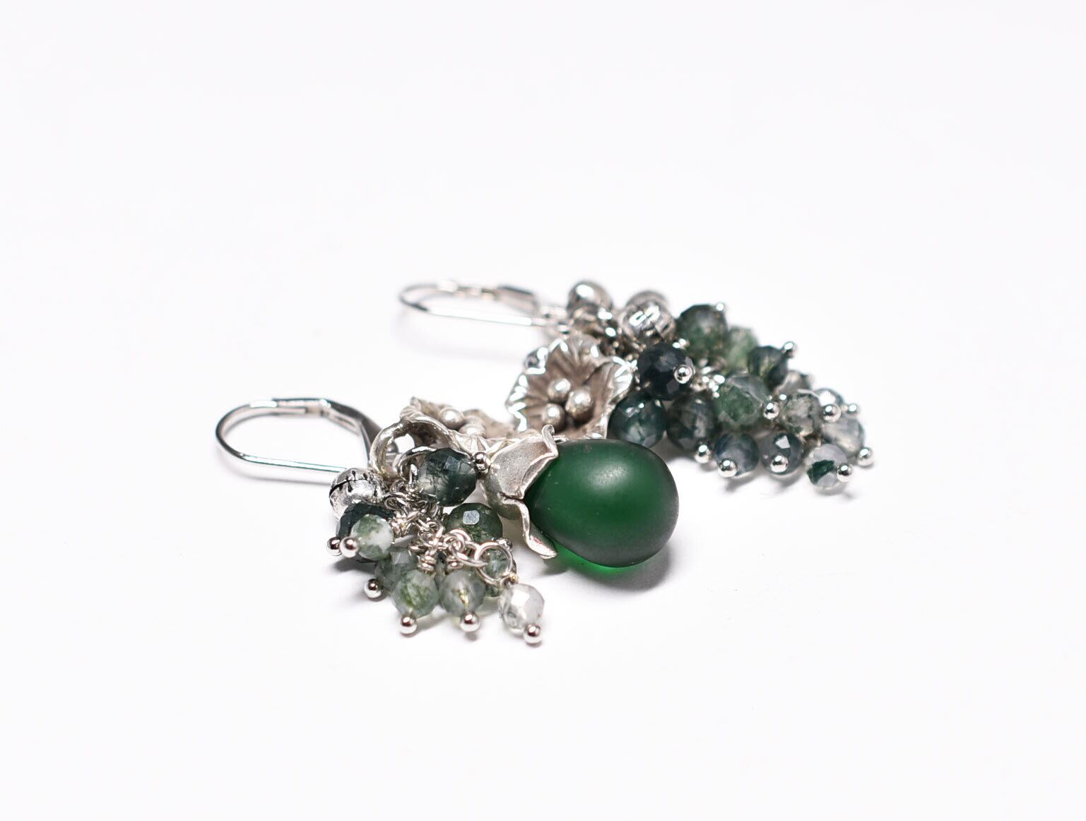 素材:ガラス、モスアゲート、カレンシルバー、インドシルバー、シルバー