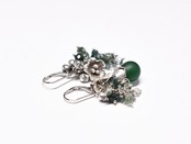 グリーンウエディングビーズとたわわなモスアゲート、お花カレンシルバーと小さな鈴のアンシメトリーピアス