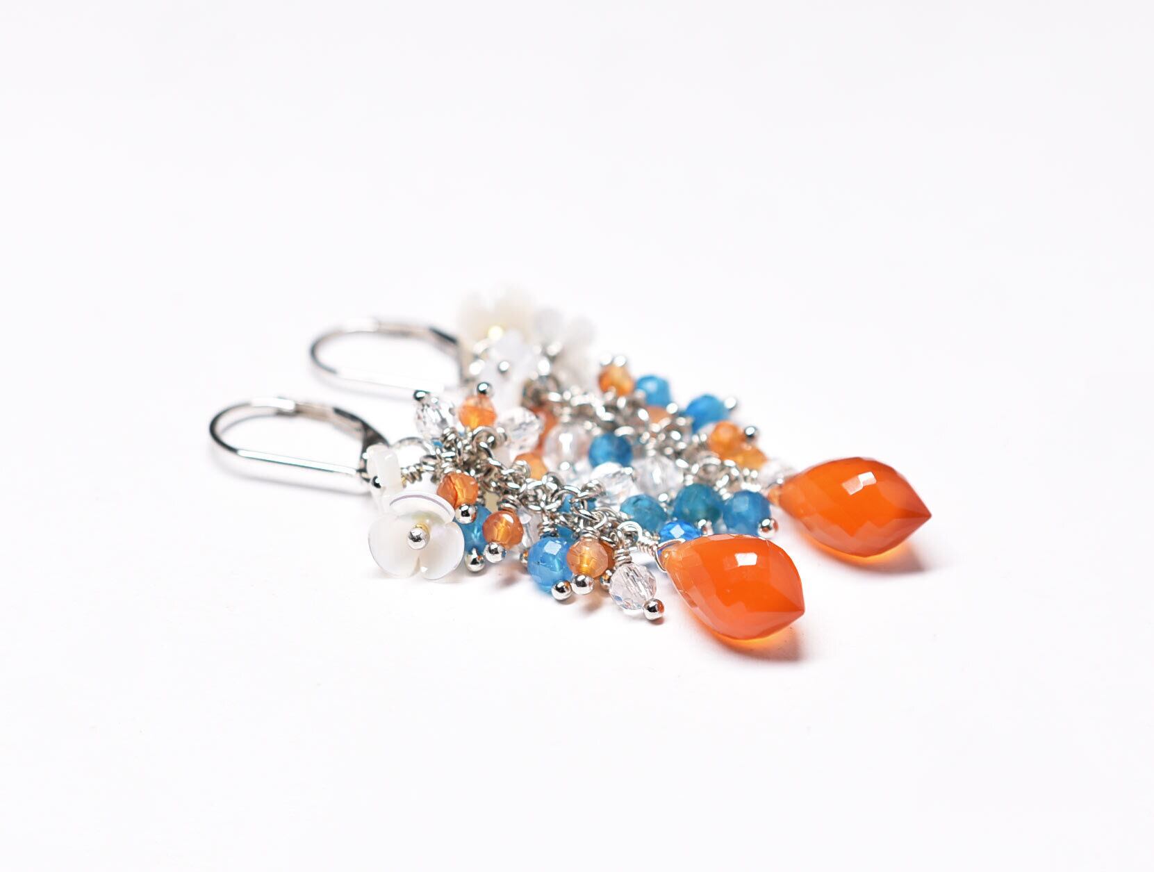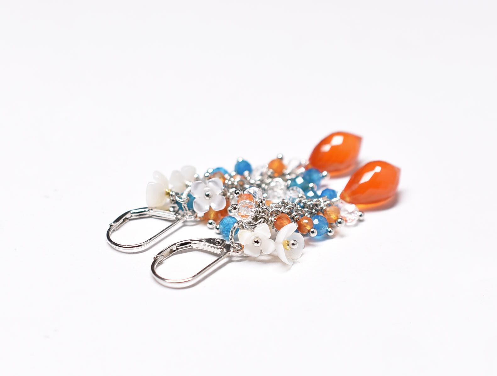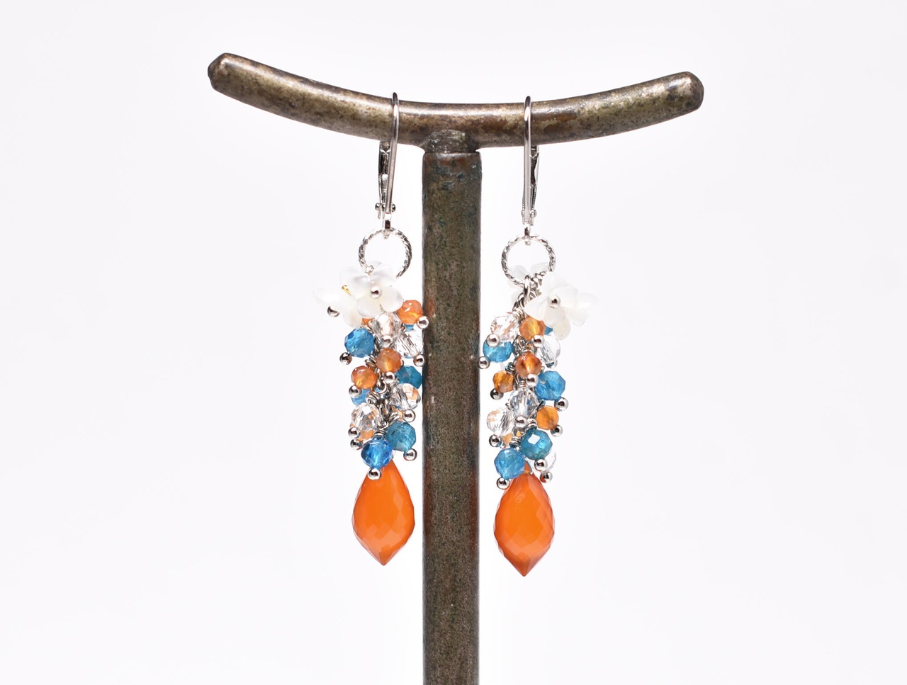 カーネリアンとたわわなストーンビーズ、白蝶貝の小花のピアス(シルバー)