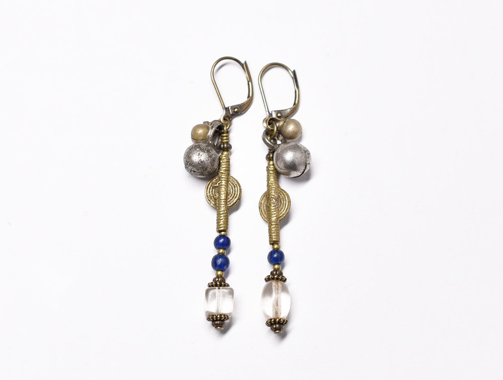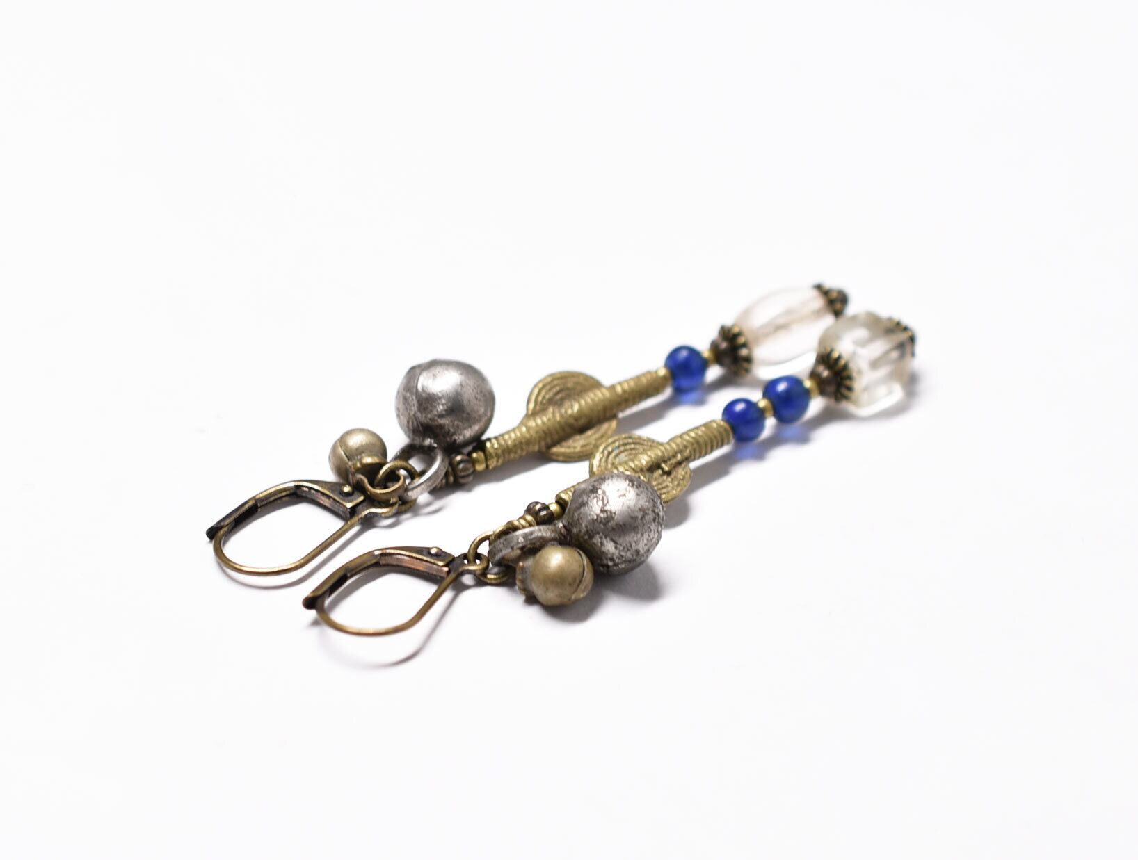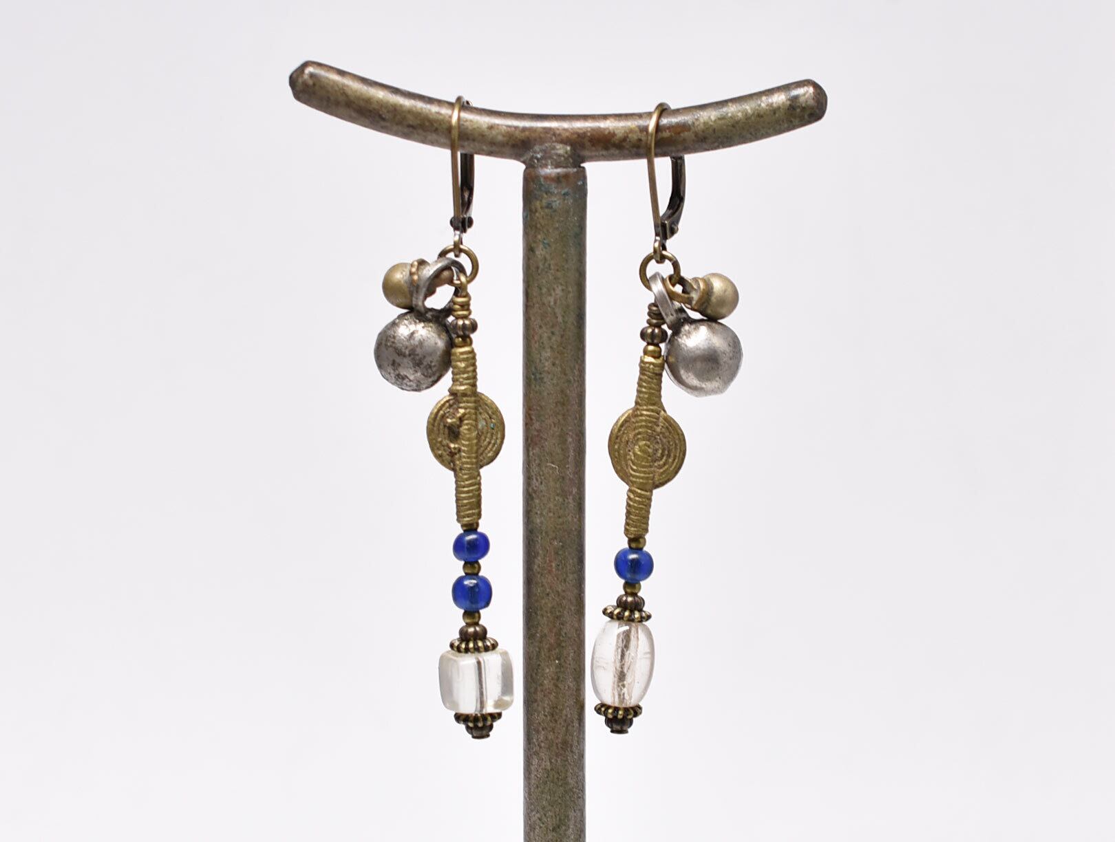 アンティークボヘミアビーズとブルービーズ、アフリカンブラス、鈴のピアス