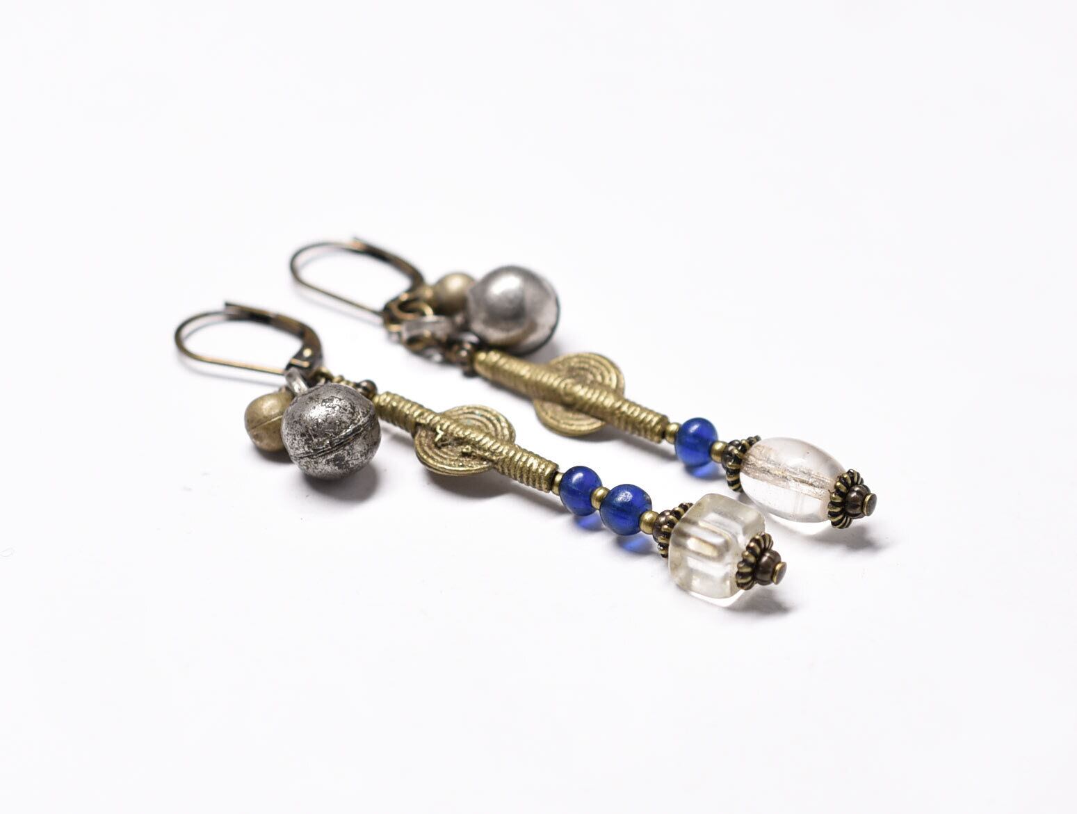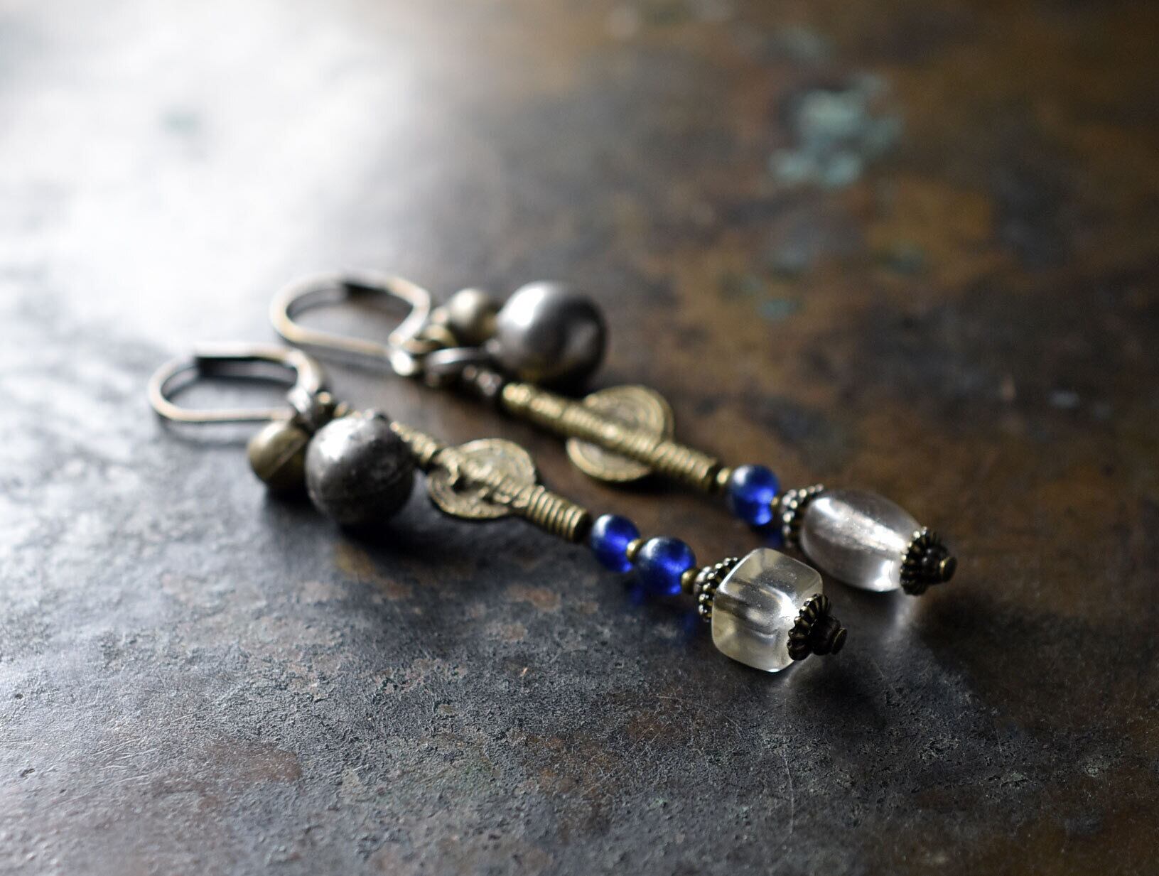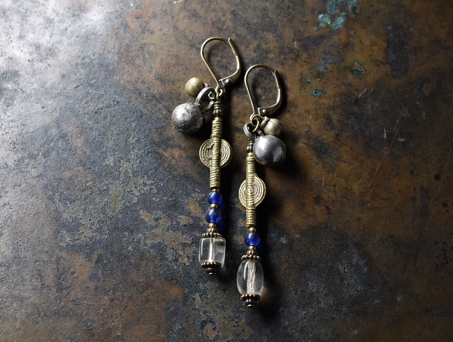 アンティークボヘミアビーズとブルービーズ、アフリカンブラス、鈴のピアス