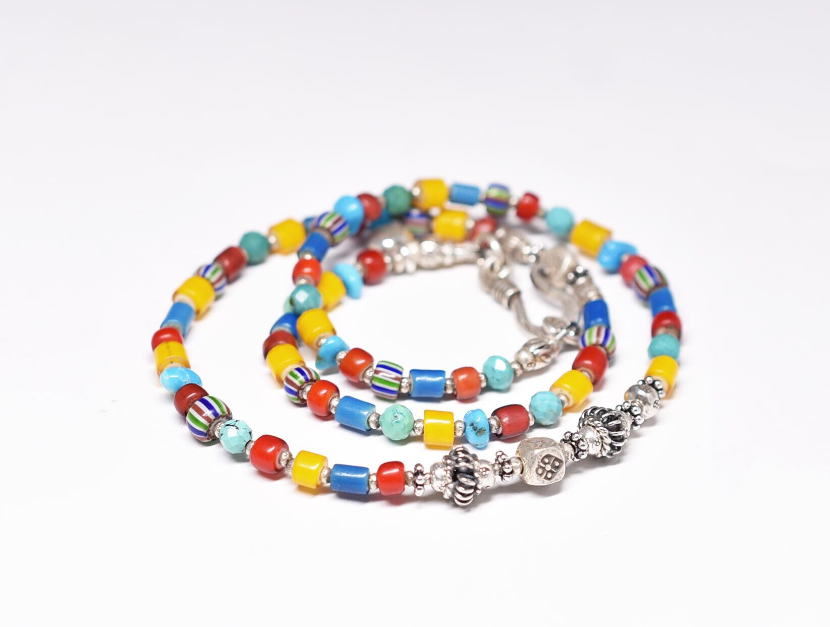 黄色、青色、赤色、ピンク色のビーズはアンティークのホワイトハーツです。