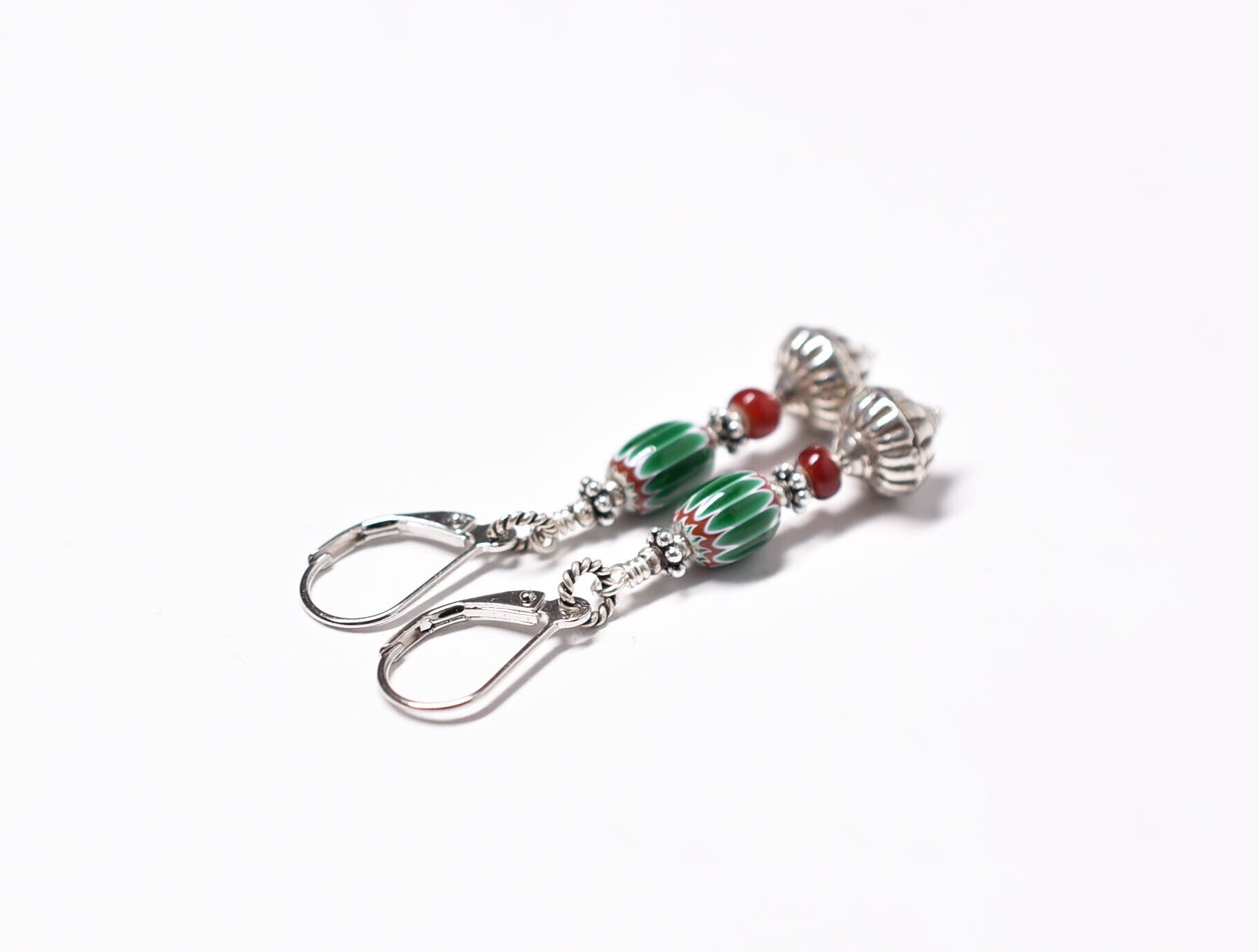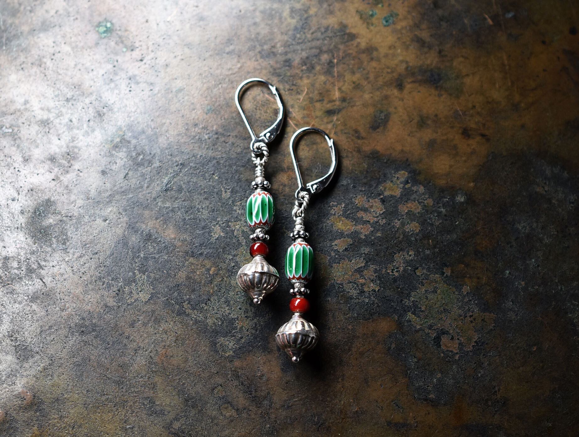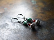 グリーンシェブロンと濃赤ホワイトハーツ、カレンシルバーを繋いだピアスです。