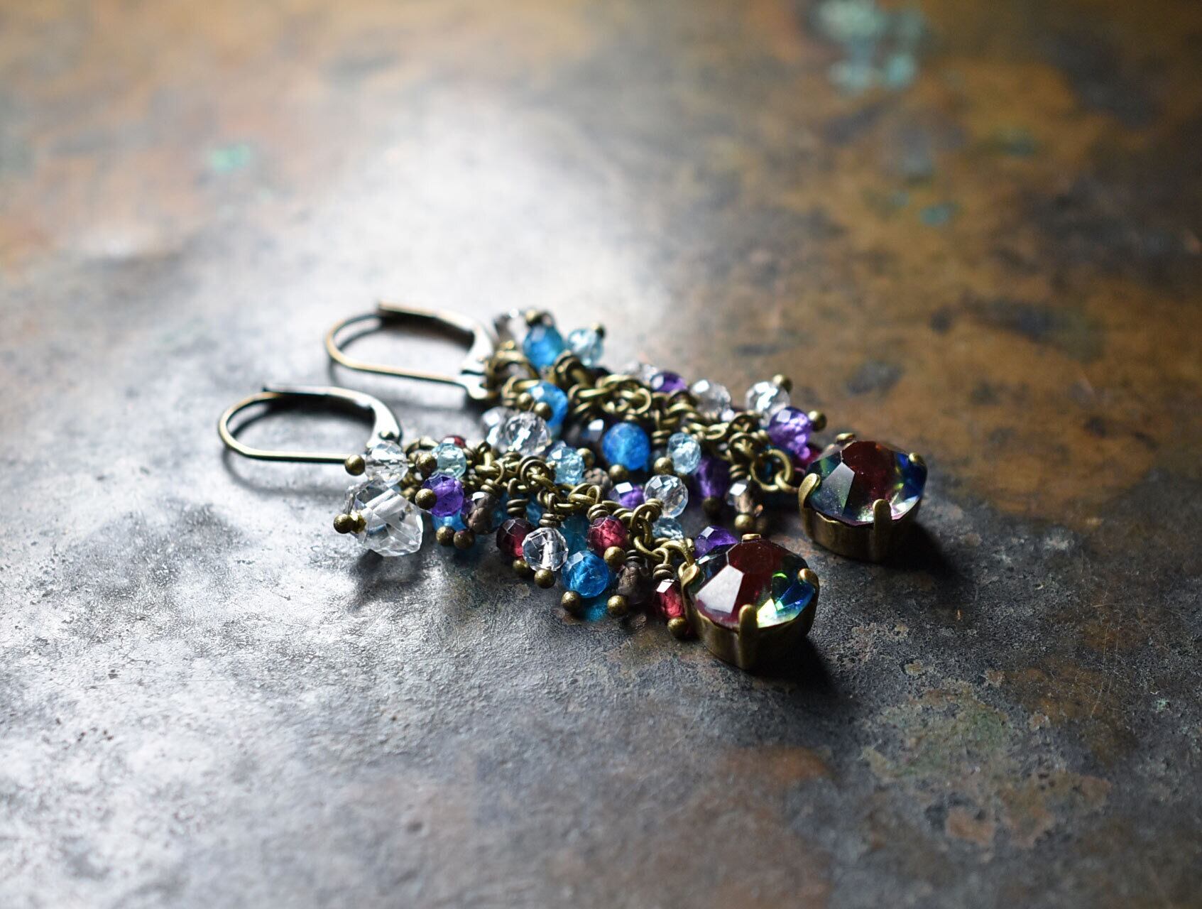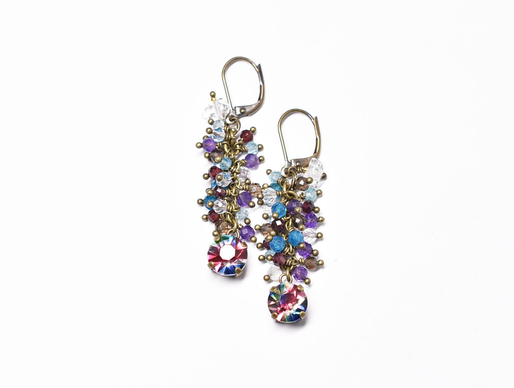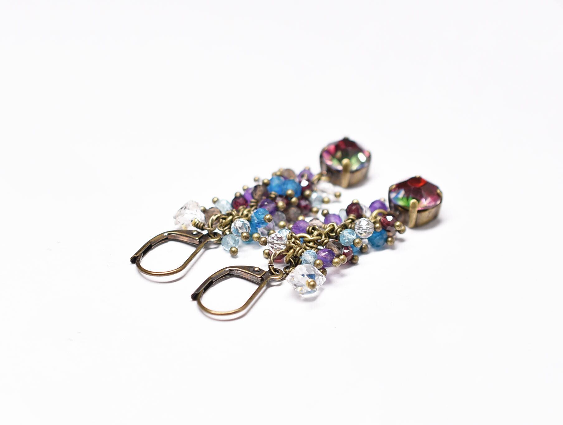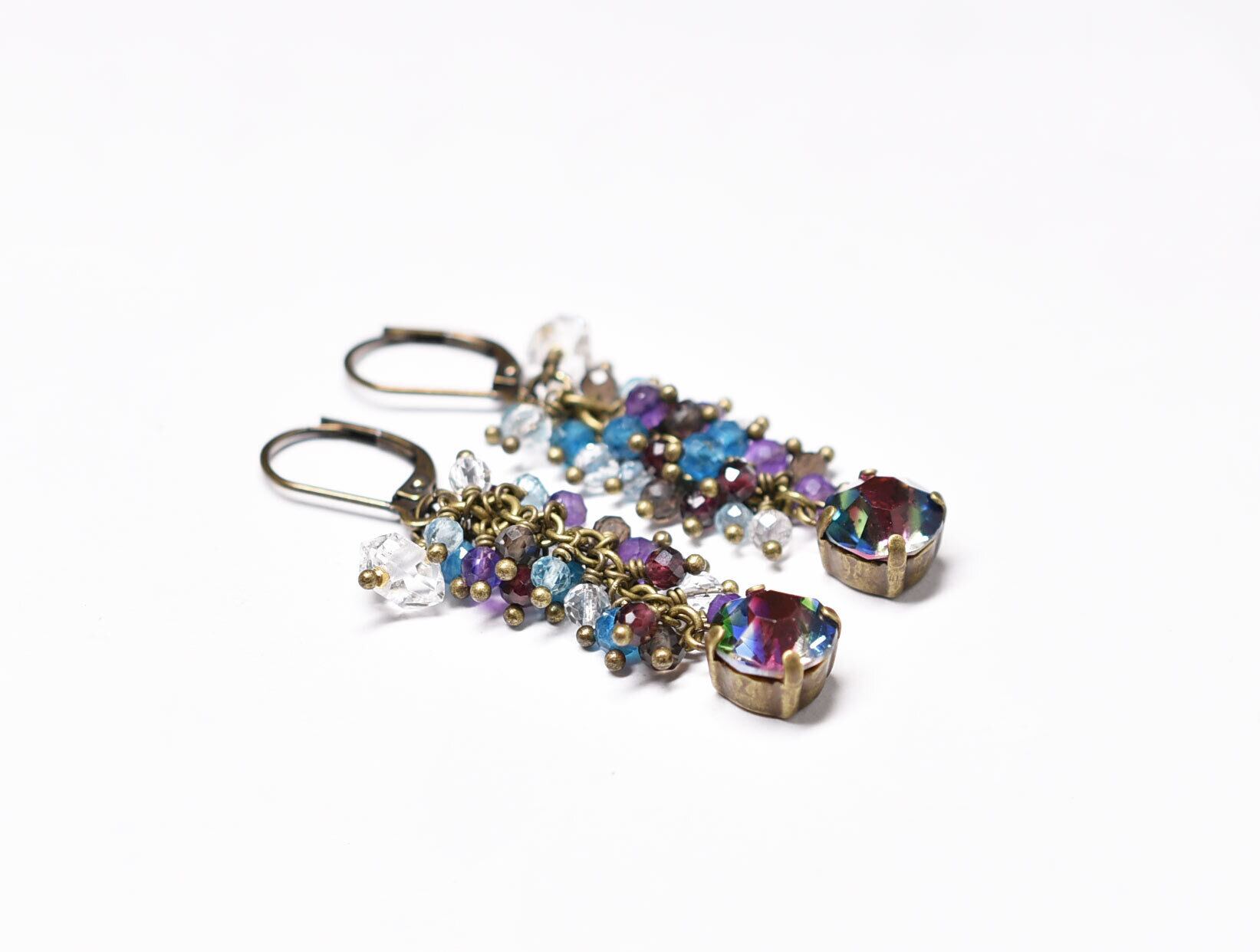 ヴィンテージアイリスガラスとたわわなストーンビーズ、ハーキマーダイヤモンドのピアス