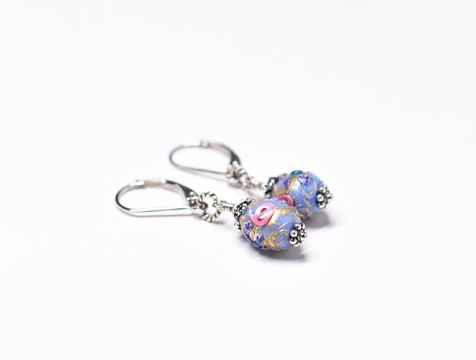 ヴェネチアアンティークビーズ勿忘草と薔薇が施された小さなピアスです。