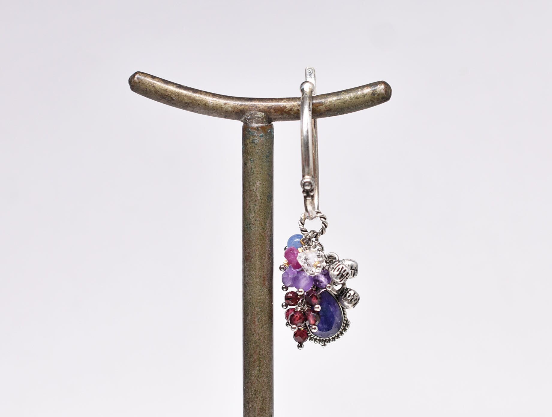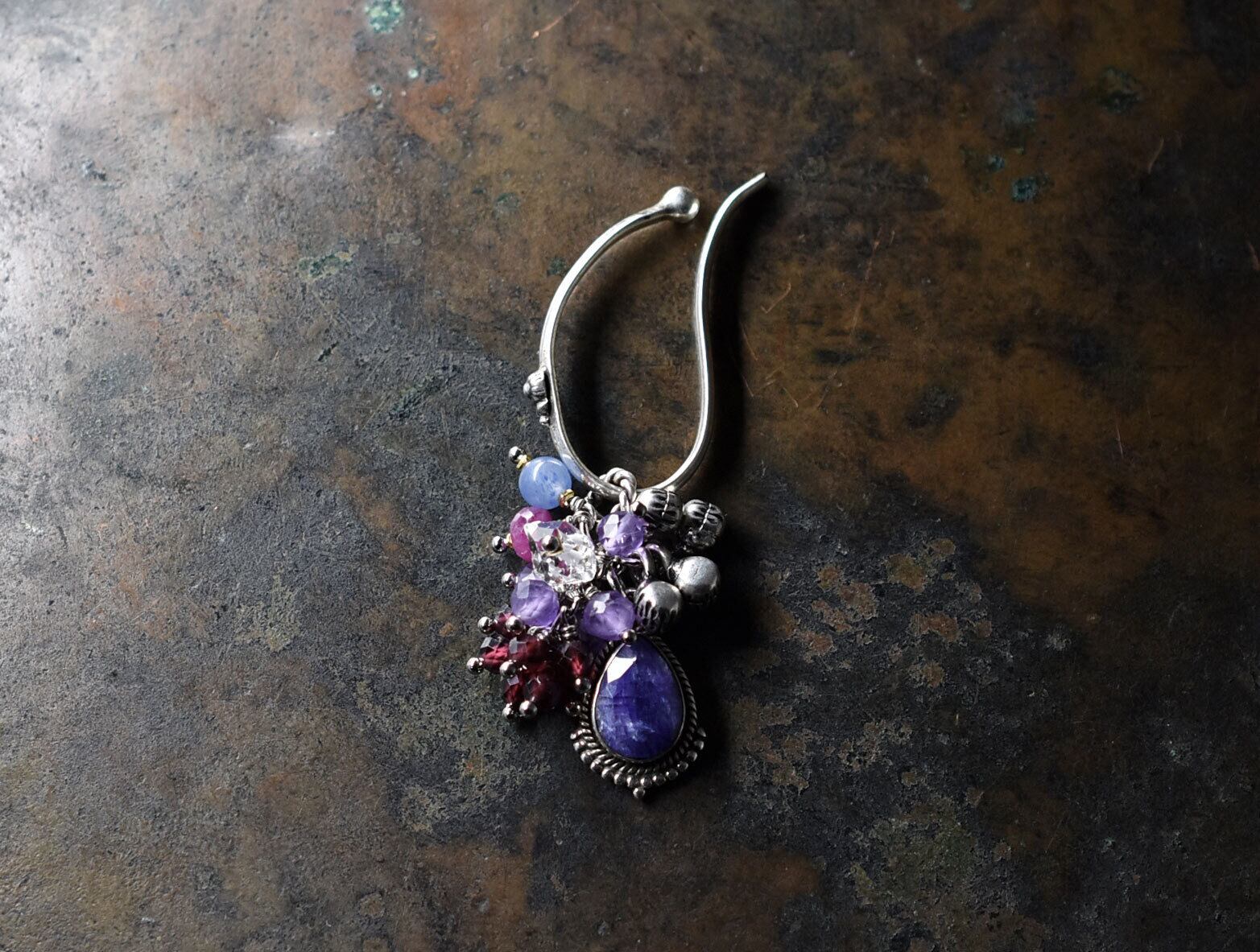 繊細シルバー装飾サファイア、アメジスト、ガーネット、ルビー、ブルー瑪瑙、ハーキマーダイヤモンド、小さな鈴を繋いだイヤーカフです。