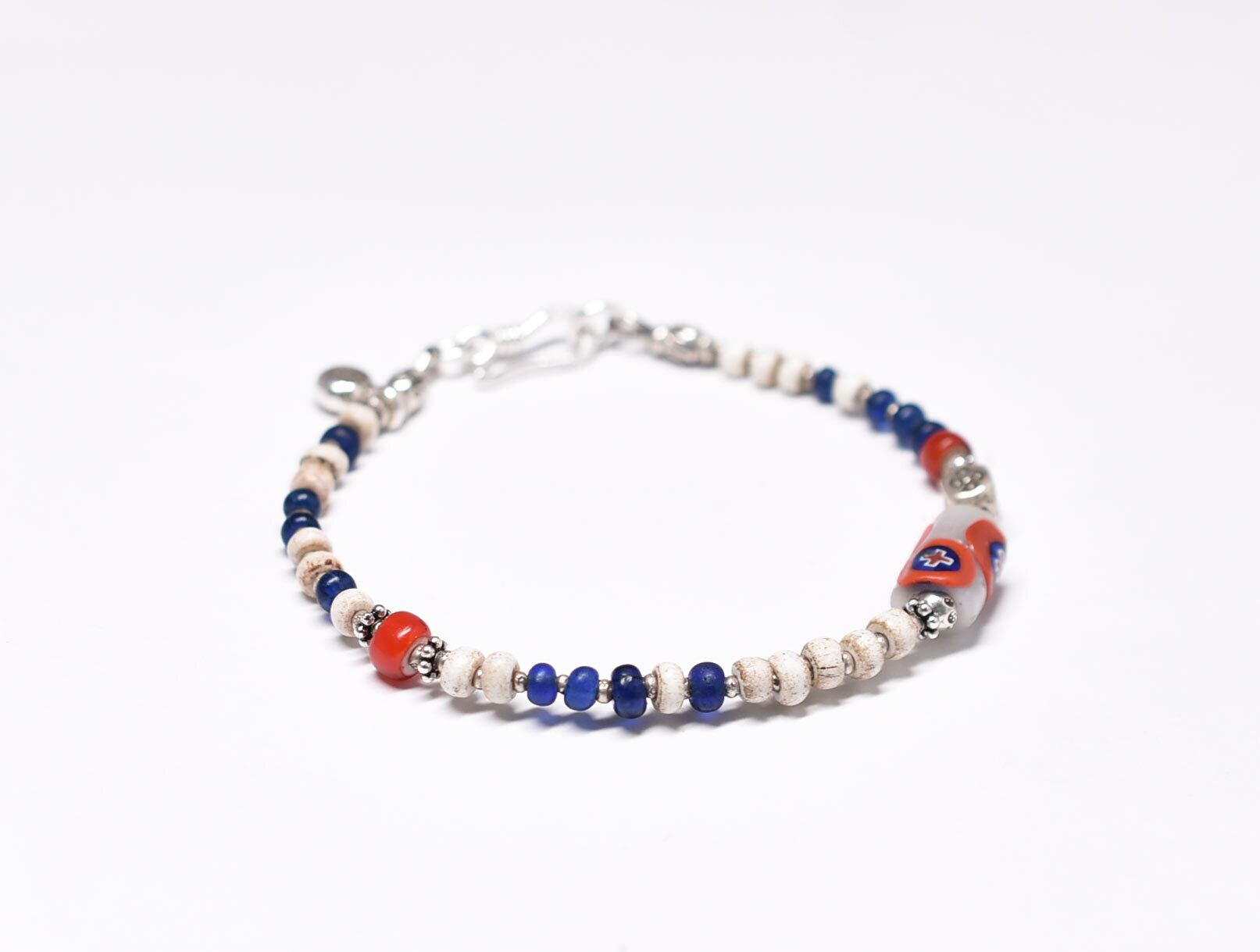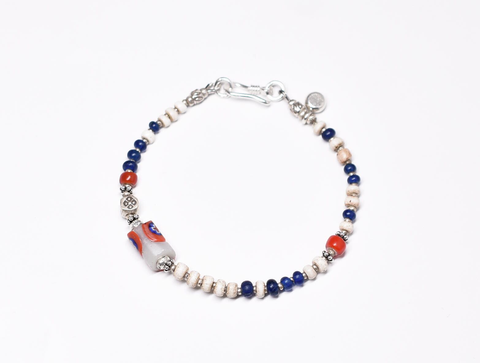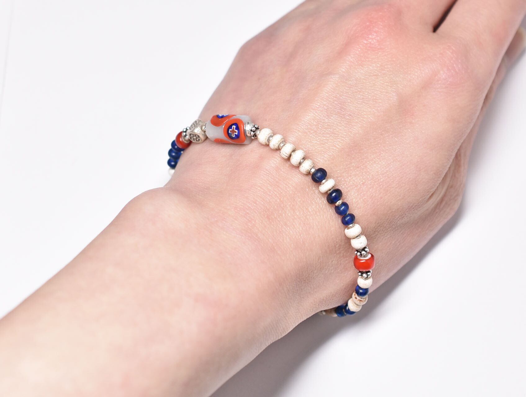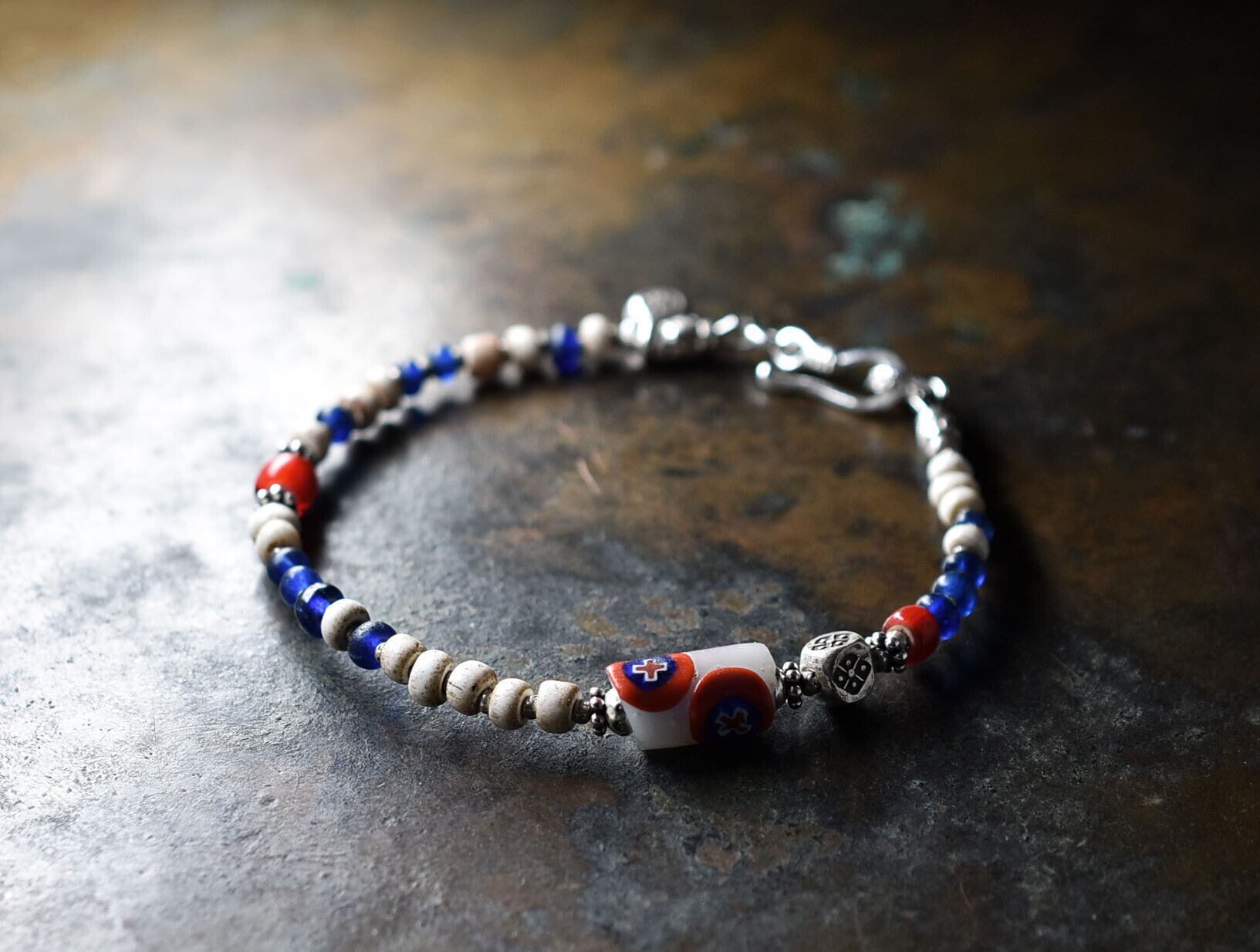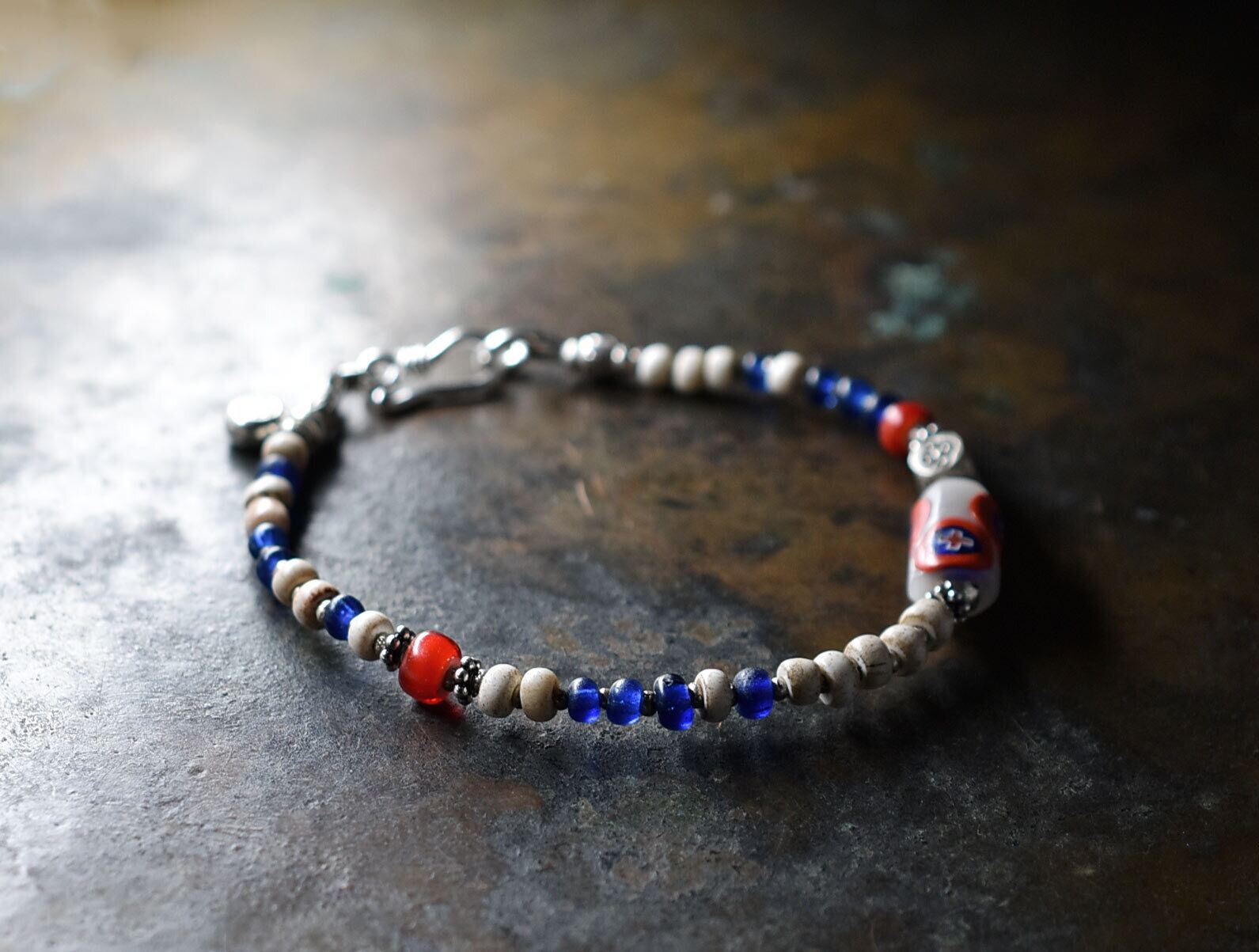 クロス模様のアンティークミルフィオリビーズとホワイト&ブルービーズ、ホワイトハーツ、カレンシルバーなどを繋いだブレスです。