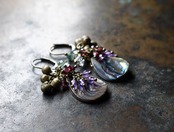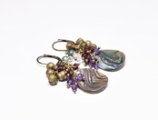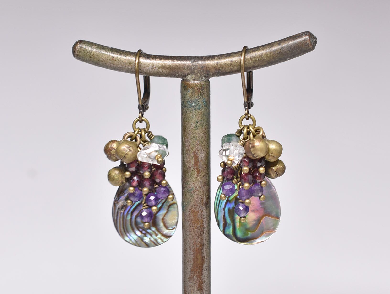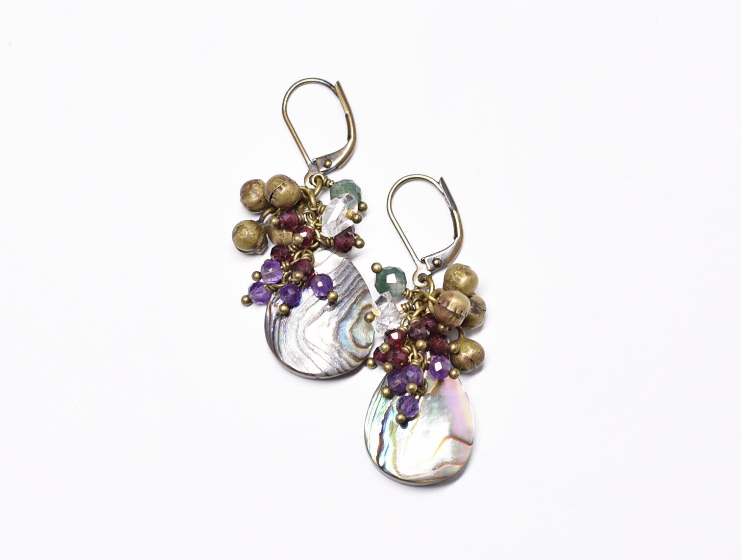 アバロンシェルとたわわなガーネット&アメジスト、ハーキマーダイヤモンド、モスアゲート、民族鈴を繋いだピアスです。