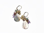 アバロンシェルとたわわなガーネット&アメジスト、ハーキマーダイヤモンド、モスアゲート、民族鈴のピアス