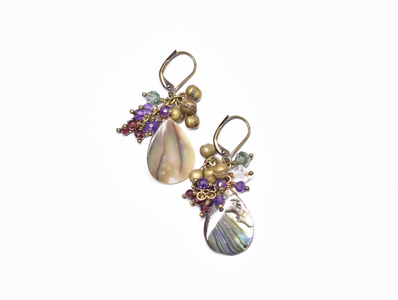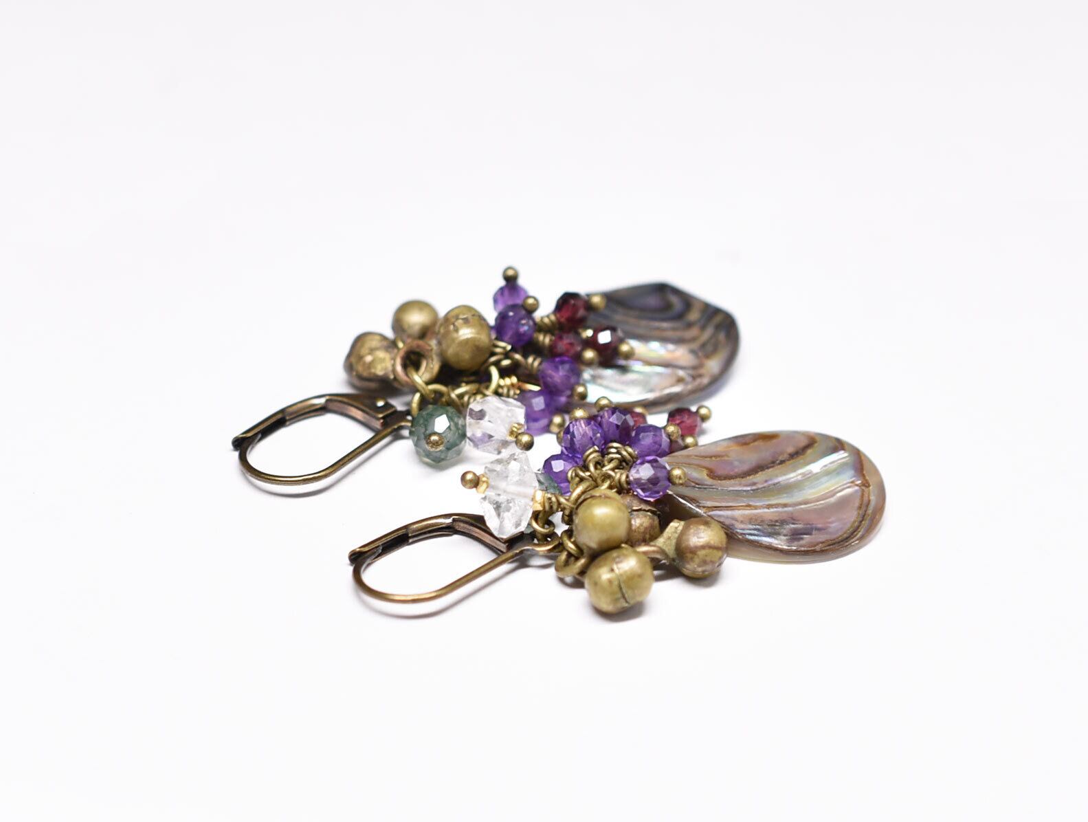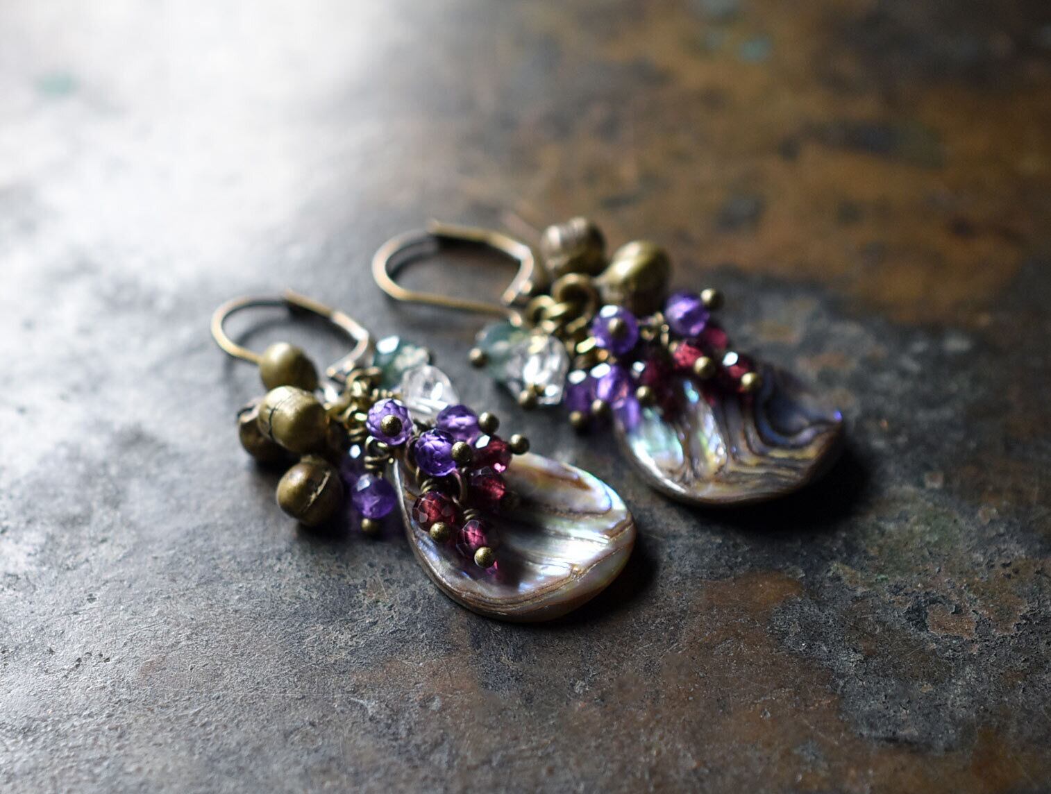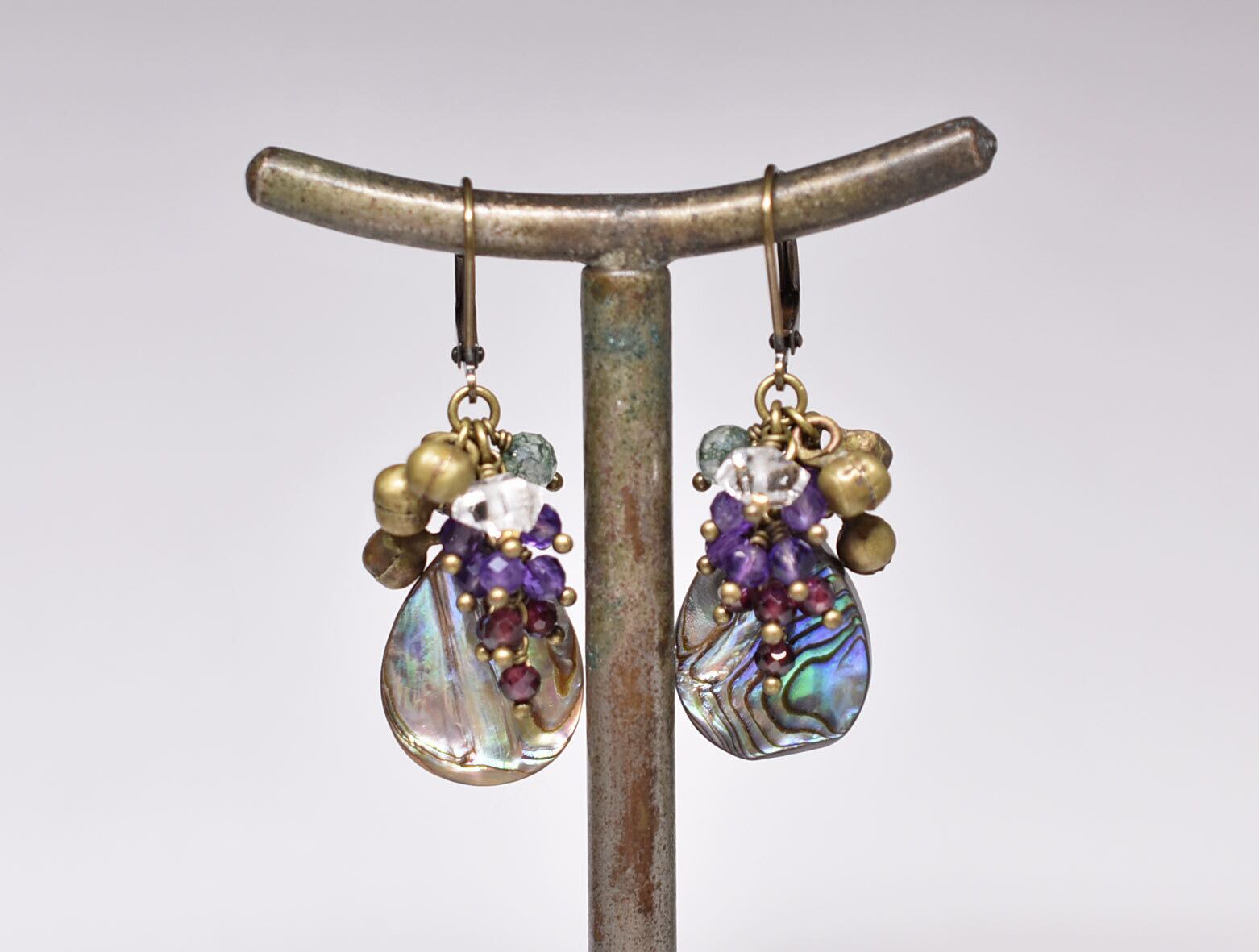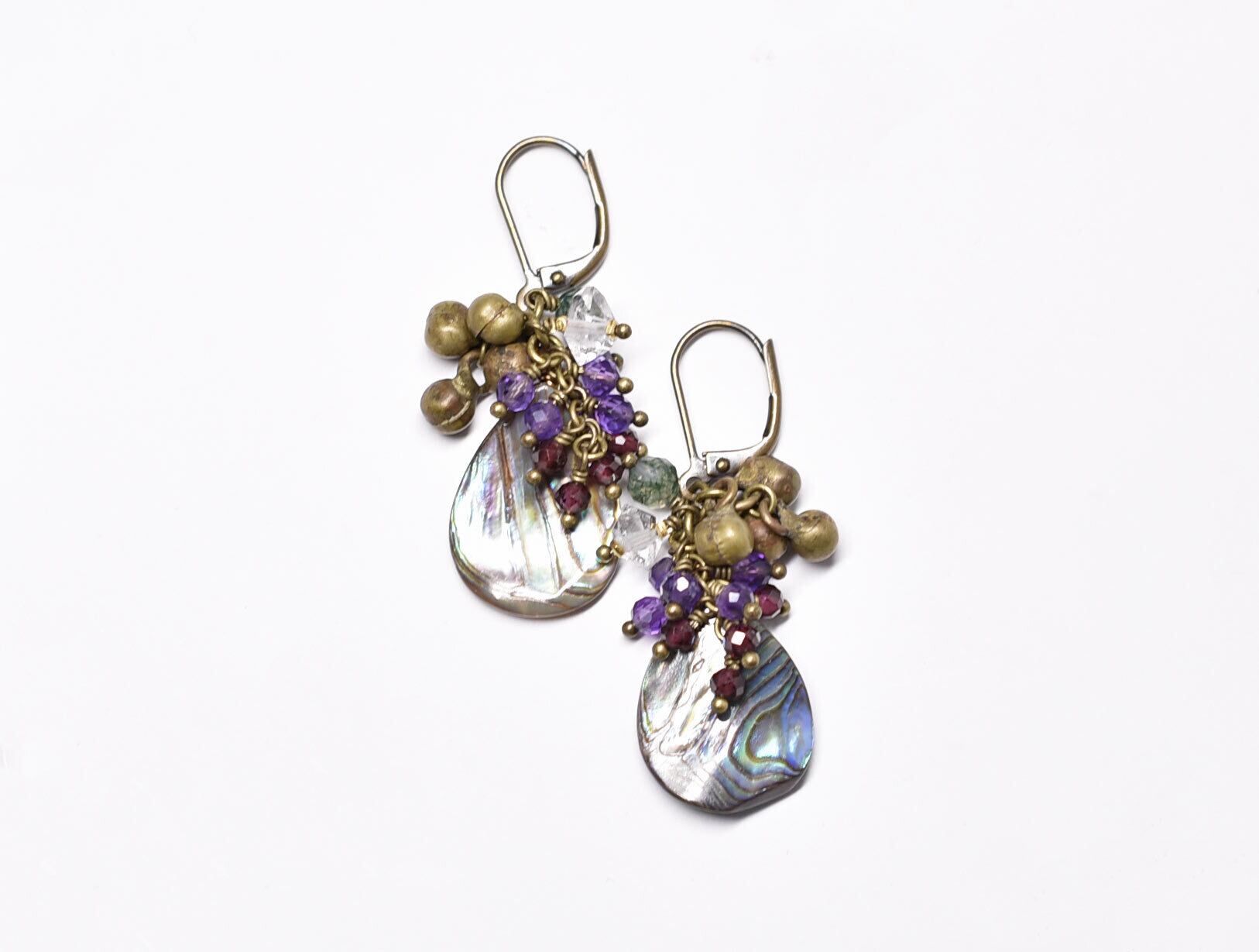 アバロンシェルとたわわなアメジスト&ガーネット、ハーキマーダイヤモンド、モスアゲート、民族鈴のピアス