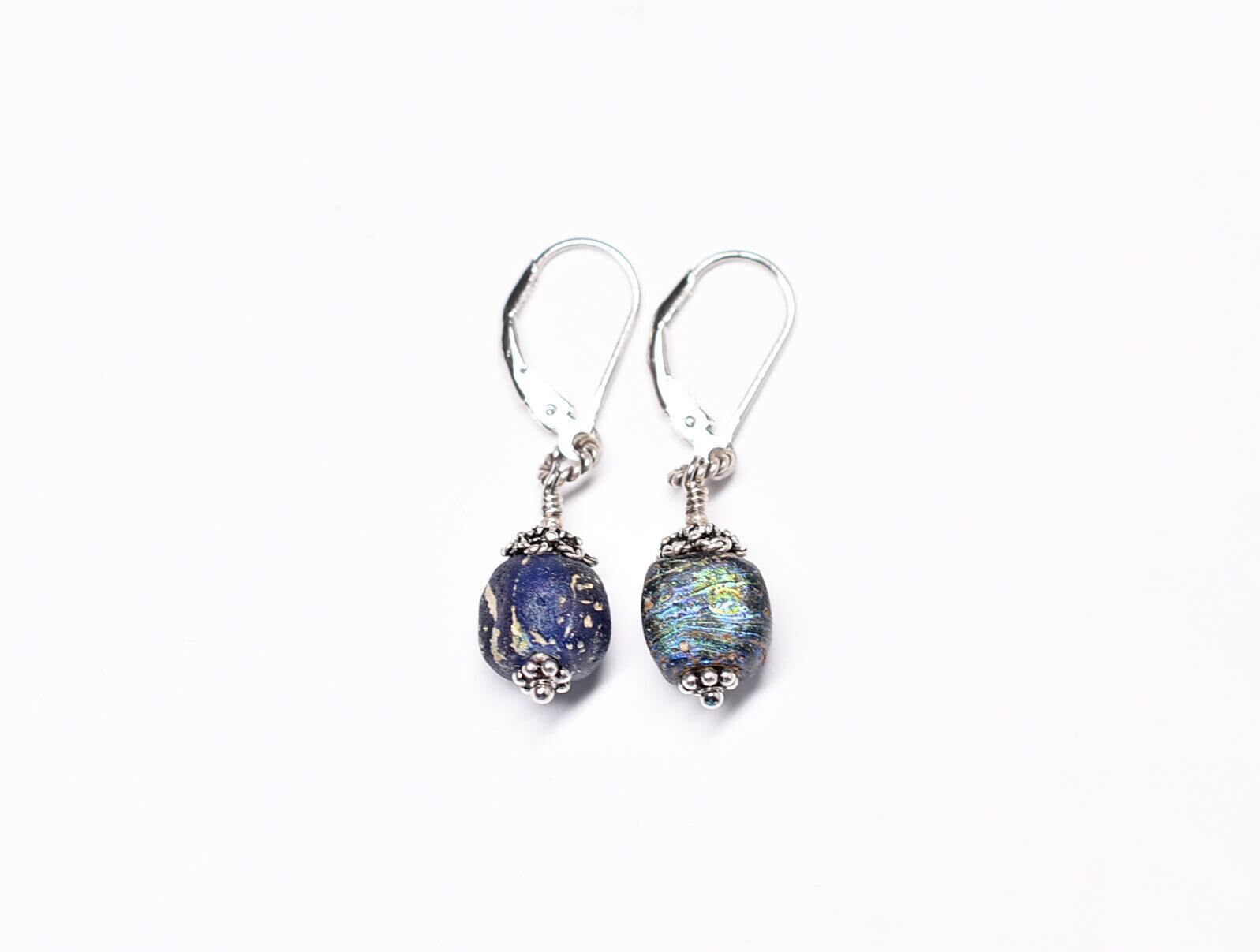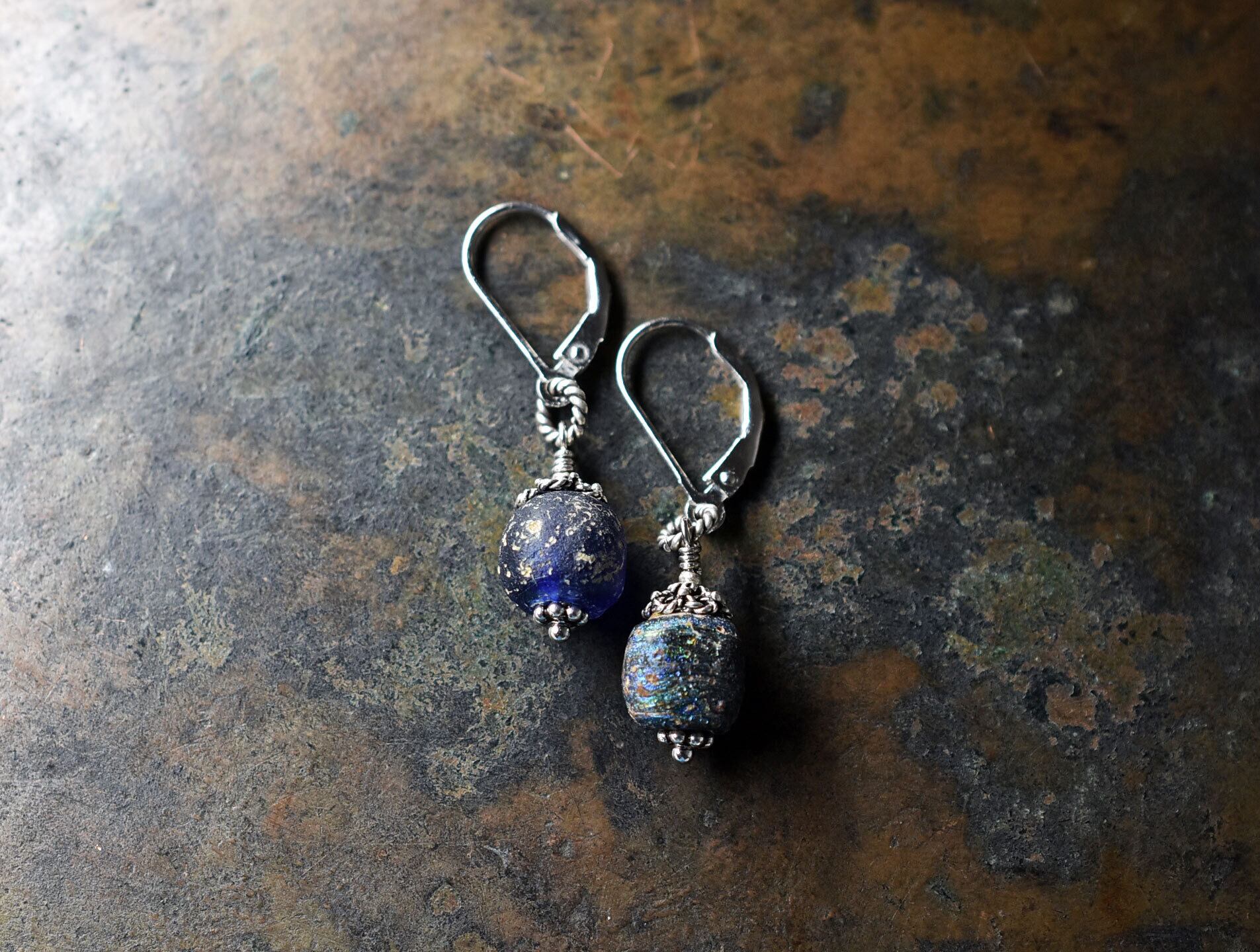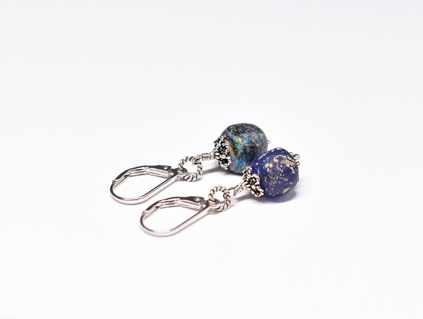銀化ローマングラスビーズを繋いだシンプルな一粒ピアスです。