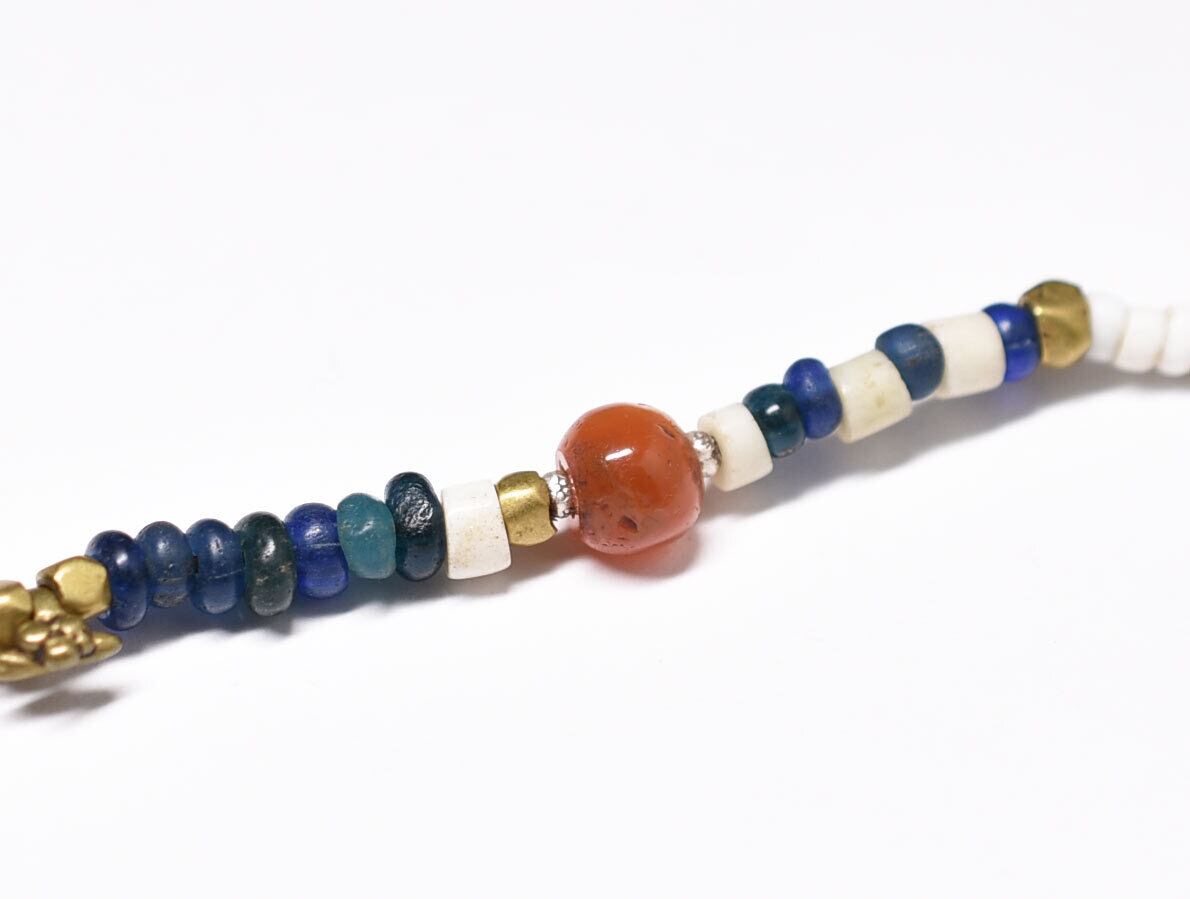 素材:ブルキナファソ真鍮ビーズ、ガラス、ミゾーラムカーネリアン、oldオリッサブラス、カレンシルバー、ロウビキ紐