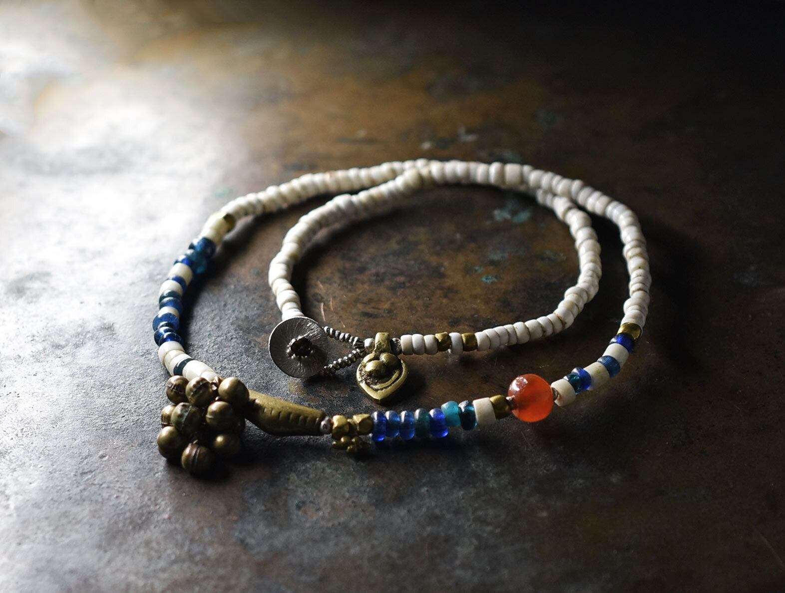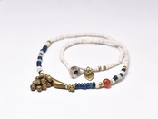 鈍い金色のビーズや、ブルキナファソの真鍮ビーズの横の小さな錨のようなチャームはoldオリッサブラスです。とても希少で高額なインドから届いた真鍮です。留め金付近のチャームもインドから届いた古い真鍮です。
