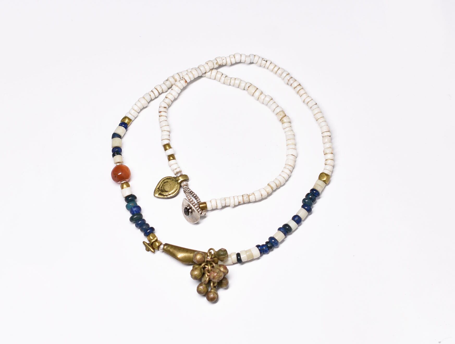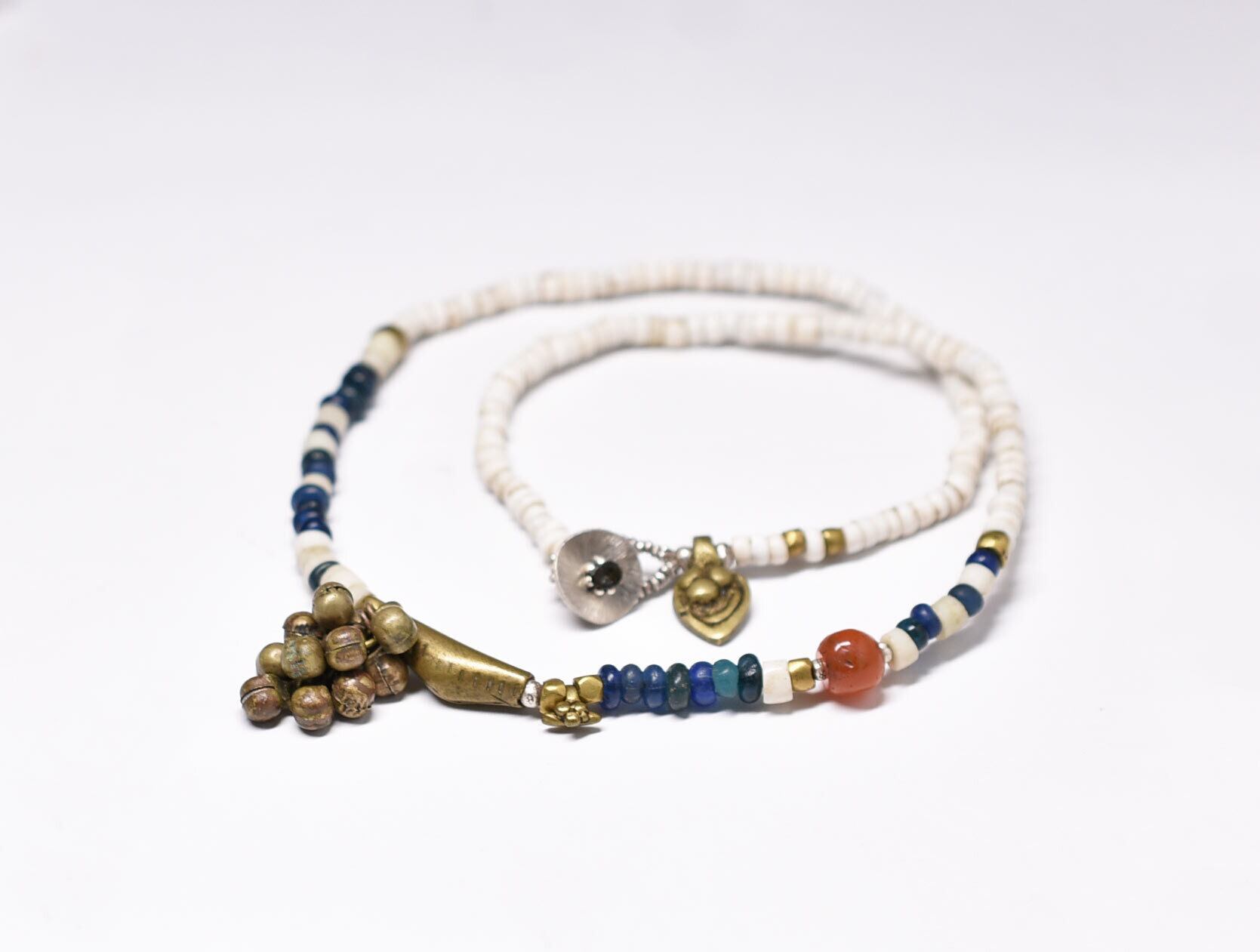 ブルキナファソ真鍮ビーズたわわな民族鈴、ミゾーラムカーネリアン、ホワイト&エメラルドブルービーズネックレス