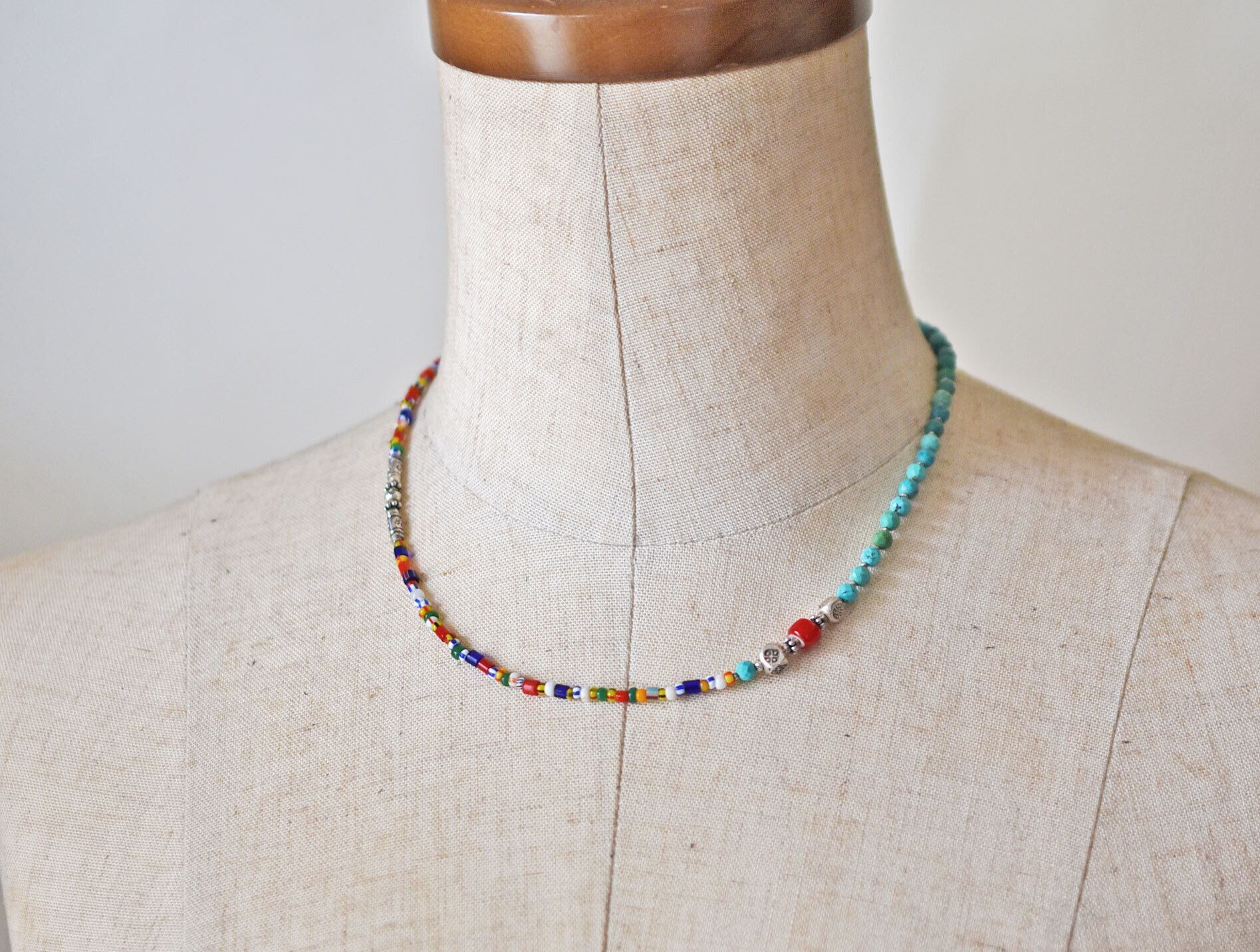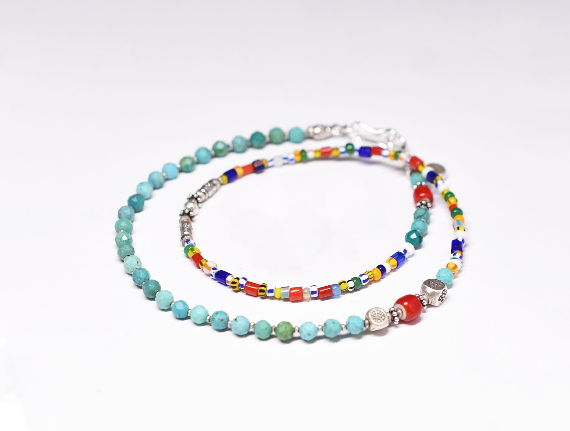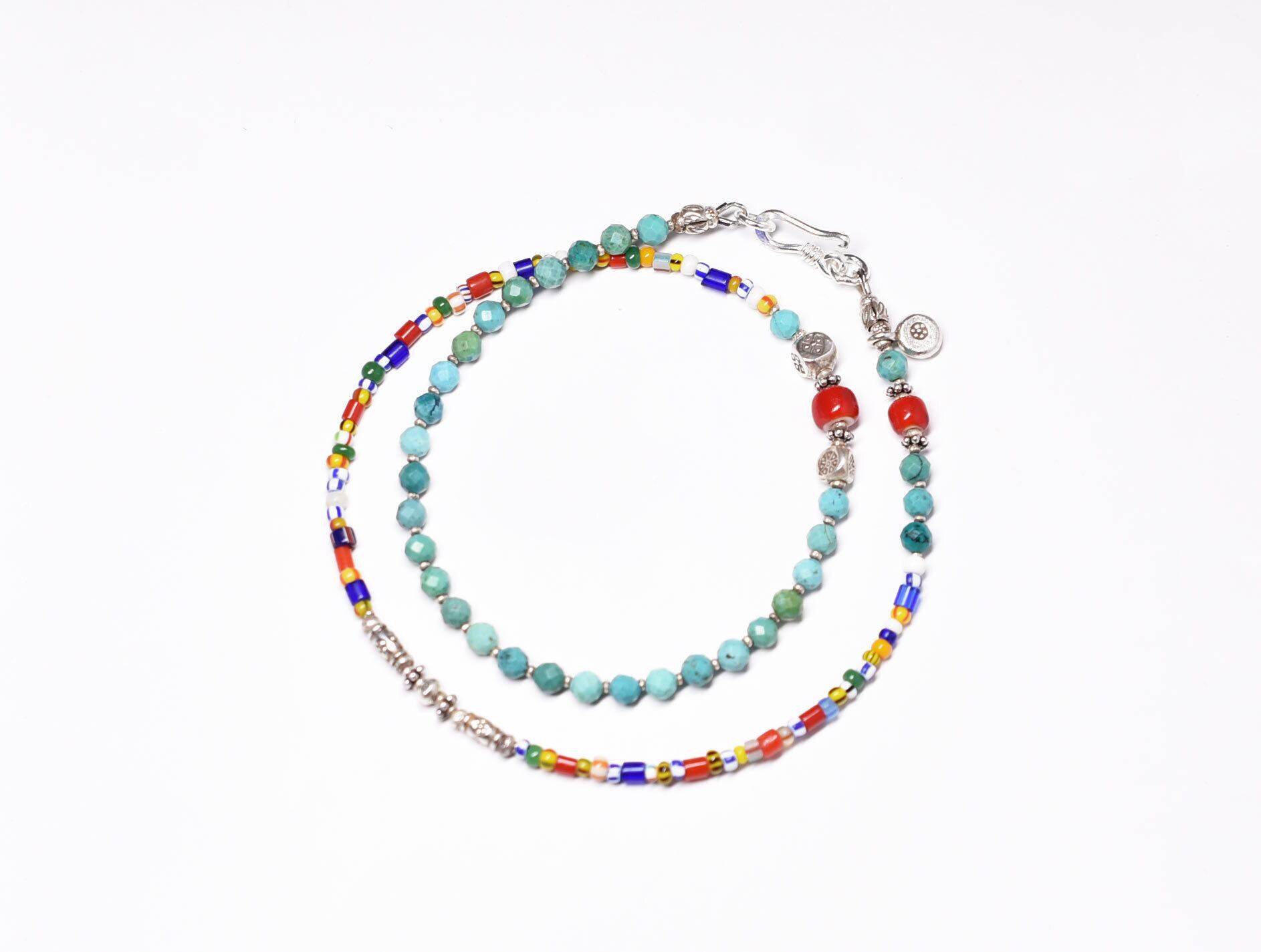 クリスマスビーズとターコイズ、ホワイトハーツ、カレンシルバーのカラフルネックレス