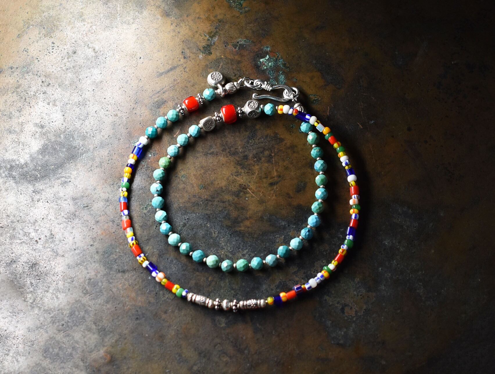 クリスマスビーズとターコイズ、カレンシルバーを繋いだカラフルなネックレスです。