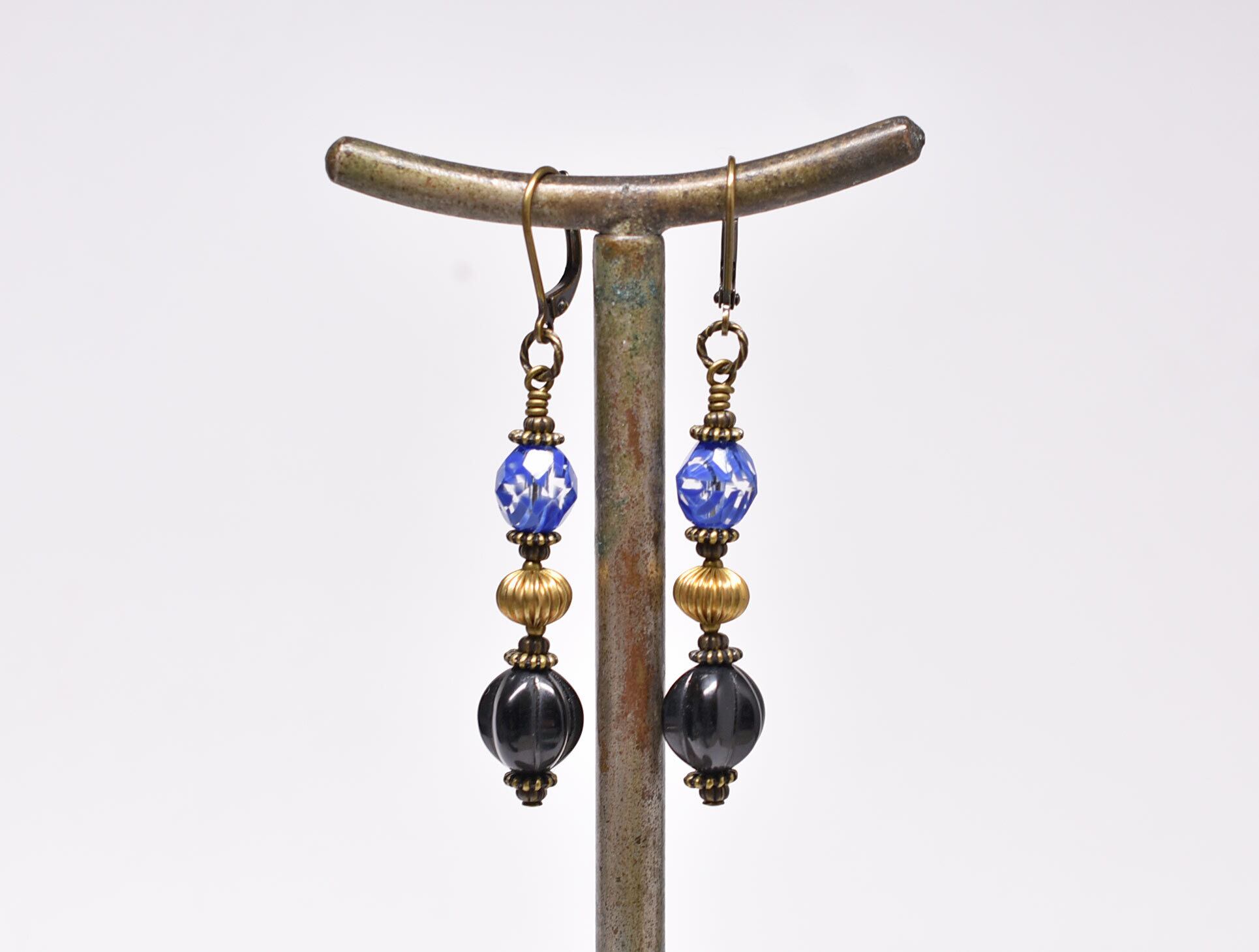 ストライプヴィンテージビーズと漆黒ビーズ、プックリブラスのピアス
