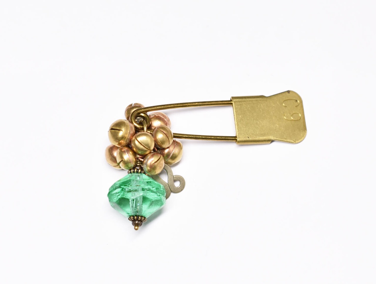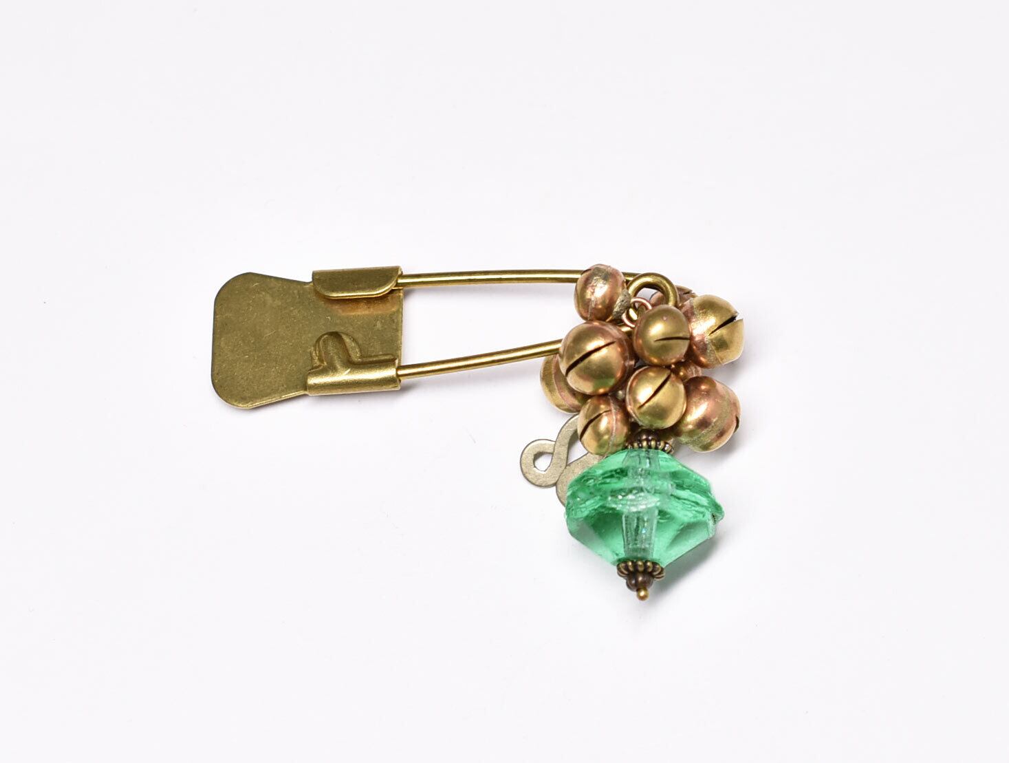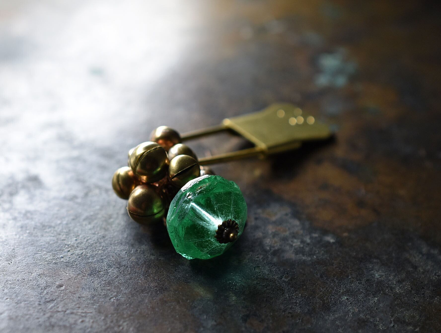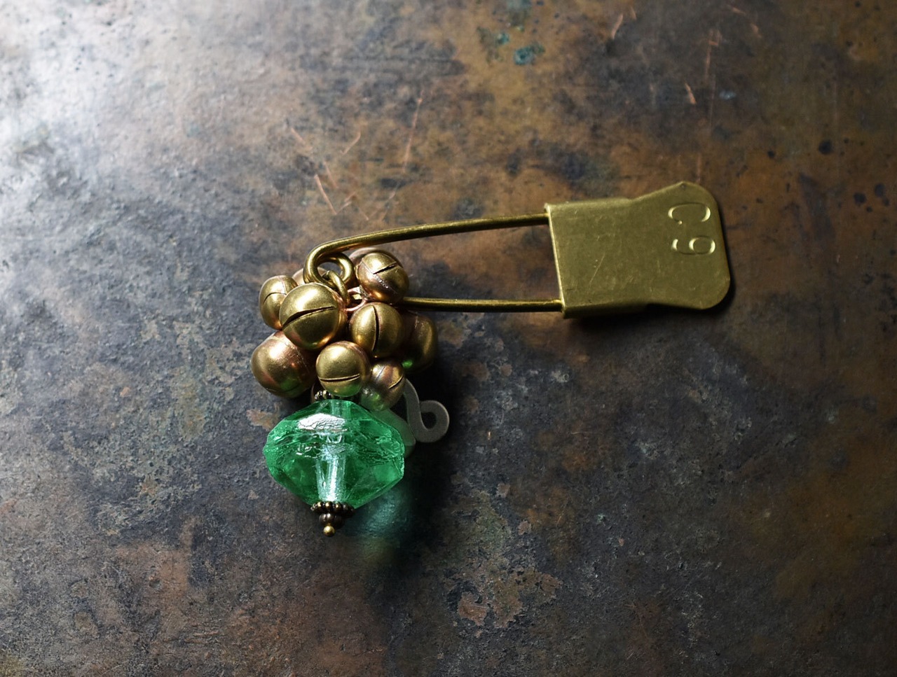 アンティークウランガラス、たわわな鈴、ズアフガニスタンのメタルパーツを繋いだランドリーピンブローチです