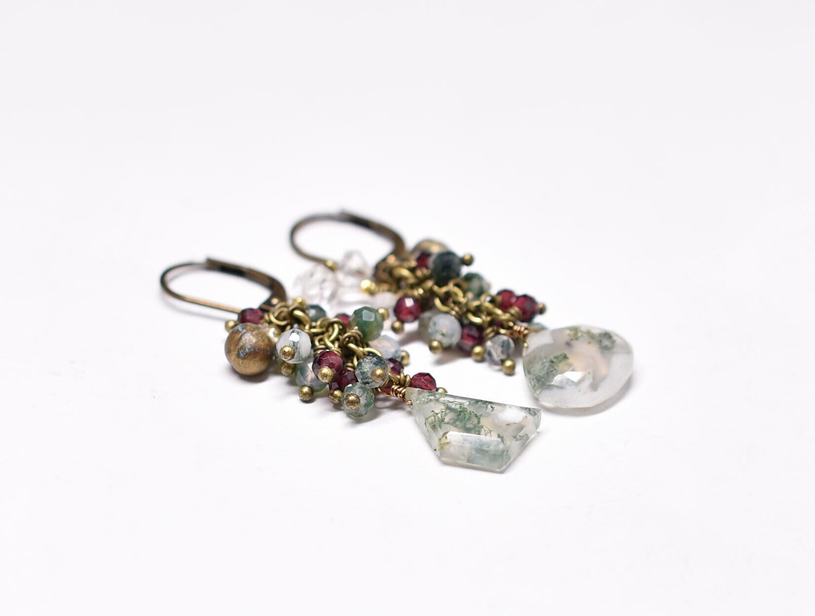 モスアゲートとピーコッククォーツ、たわわなガーネット、ハーキマーダイヤモンド、民族鈴のピアス
