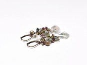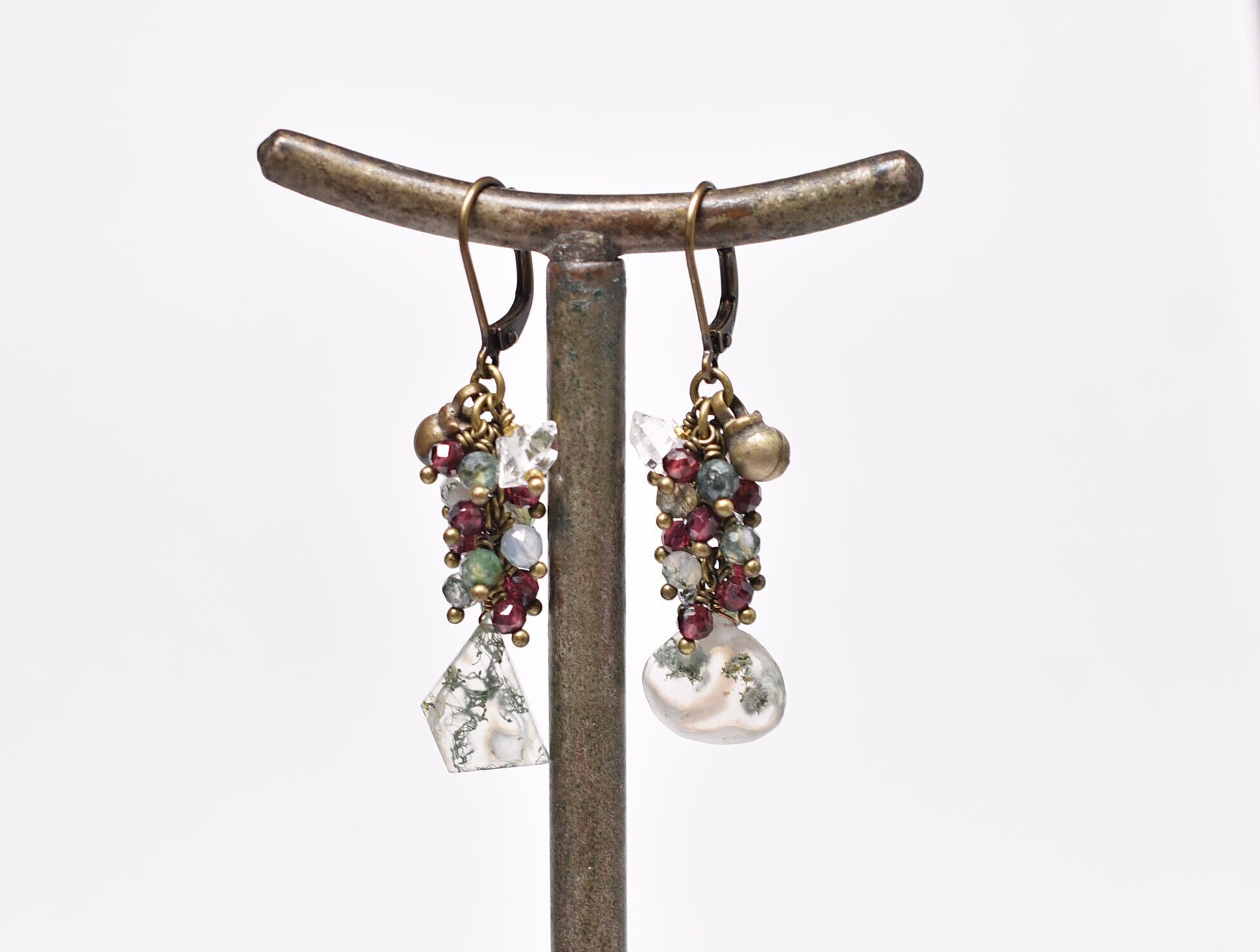 モスアゲートとピーコッククォーツ、たわわなガーネット、ハーキマーダイヤモンド、民族鈴を繋いだピアスです。