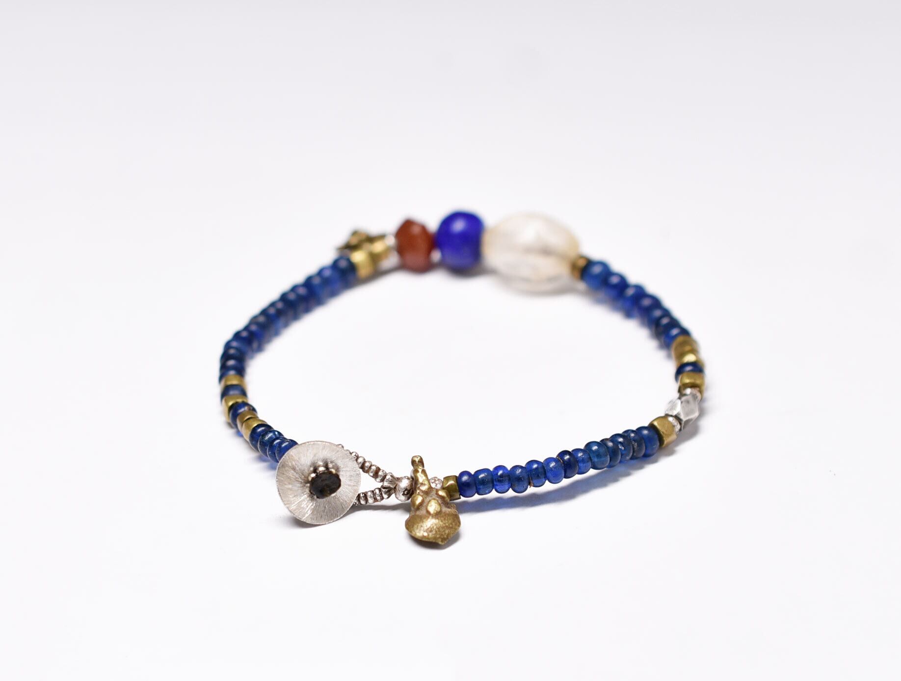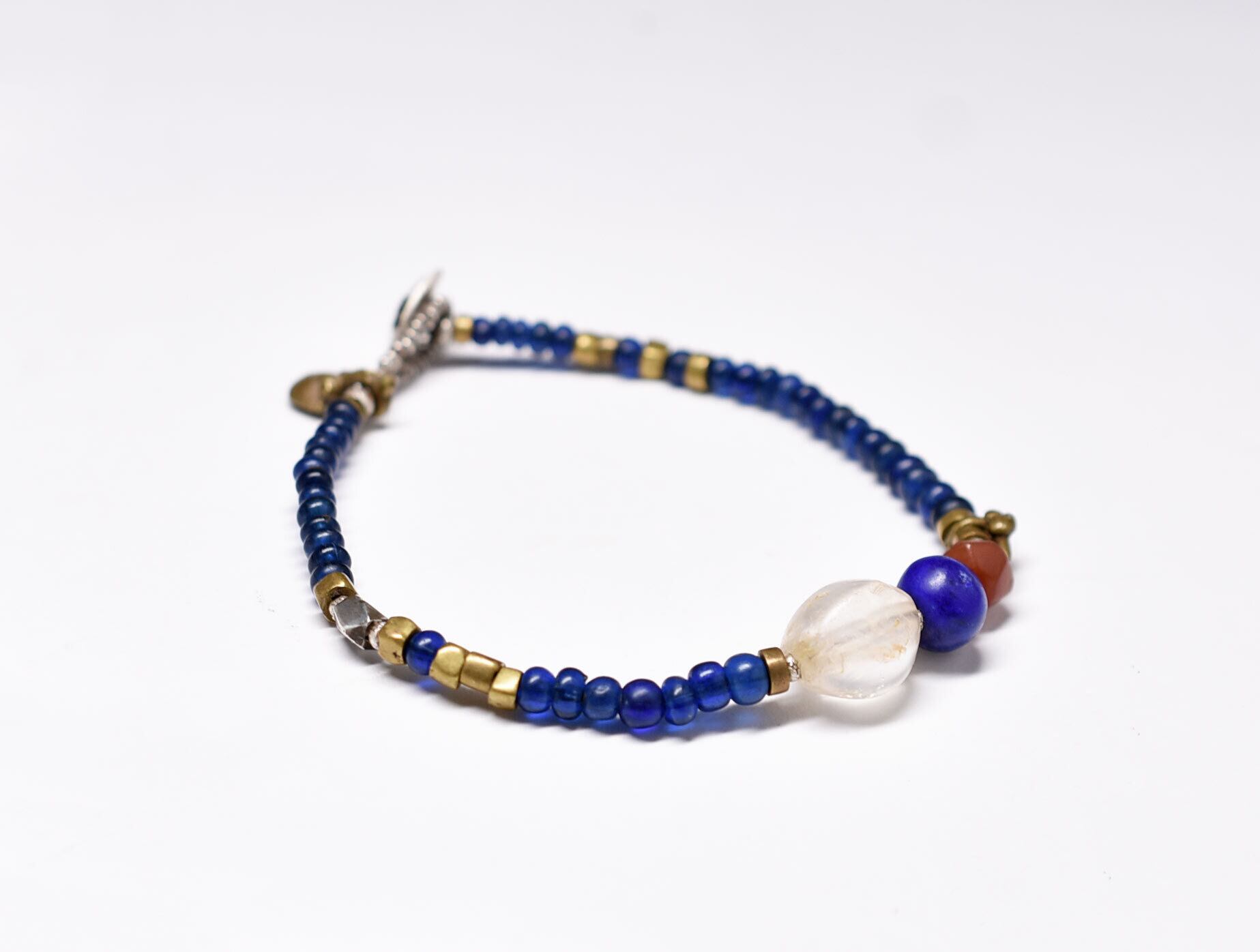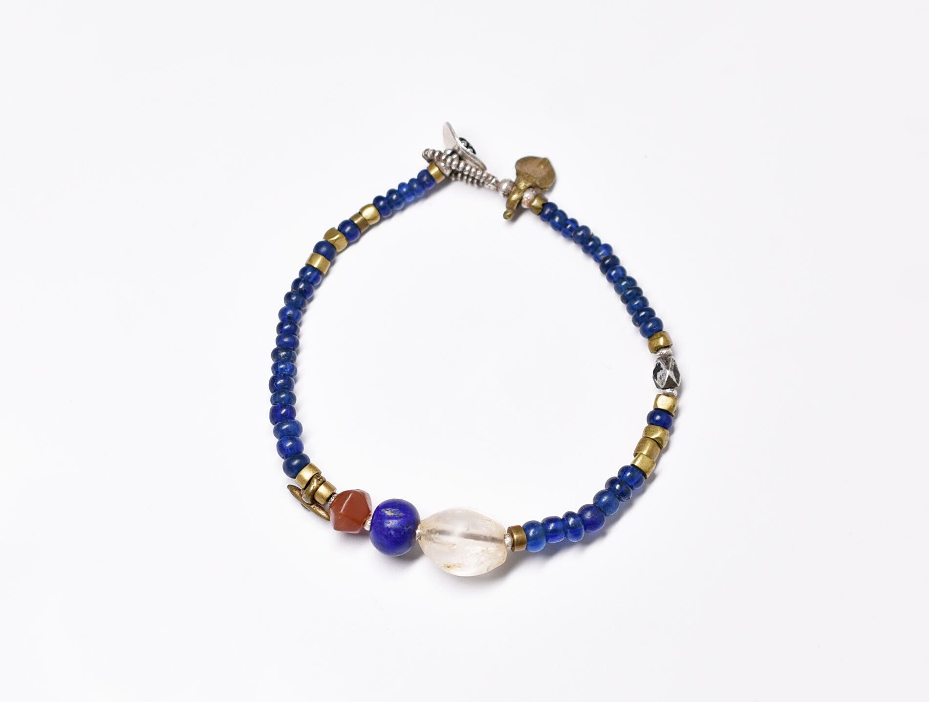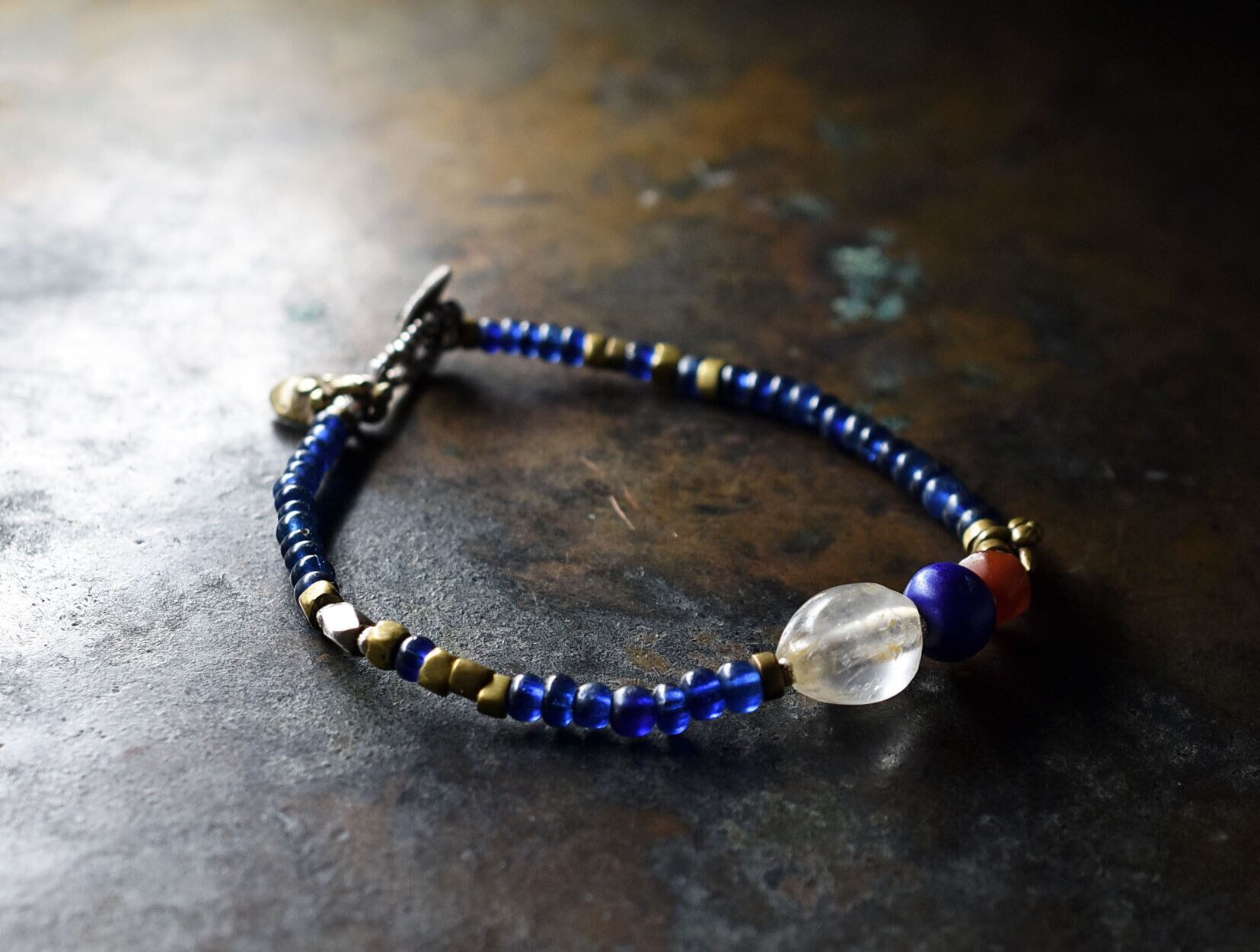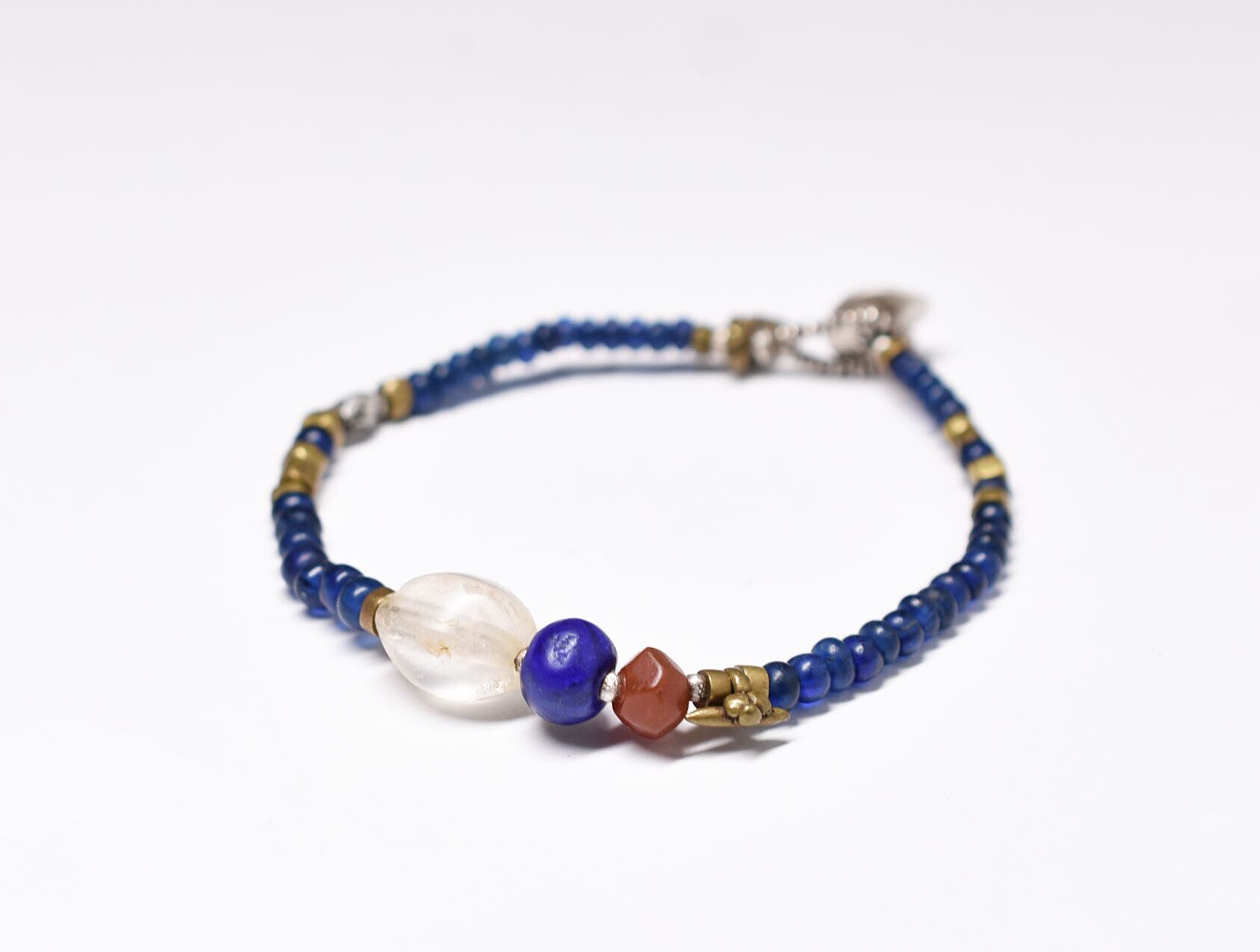古代水晶と古代ラピス、古代カーネリアン、oldオリッサブラス&チンシルバー、ブルービーズを繋いだブレスです。