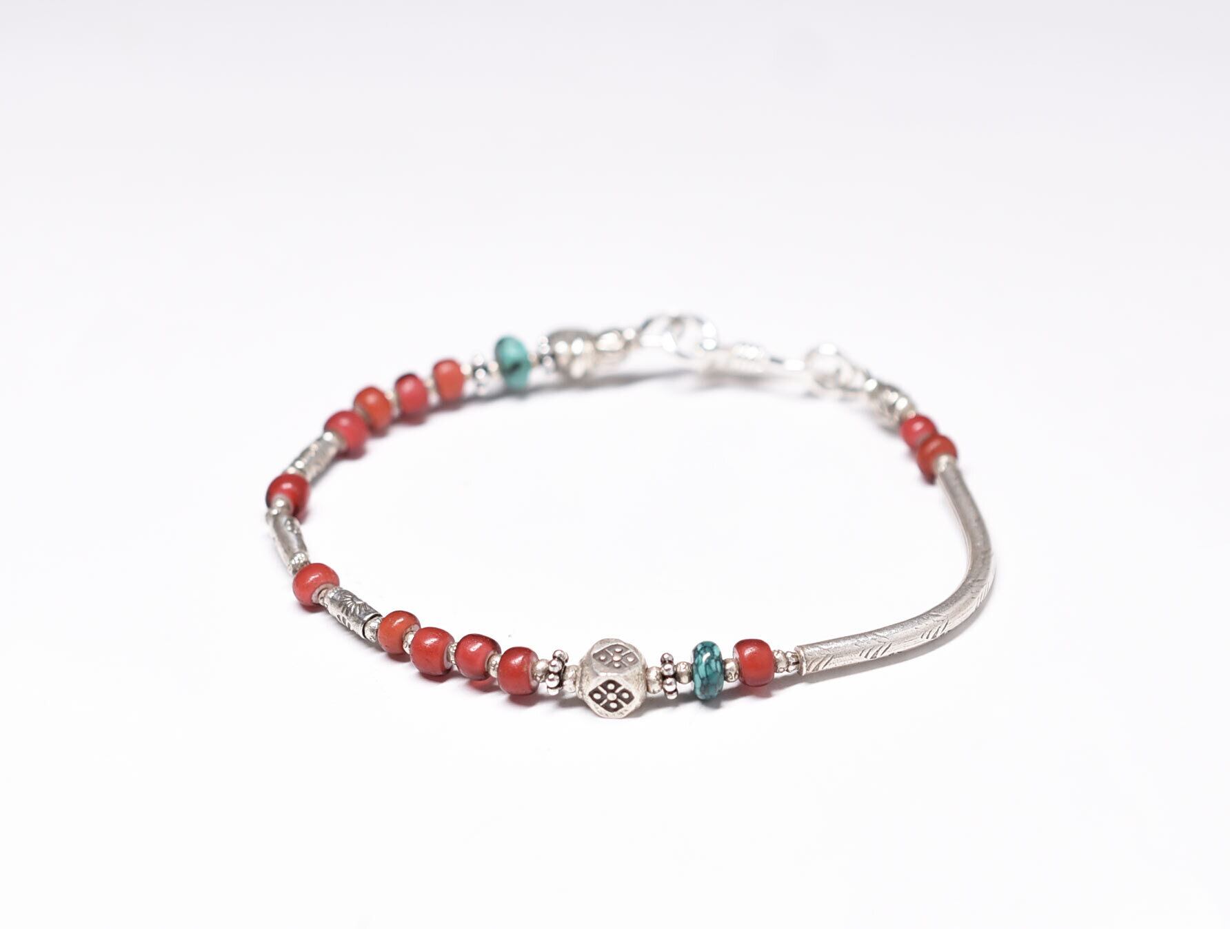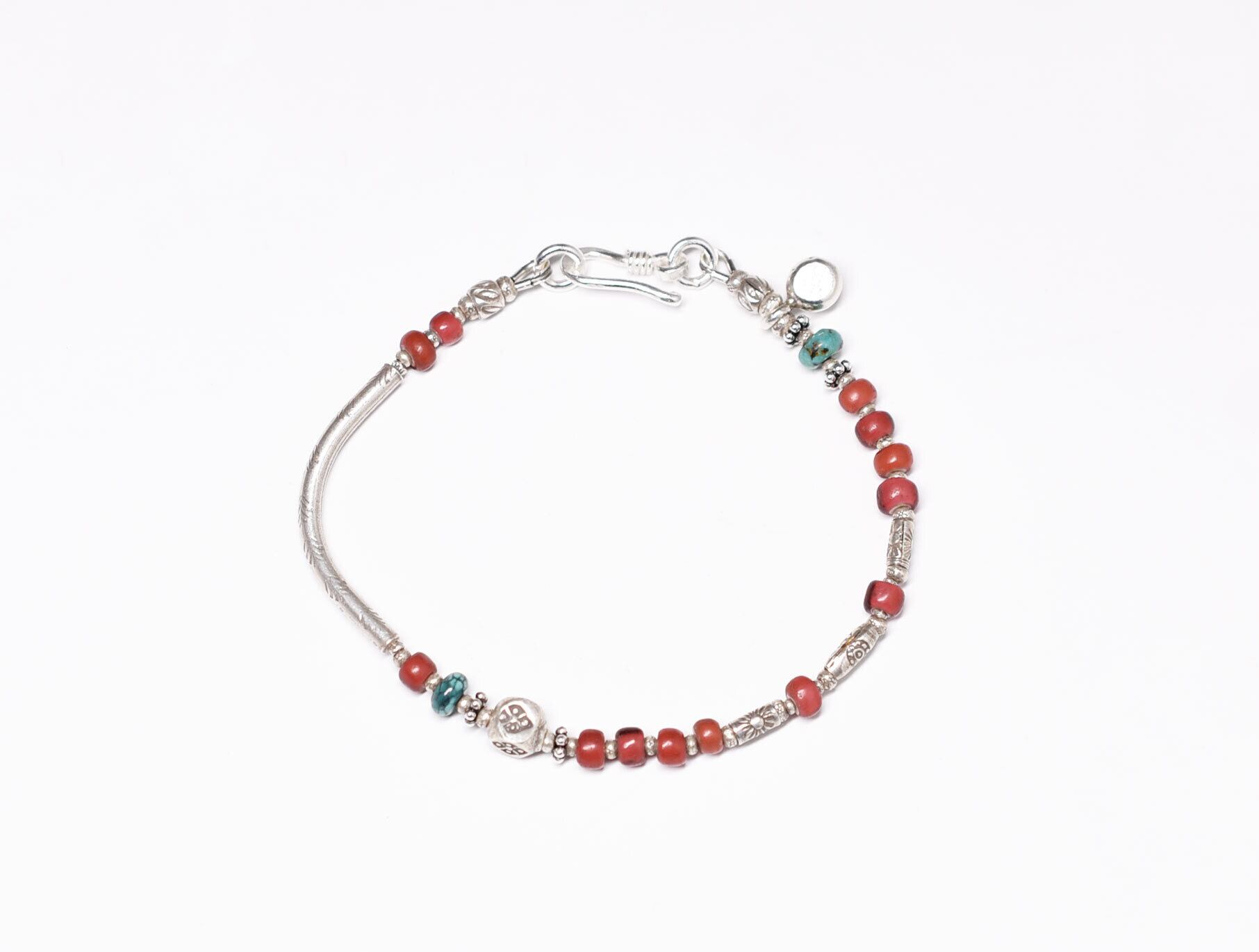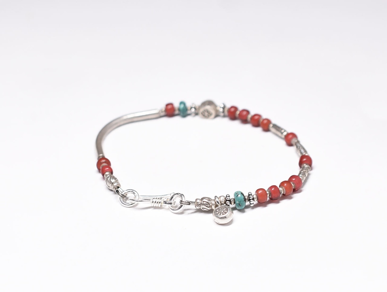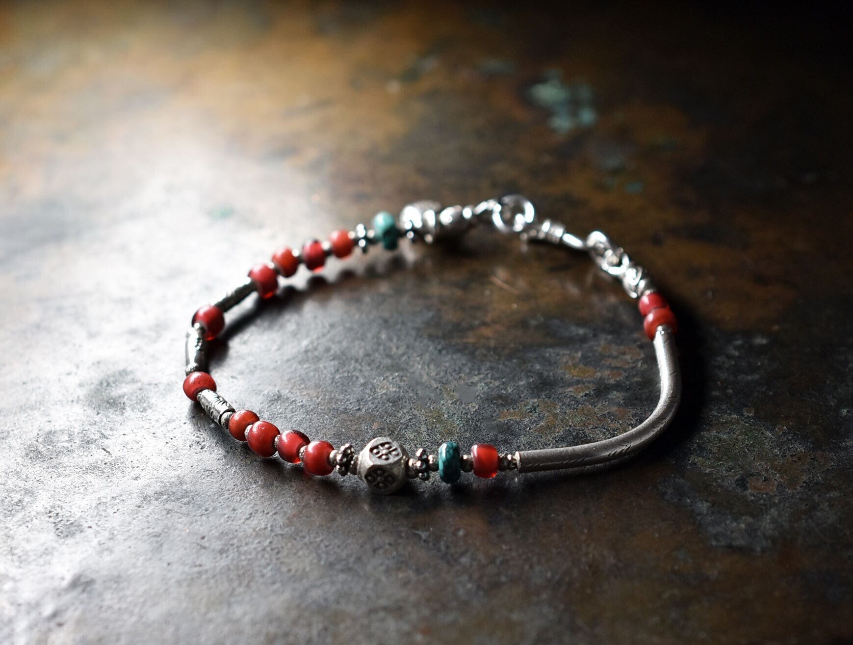 カレンシルバーと金赤ホワイトハーツ、チベタンターコイズを繋いだブレスです。