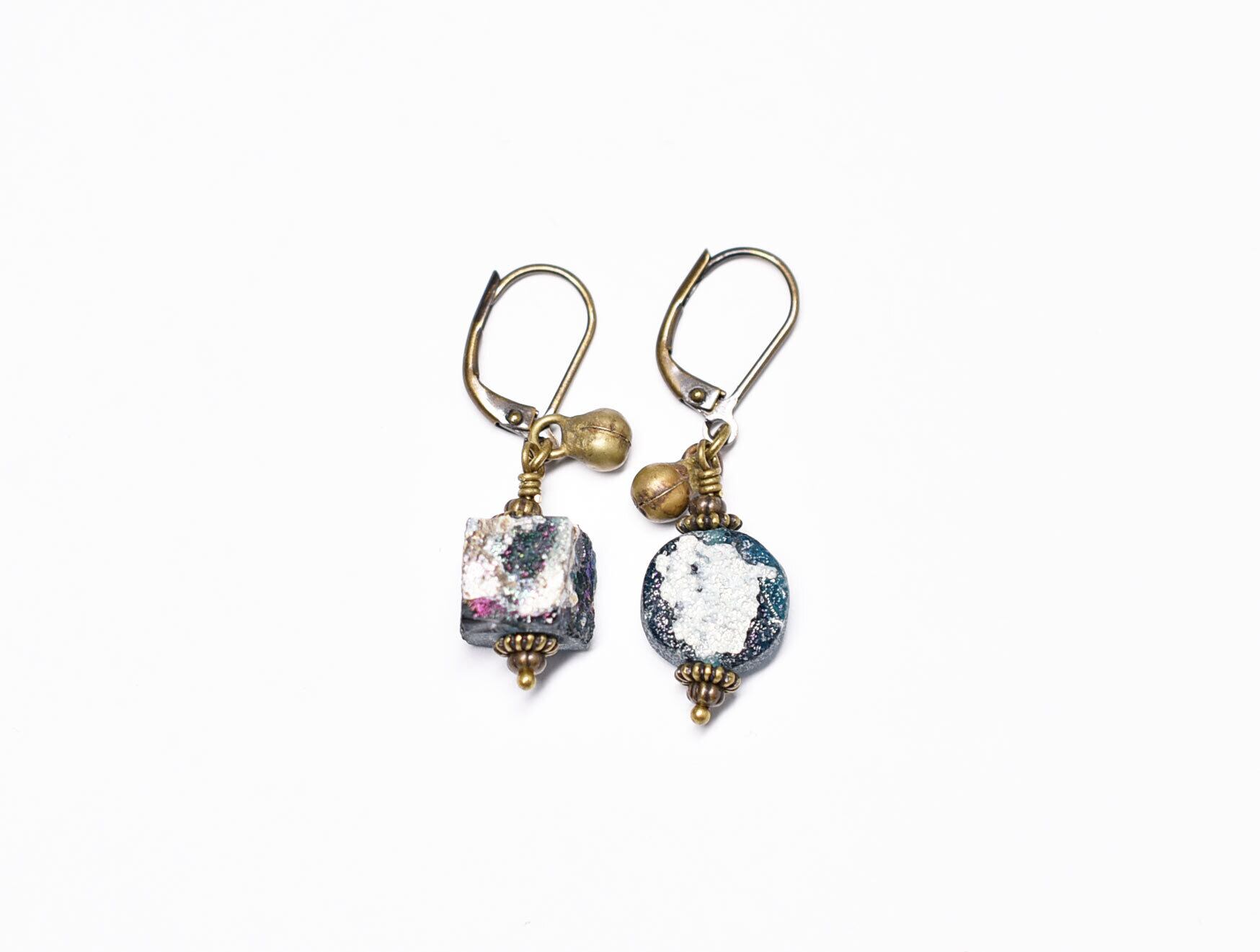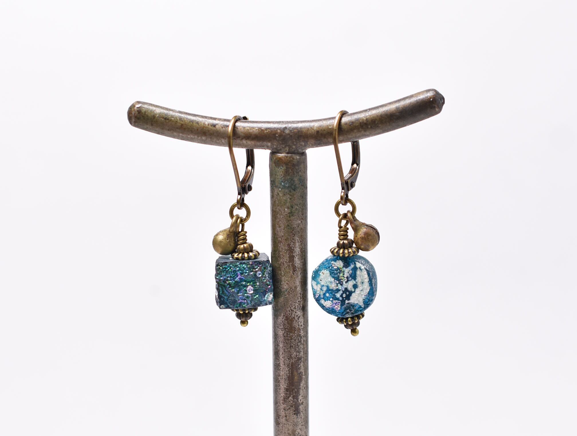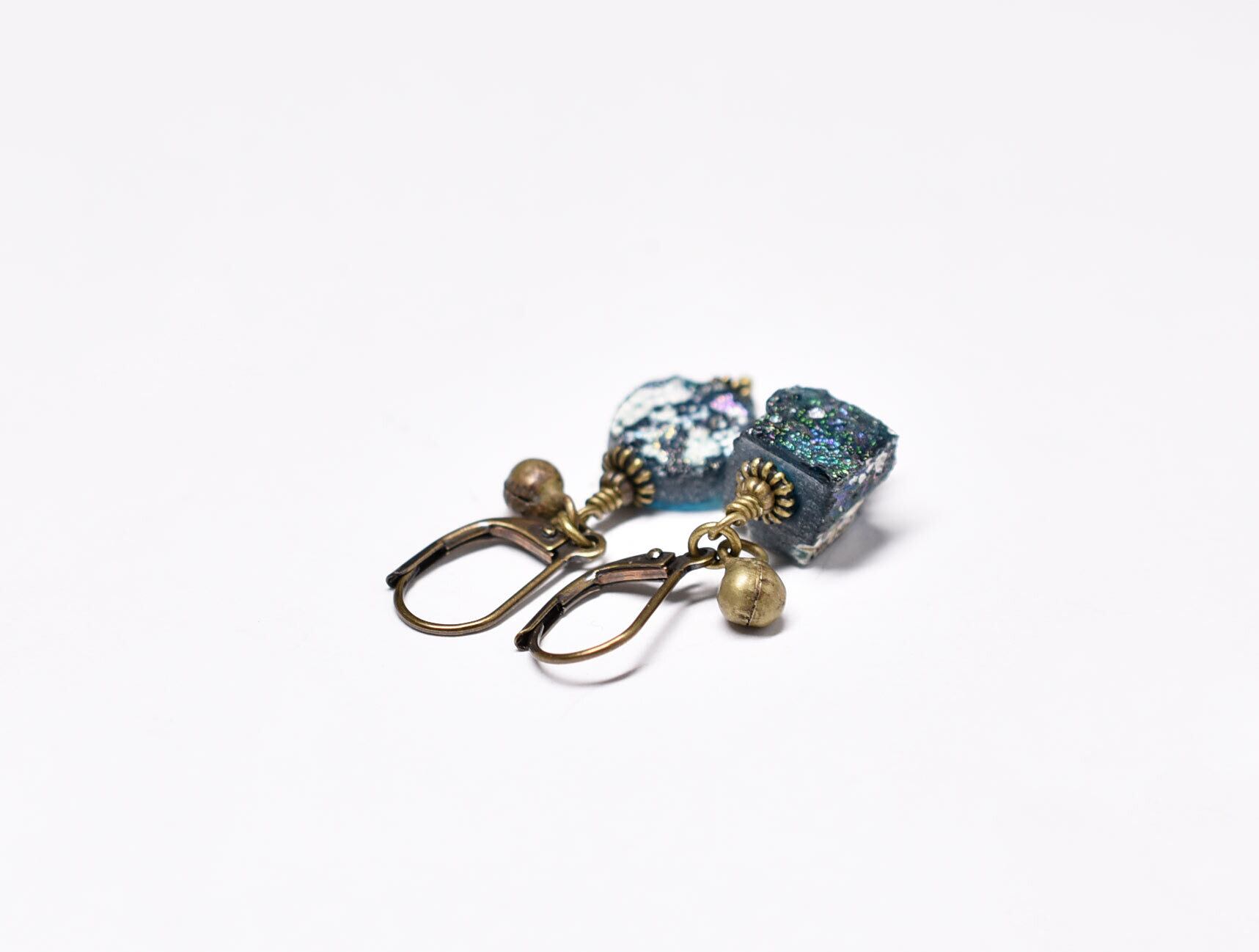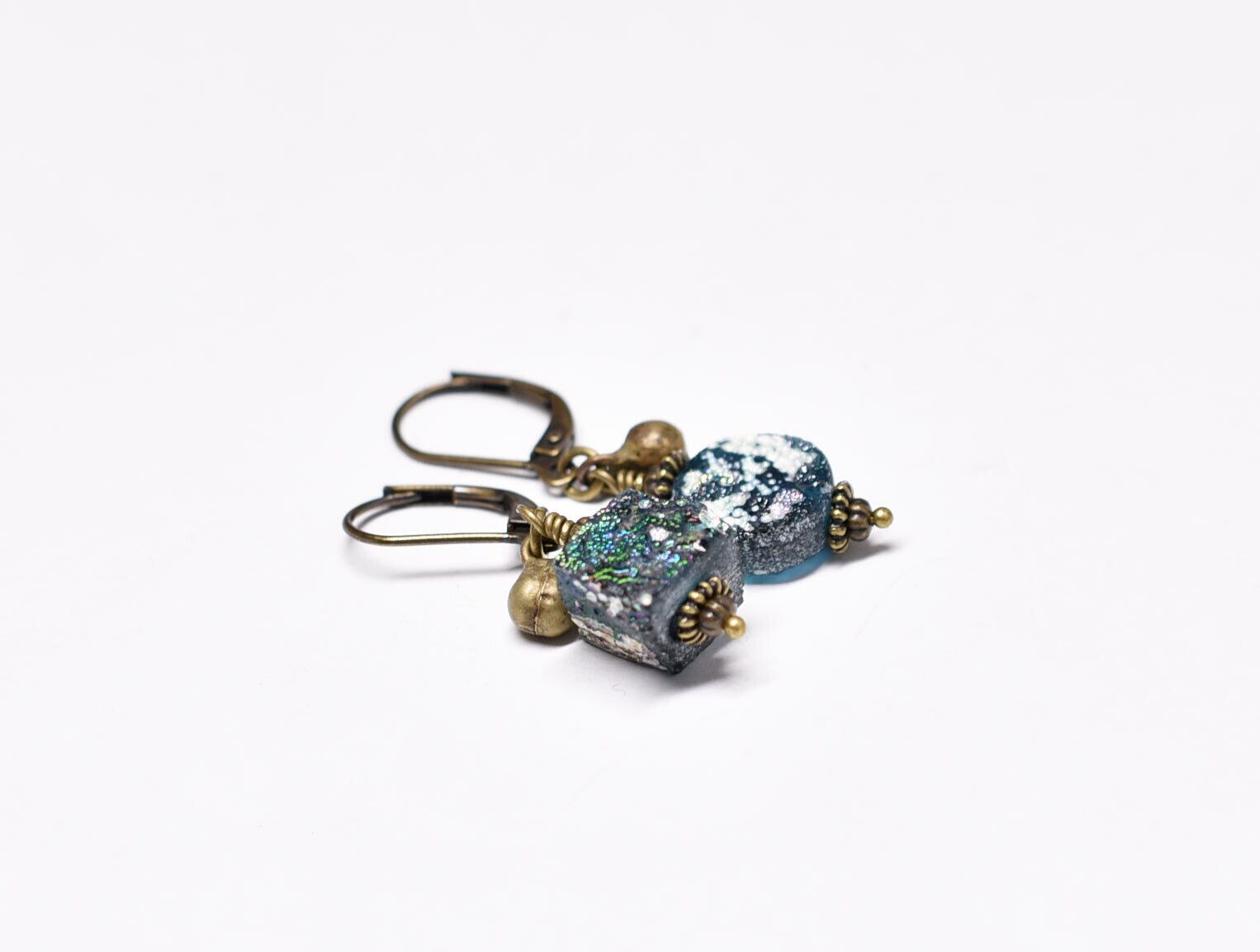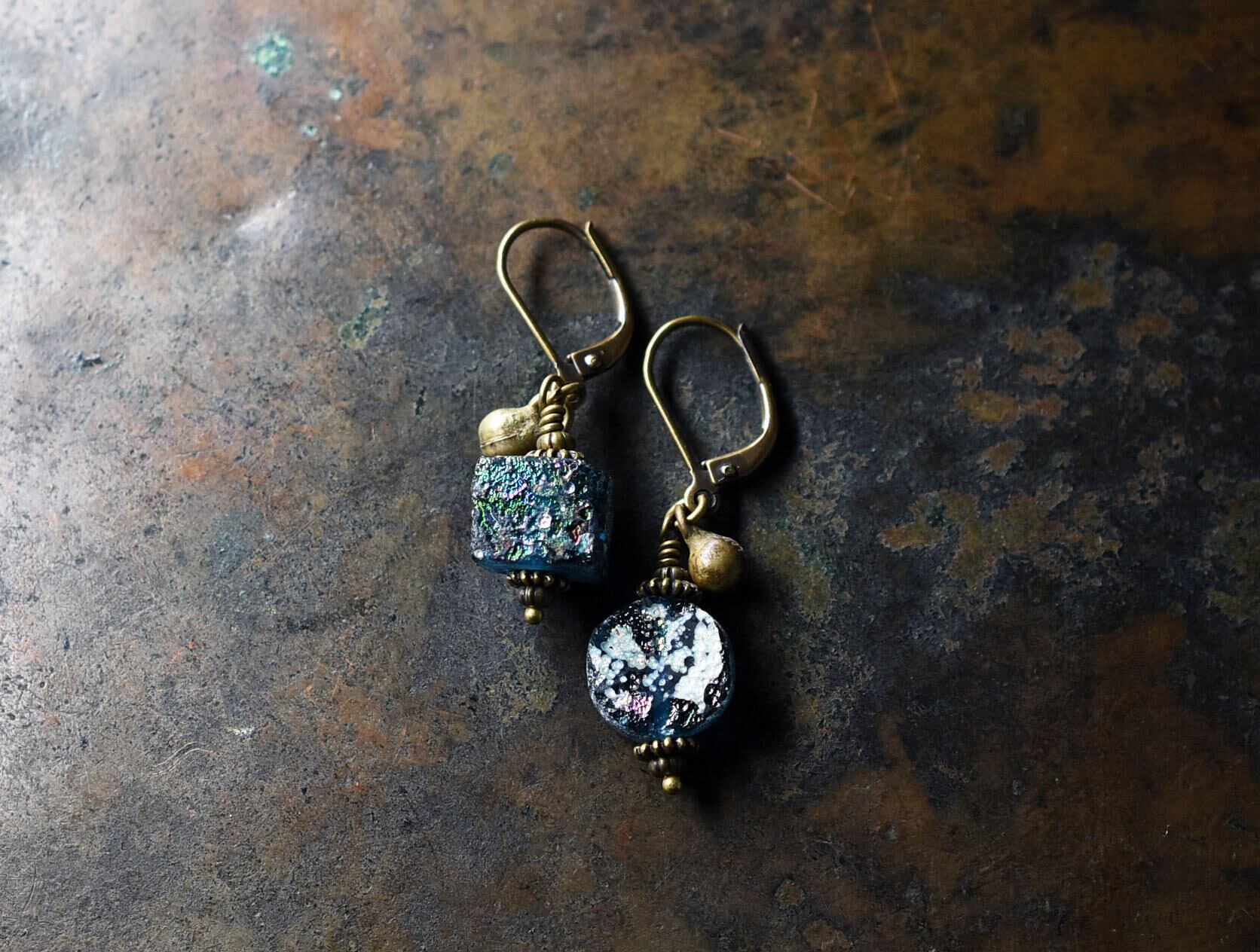 スクエア&ラウンド型銀化ローマングラスと民族鈴を繋いだやや小さめなピアスです。
