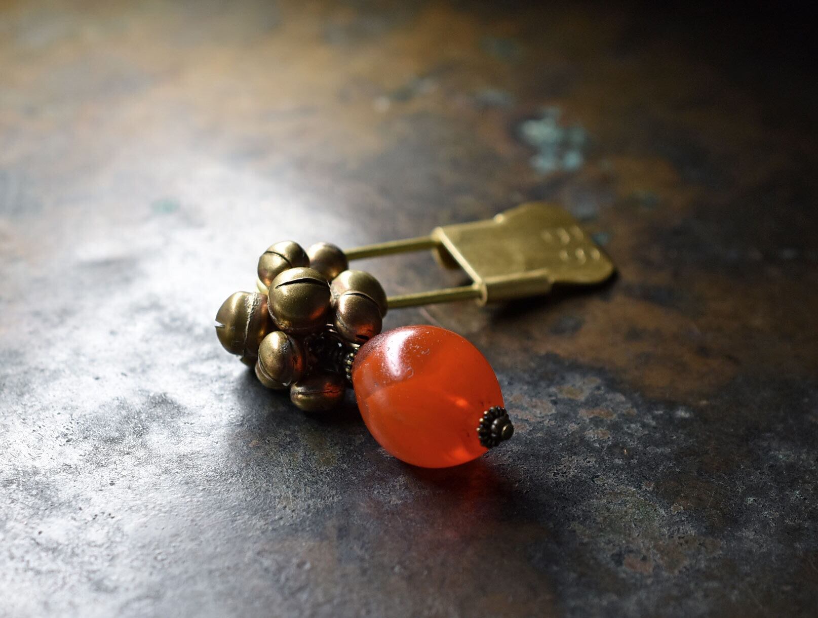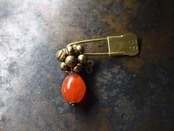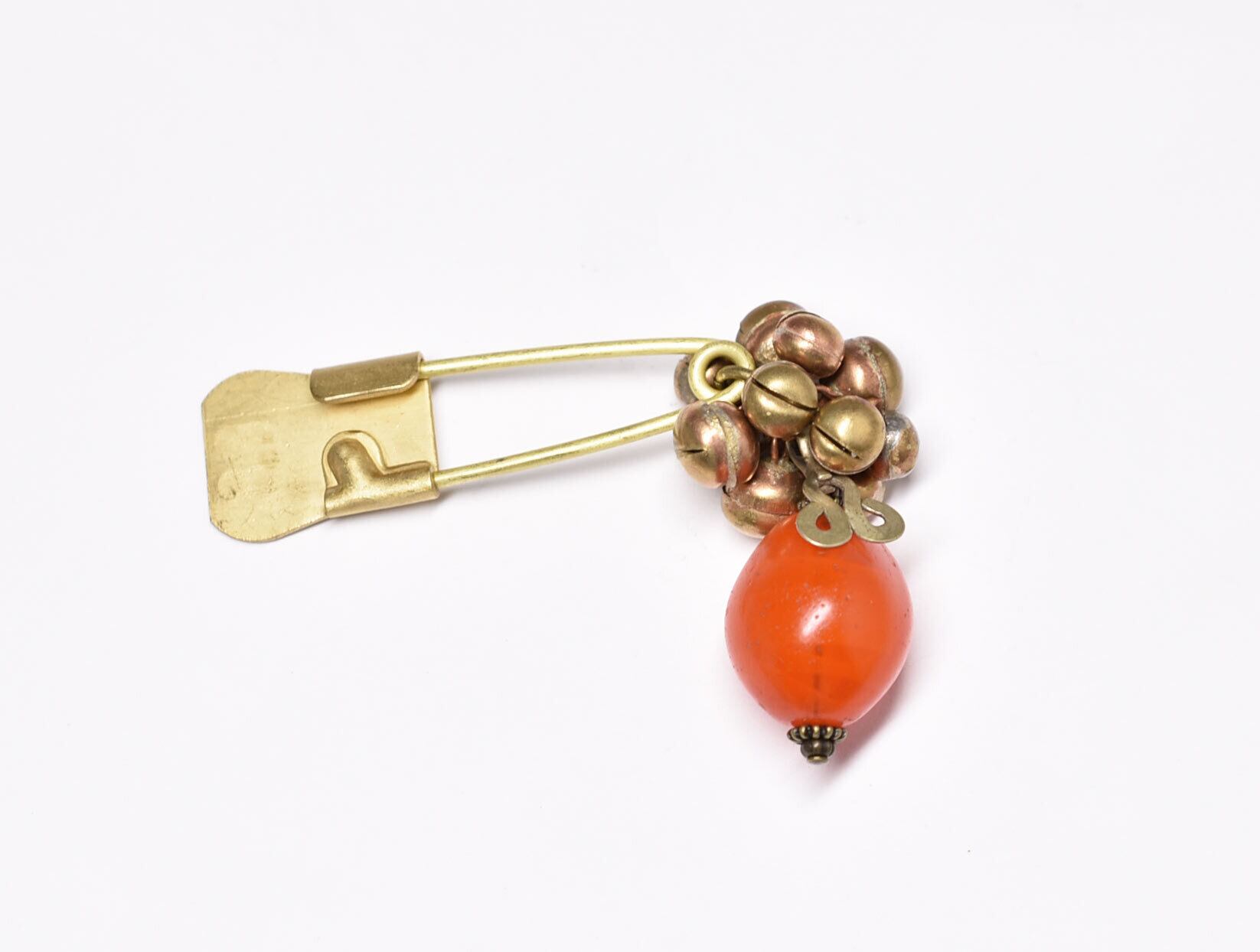 オレンジ色のエチオピアンチェリー、たわわな鈴、ズアフガニスタンのメタルパーツを繋いだランドリーピンブローチです
