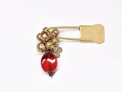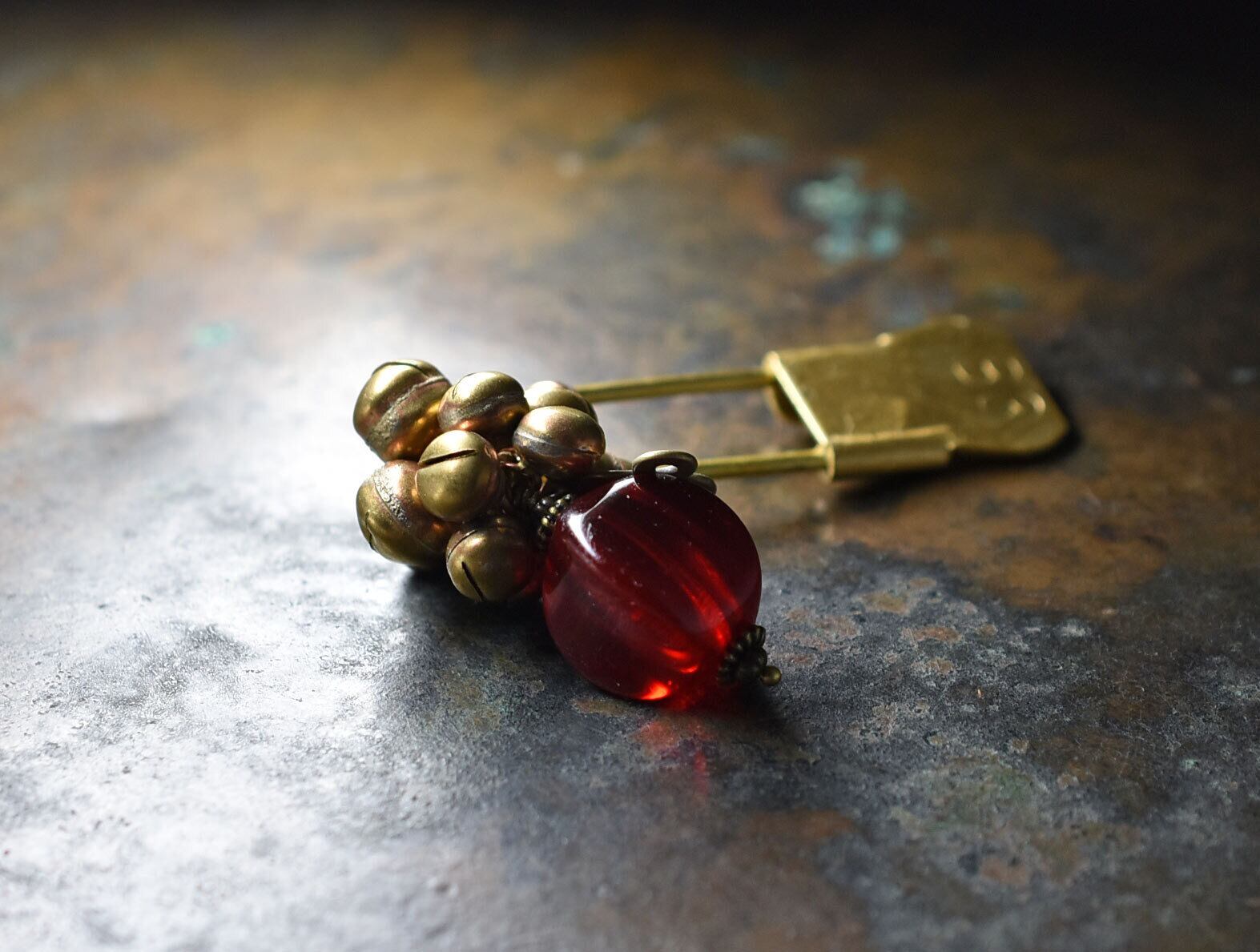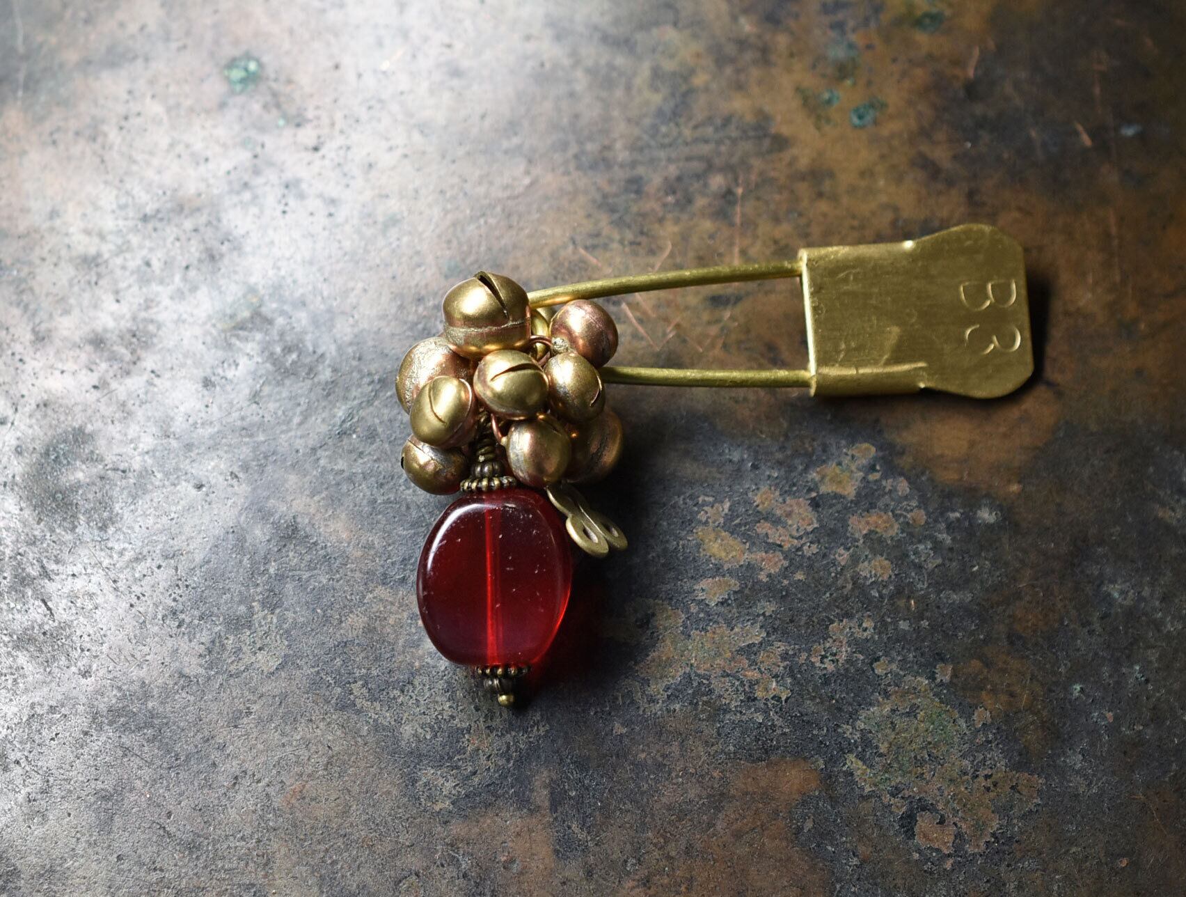 深紅のボヘミアアンティークビーズ、たわわな鈴、ズアフガニスタンのメタルパーツを繋いだランドリーピンブローチです
