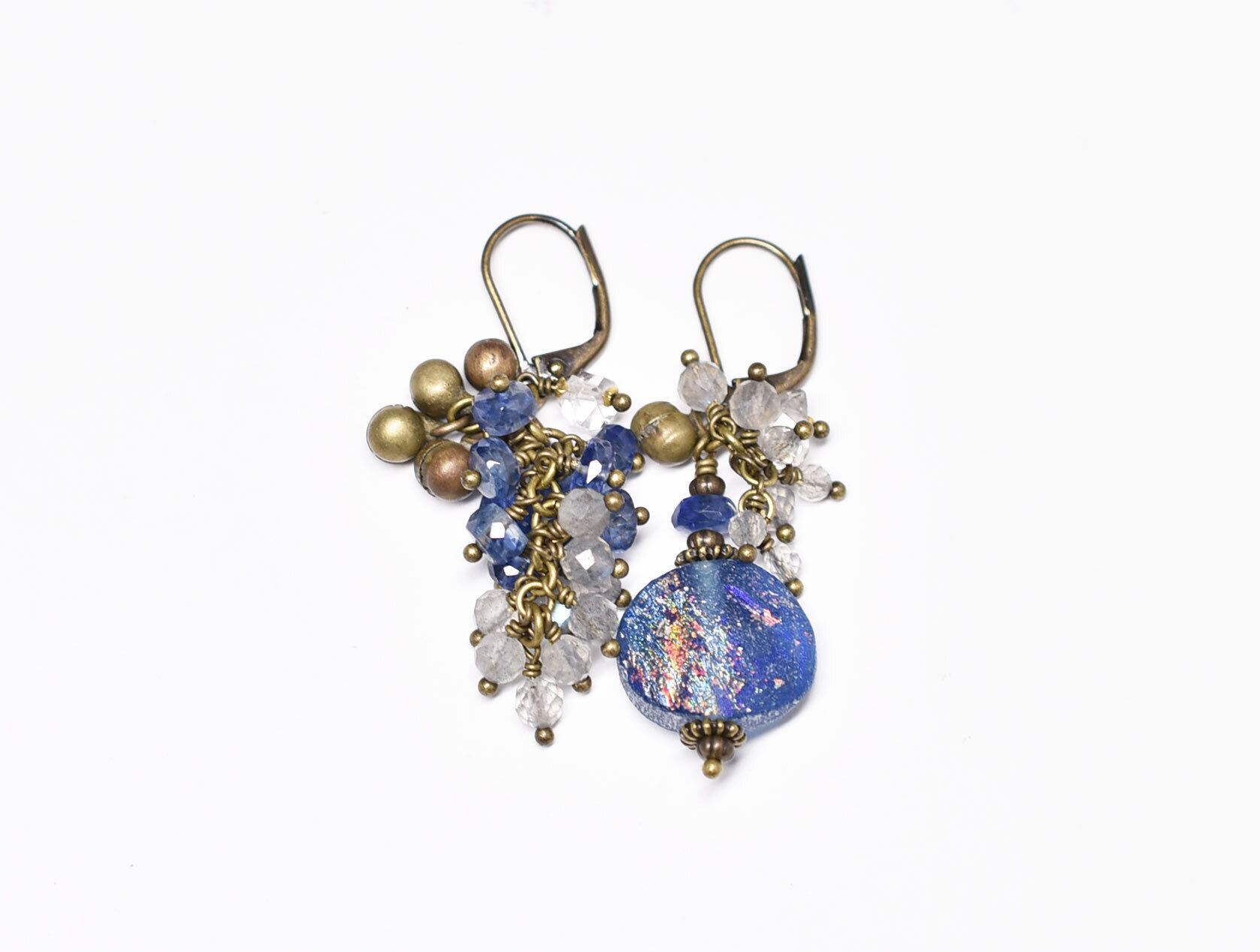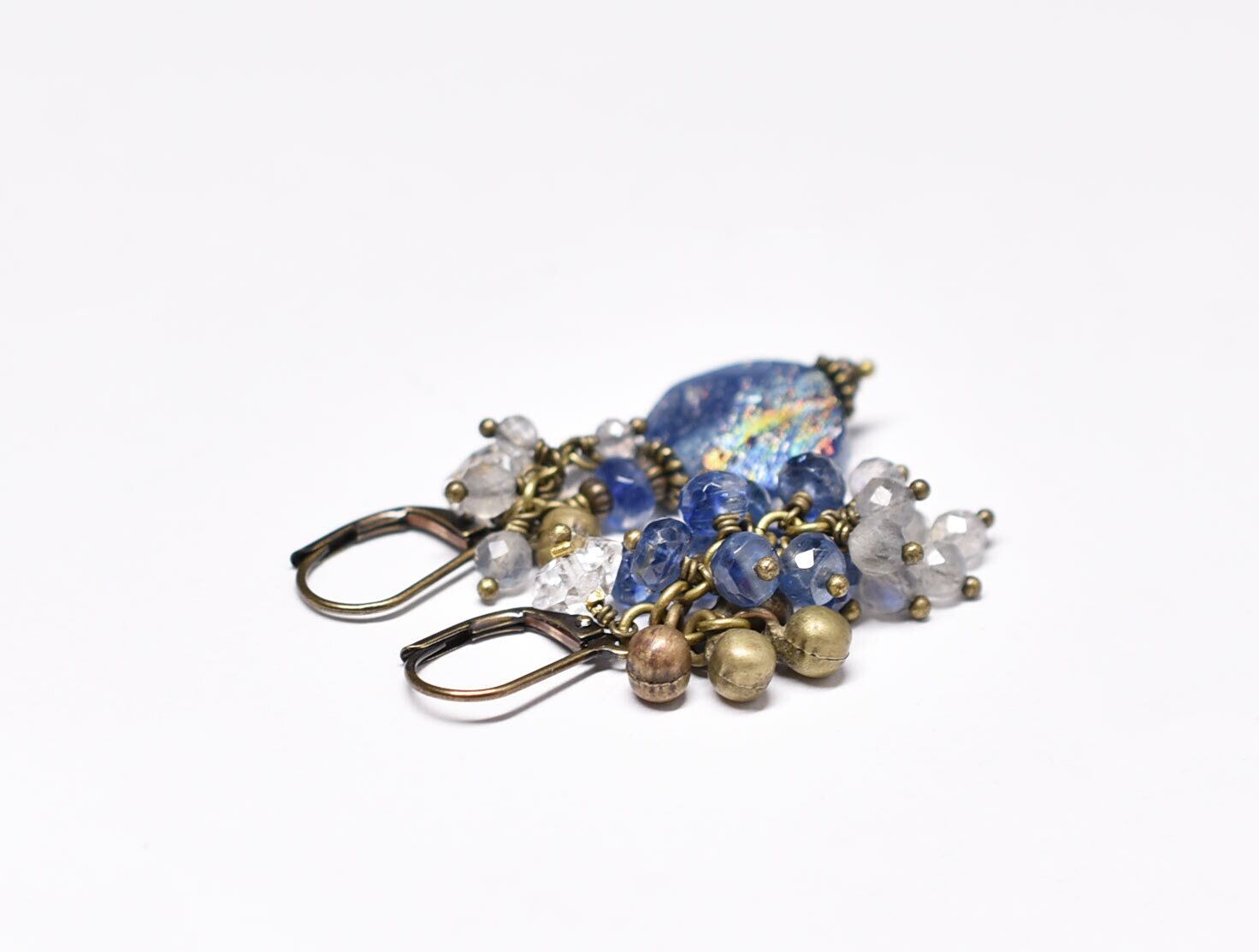 スカイブルー銀化ローマングラスとカイヤナイト、ラブラドライト、ハーキマーダイヤモンド、民族鈴のアンシメトリーピアス