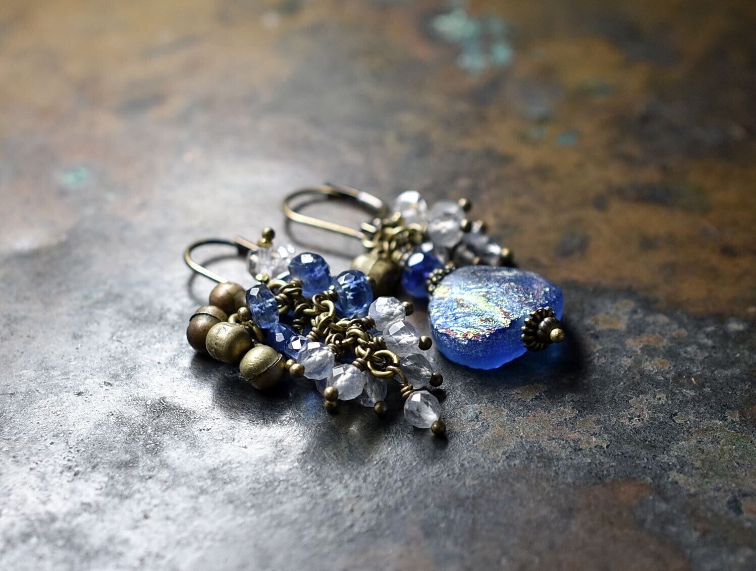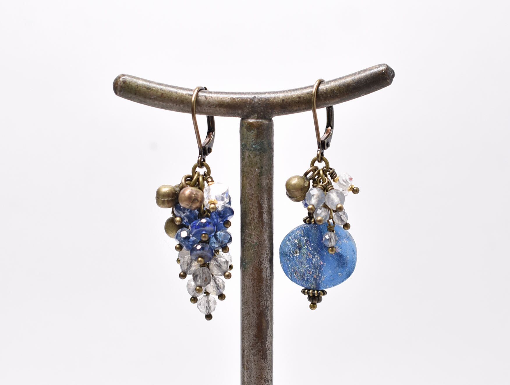 天然石と古代ガラス、古メタルがの組み合わせが退廃美を奏でるピアスです。