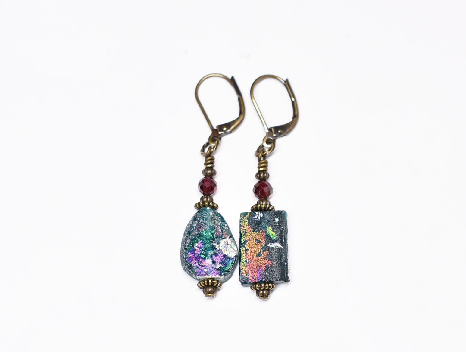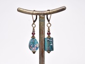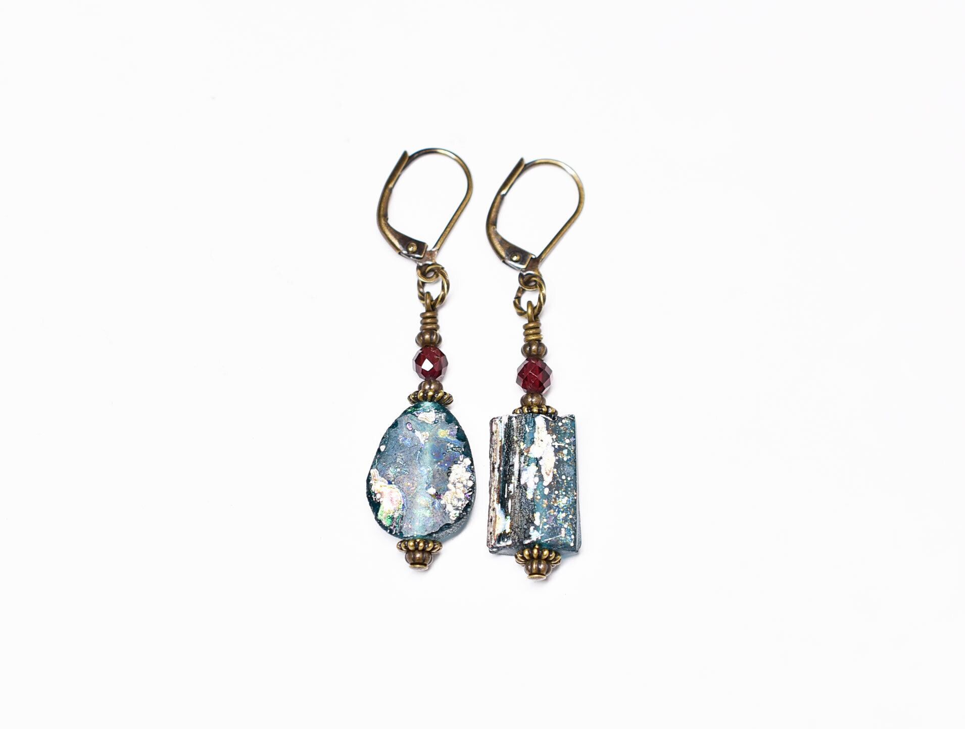雫&スクエア型銀化ローマングラスとガーネットのピアス