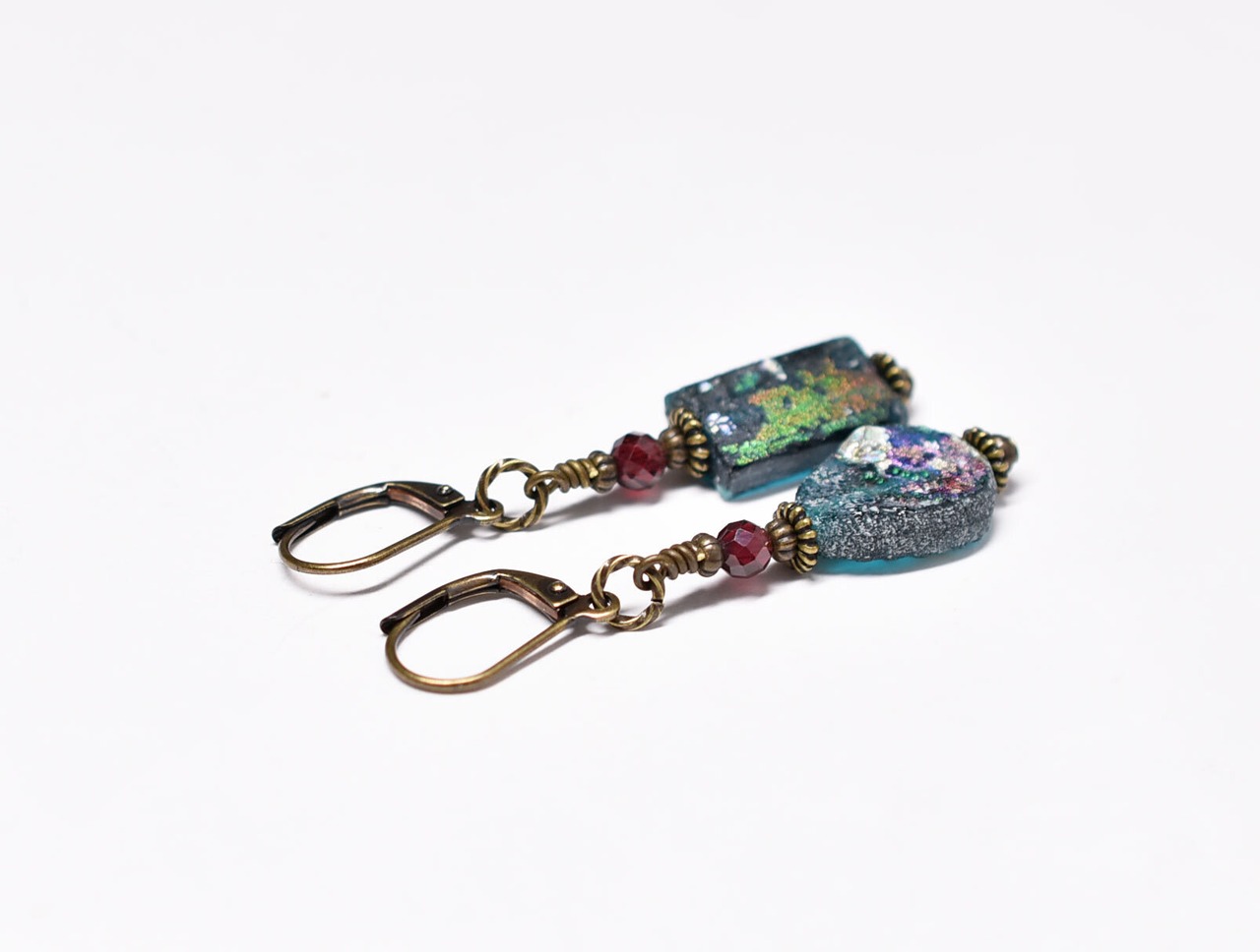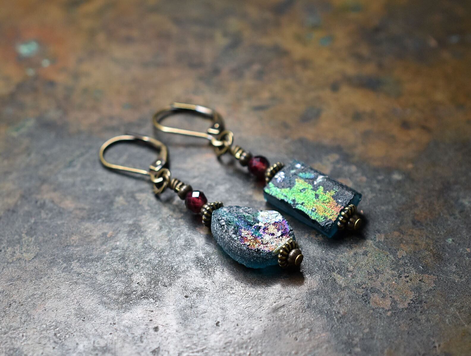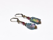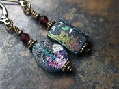 雫&スクエア型銀化ローマングラスとガーネットを繋いだピアスです。