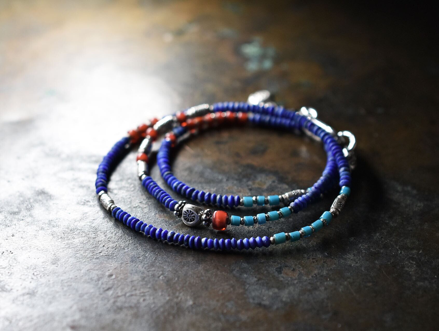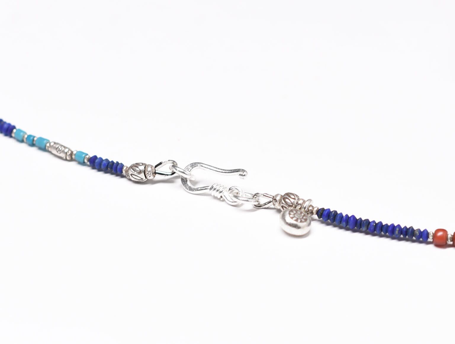 ラピスとターコイズブルーと金赤ホワイトハーツ 、カレンシルバーを繋いだ華奢なネックレスです。