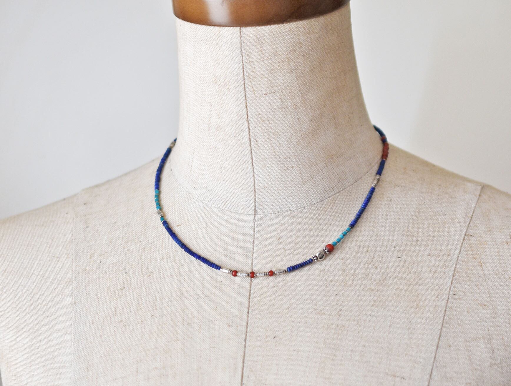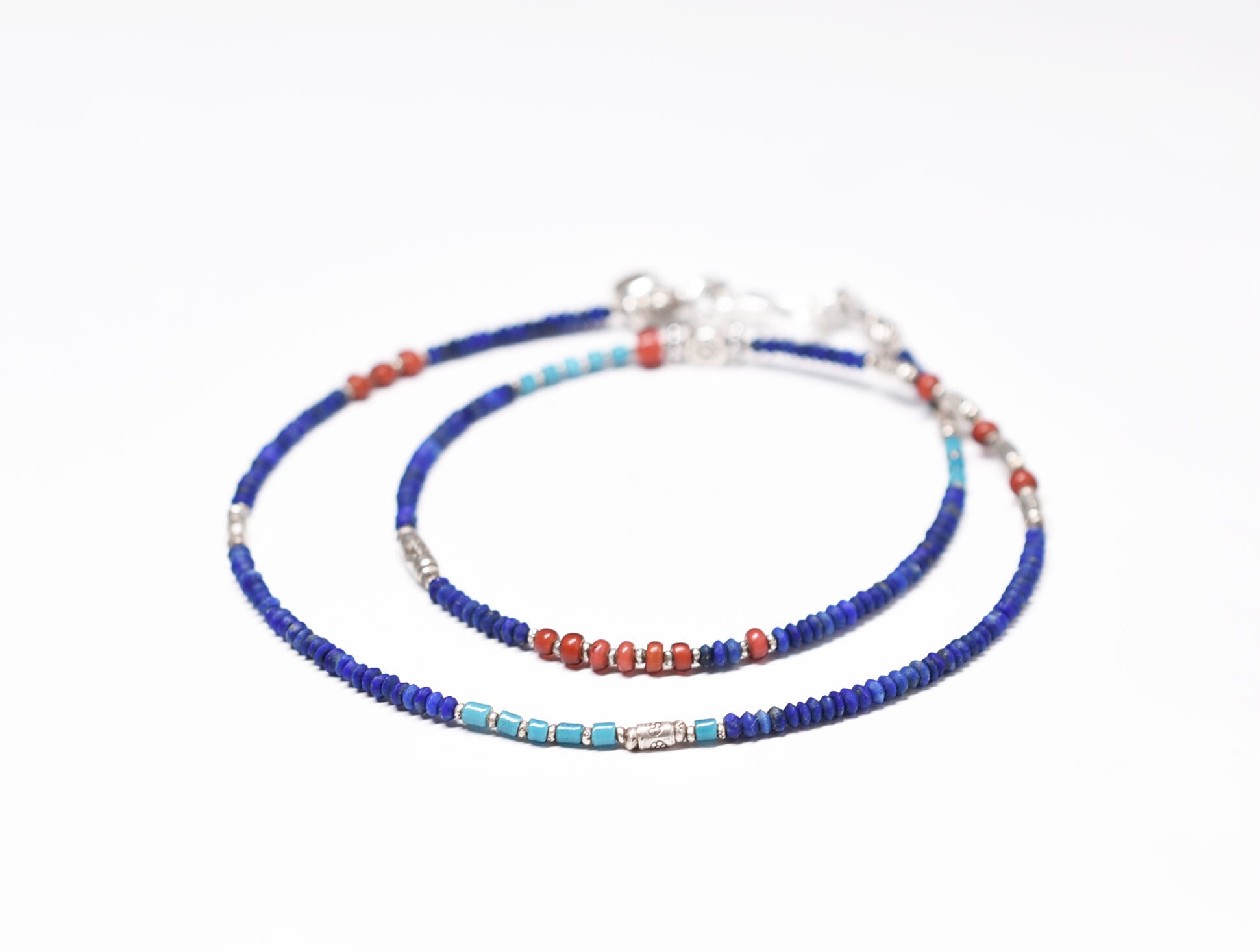 ラピスとターコイズブルー&金赤ホワイトハーツ 、カレンシルバーの華奢なネックレス